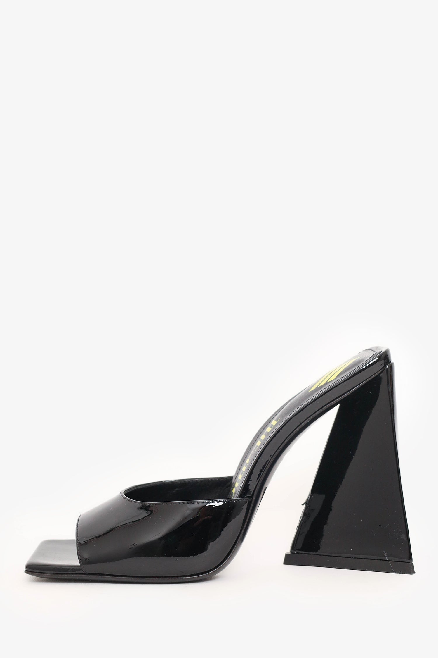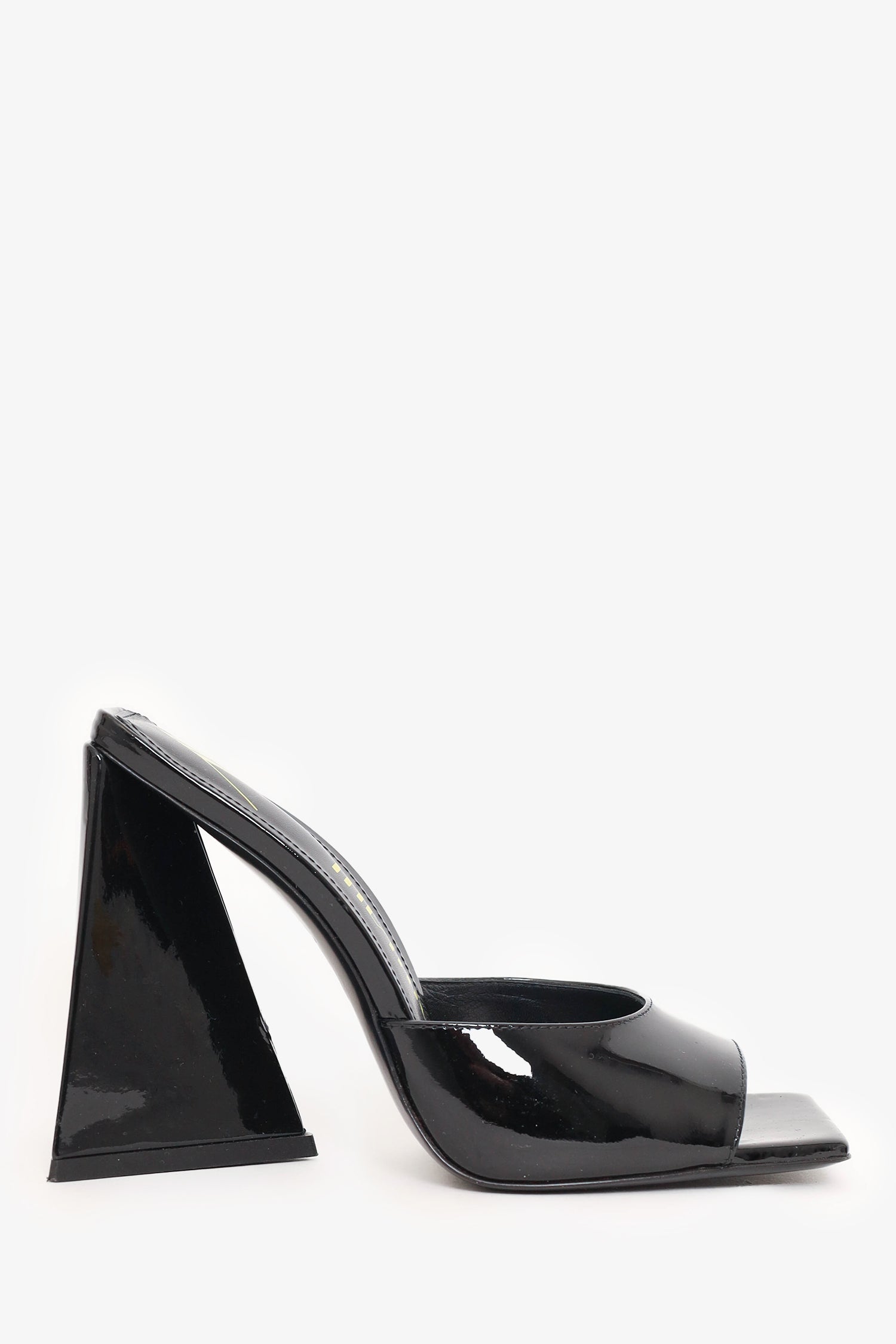 Refresh availabilityThe Attico Black Patent Leather 'Devon' Heels. Slip-on. Open square toe. Chunky triangle heel. Tonal stitching.