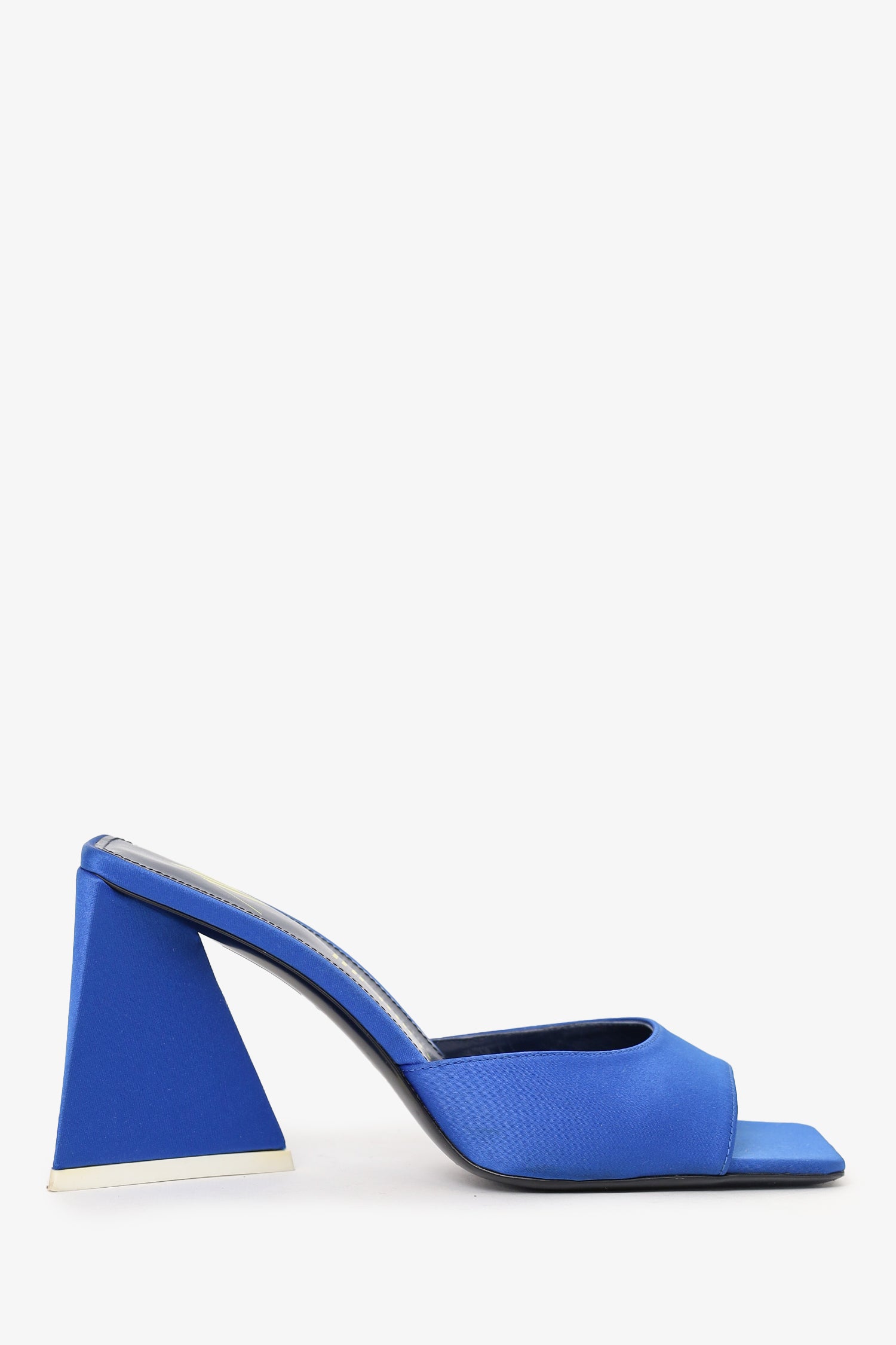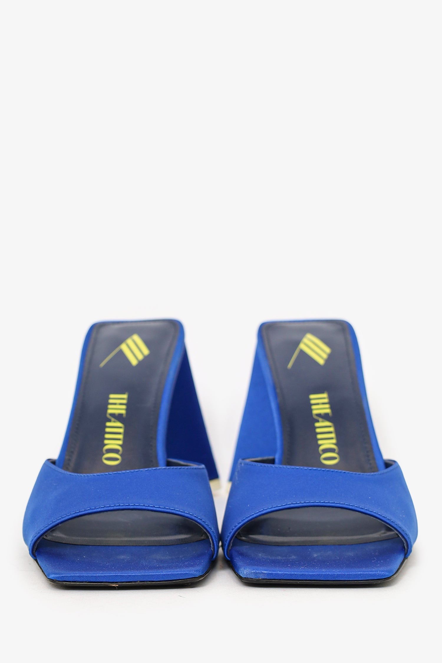 Refresh availabilityThe Attico Blue Satin 'Devon' Heeled Mules Size 35.5. Slip on. Open square toe. Chunky triangle heel. Satin finish. Tonal stitching.