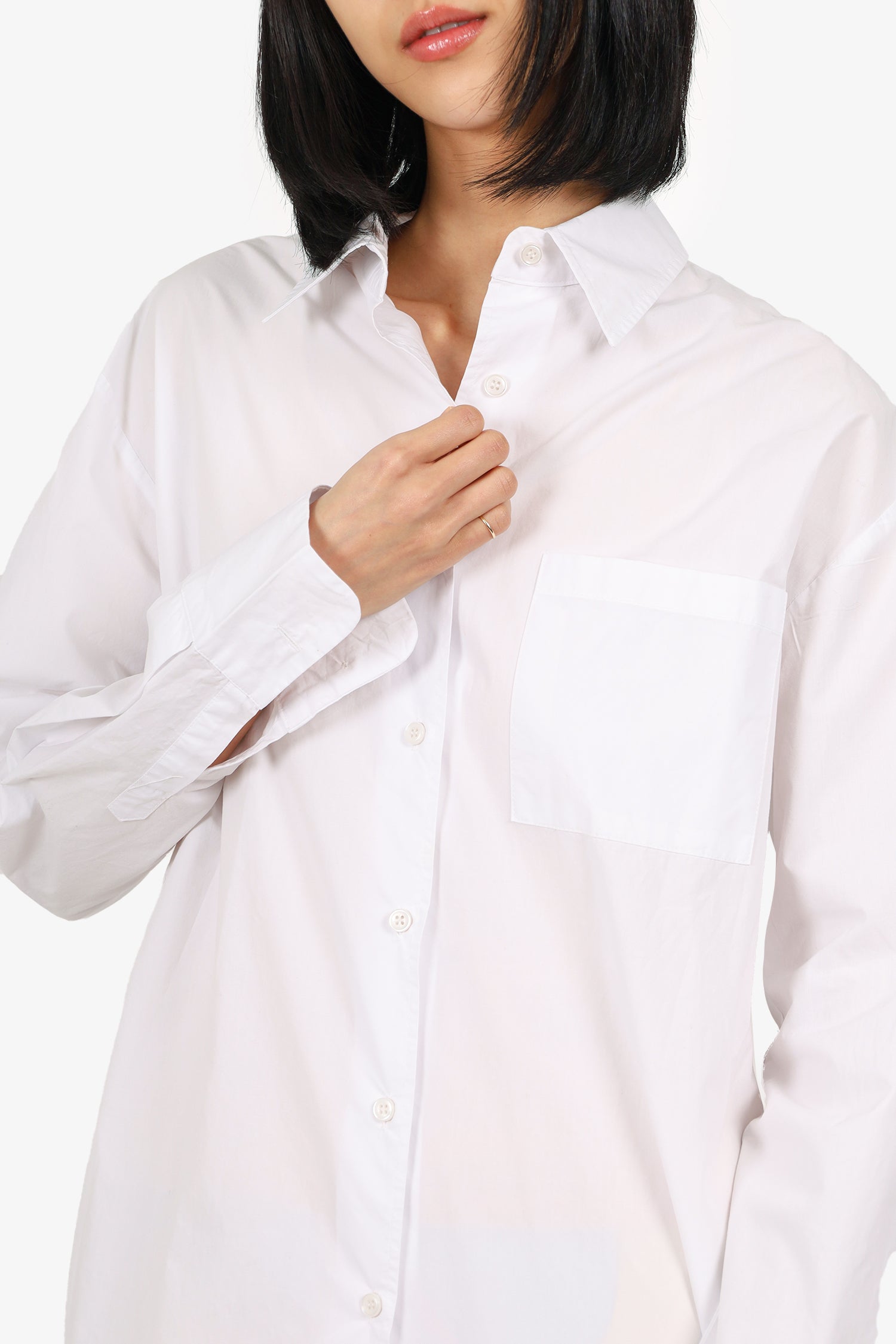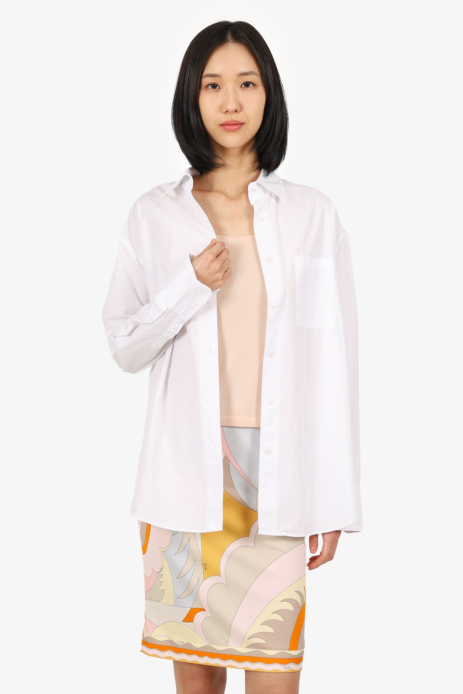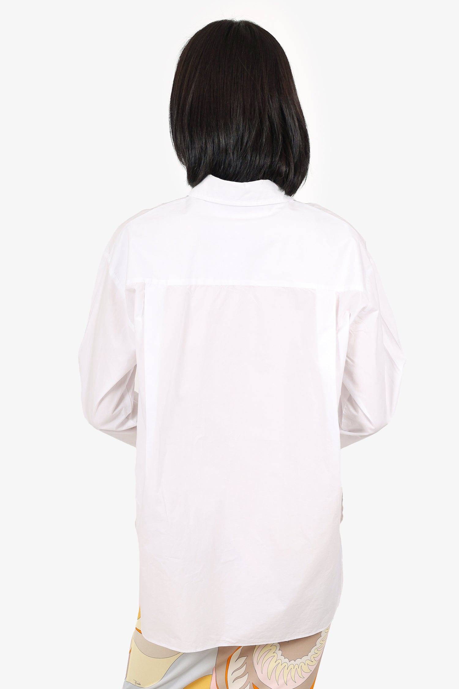 Refresh availabilityThe Frankie Shop White Button Down Shirt. Collared neckline. Front button-up closure. Sleeve cuffs with button-up closure. Single front chest slip pocket. Tonal stitching.