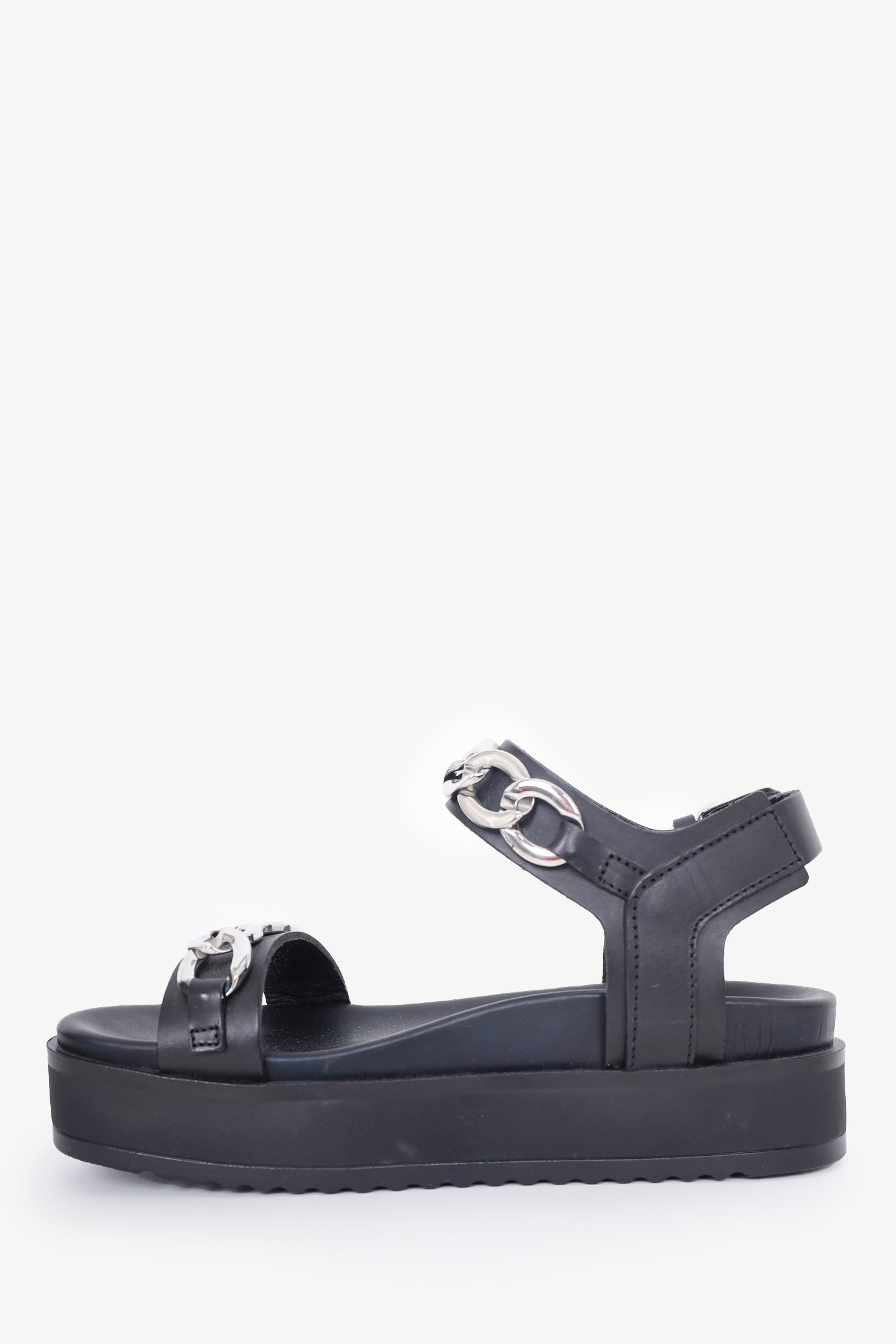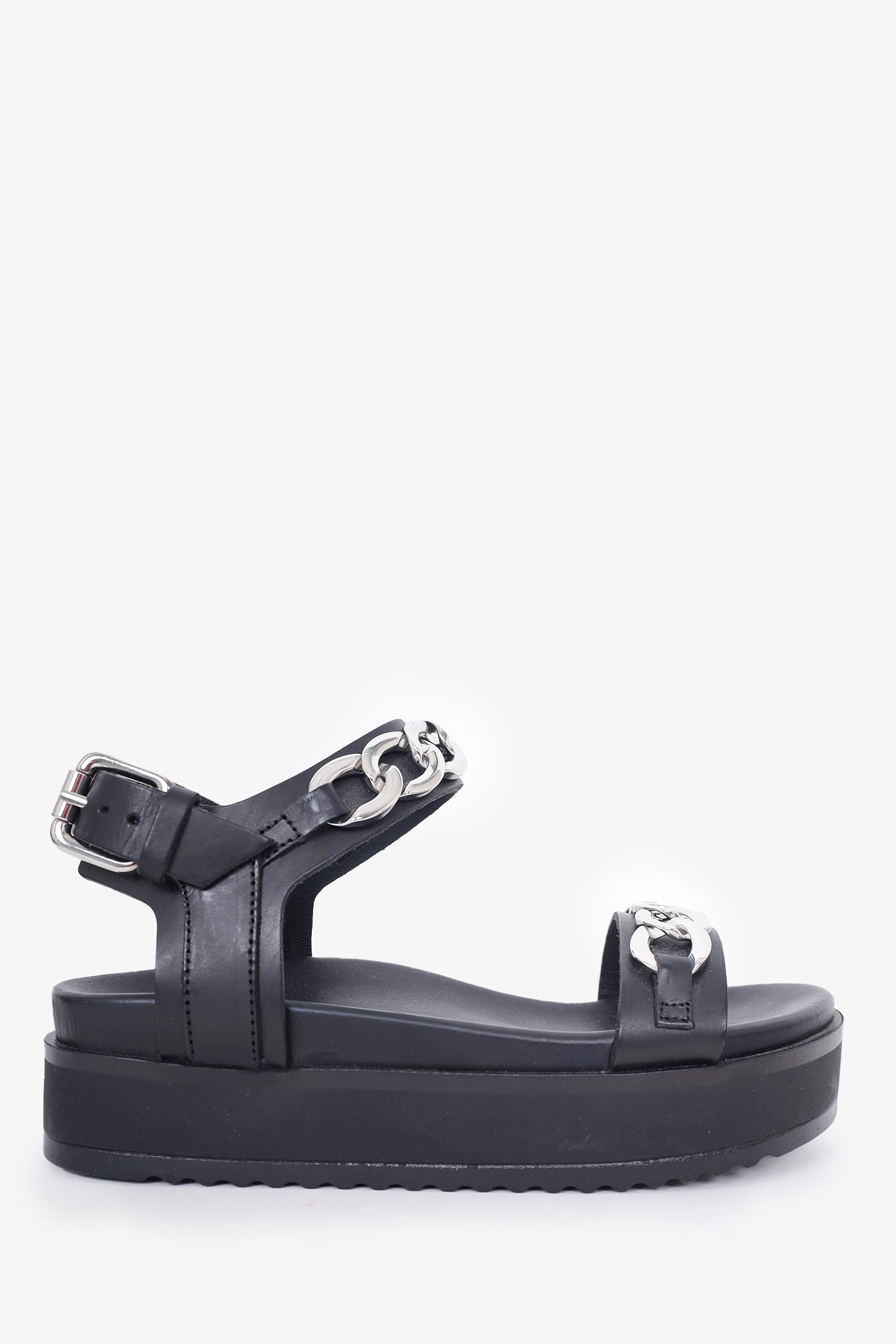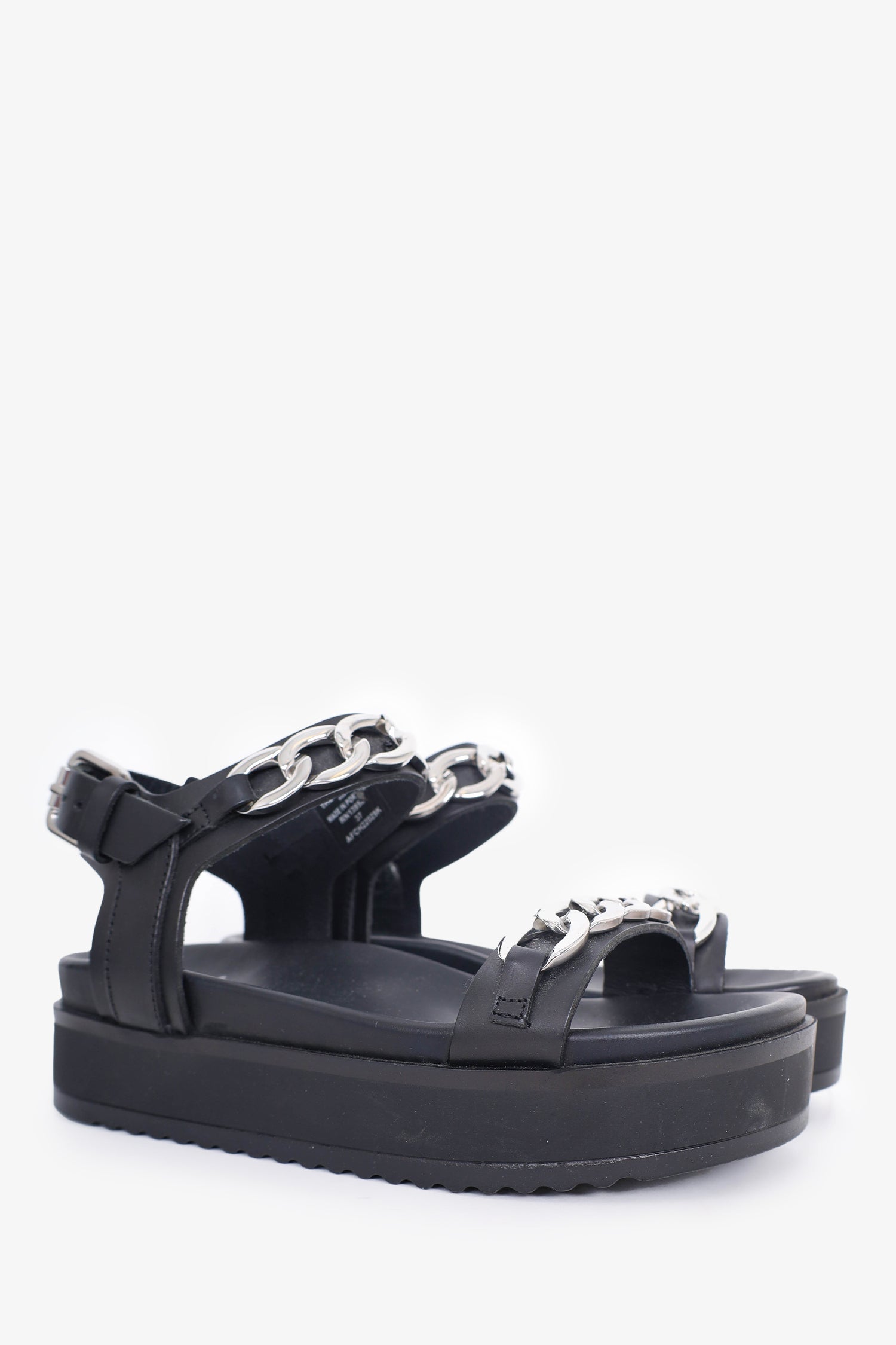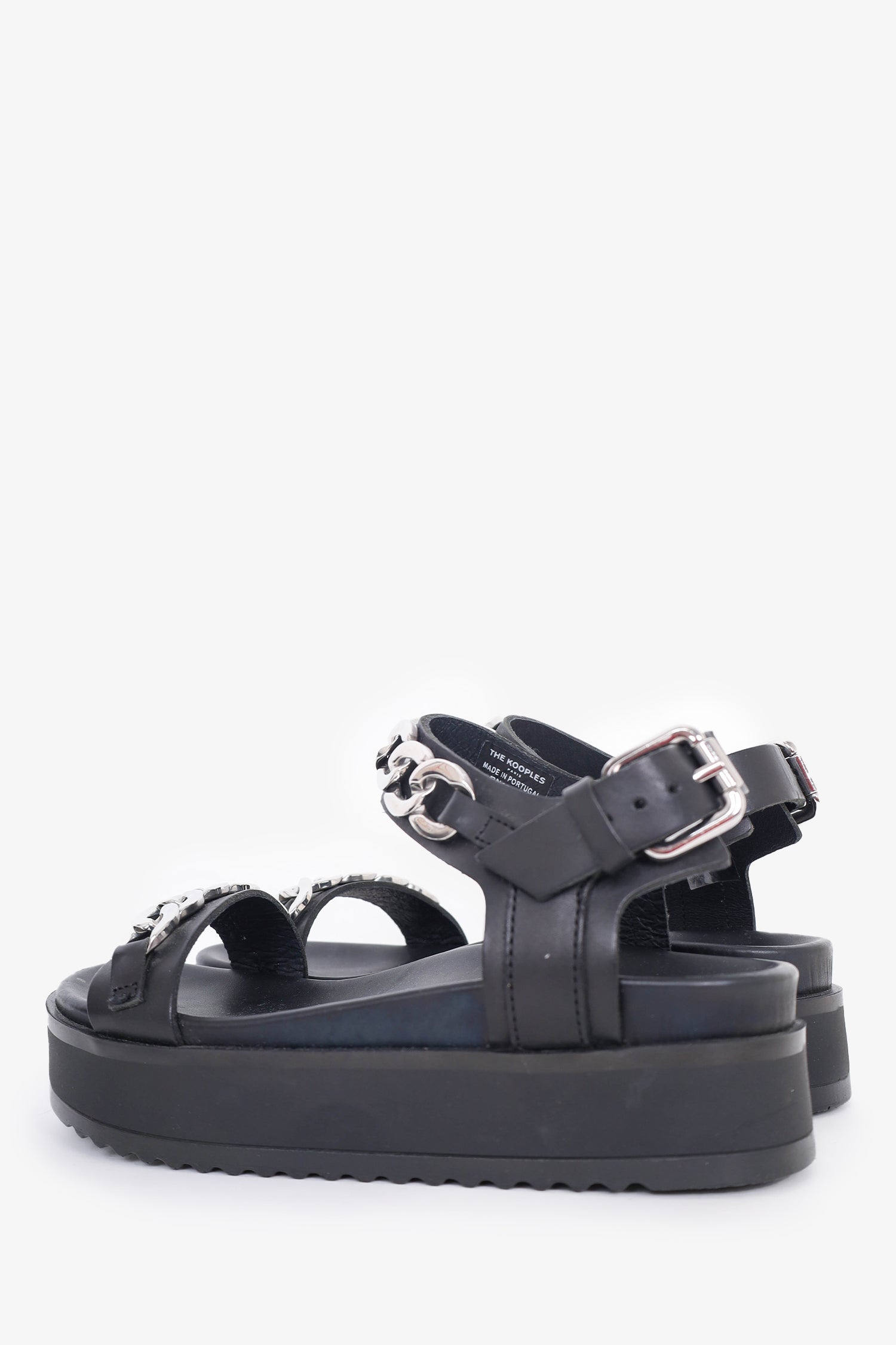 Refresh availabilityThe Kooples Black Leather Chain-Link Accents Sandals. Buckle closure on ankle strap. Silver-tone hardware. Tonal stitching.