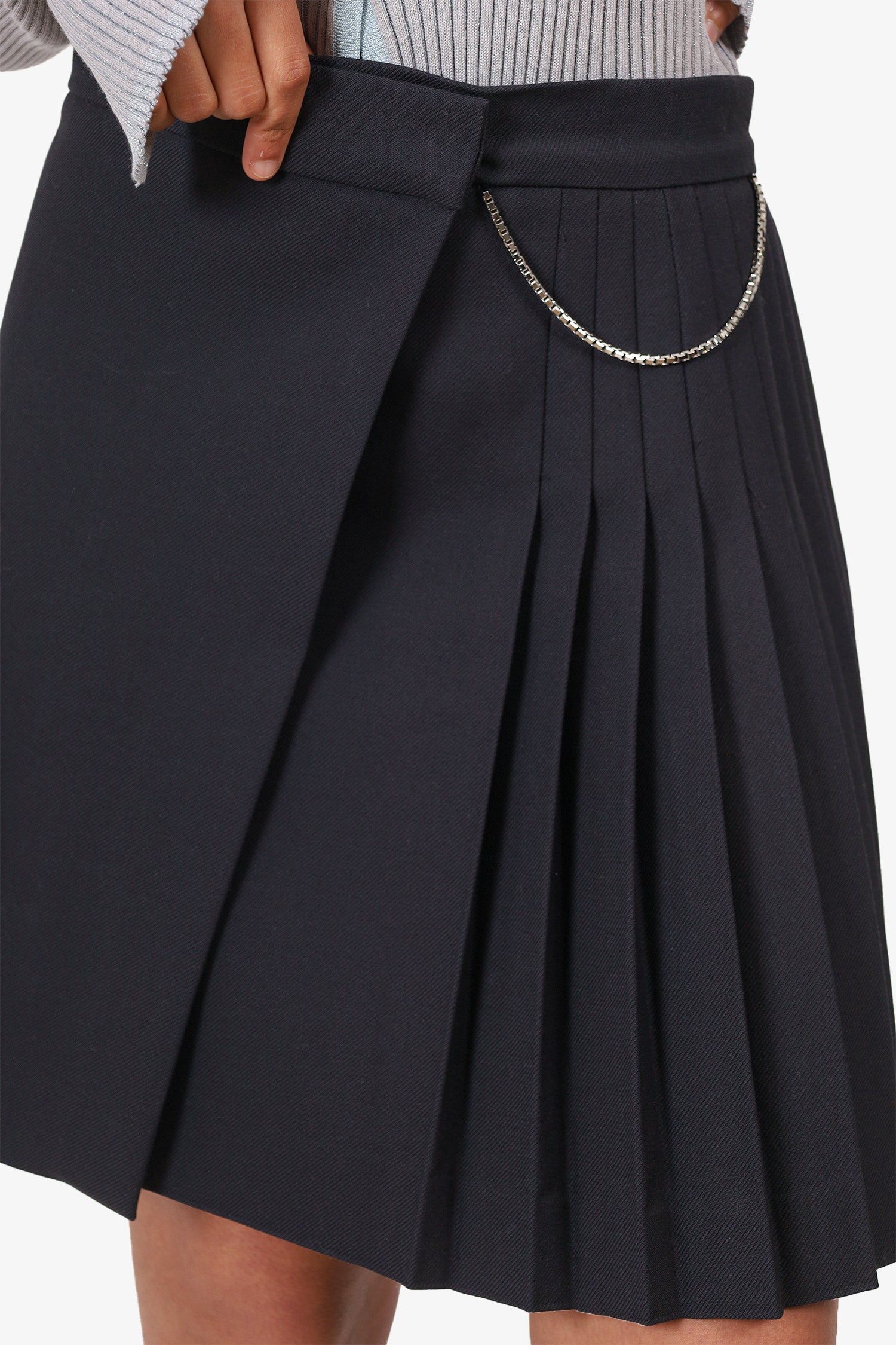 Refresh availabilityThe Kooples Black Pleated Mini Skirt. Slip-on. Wrap design with interior button-up closure. Chain detail on left side exterior. Silver-tone hardware. Tonal stitching.