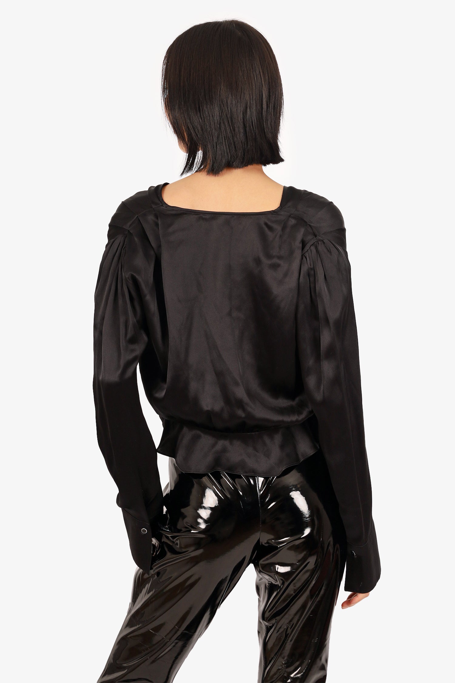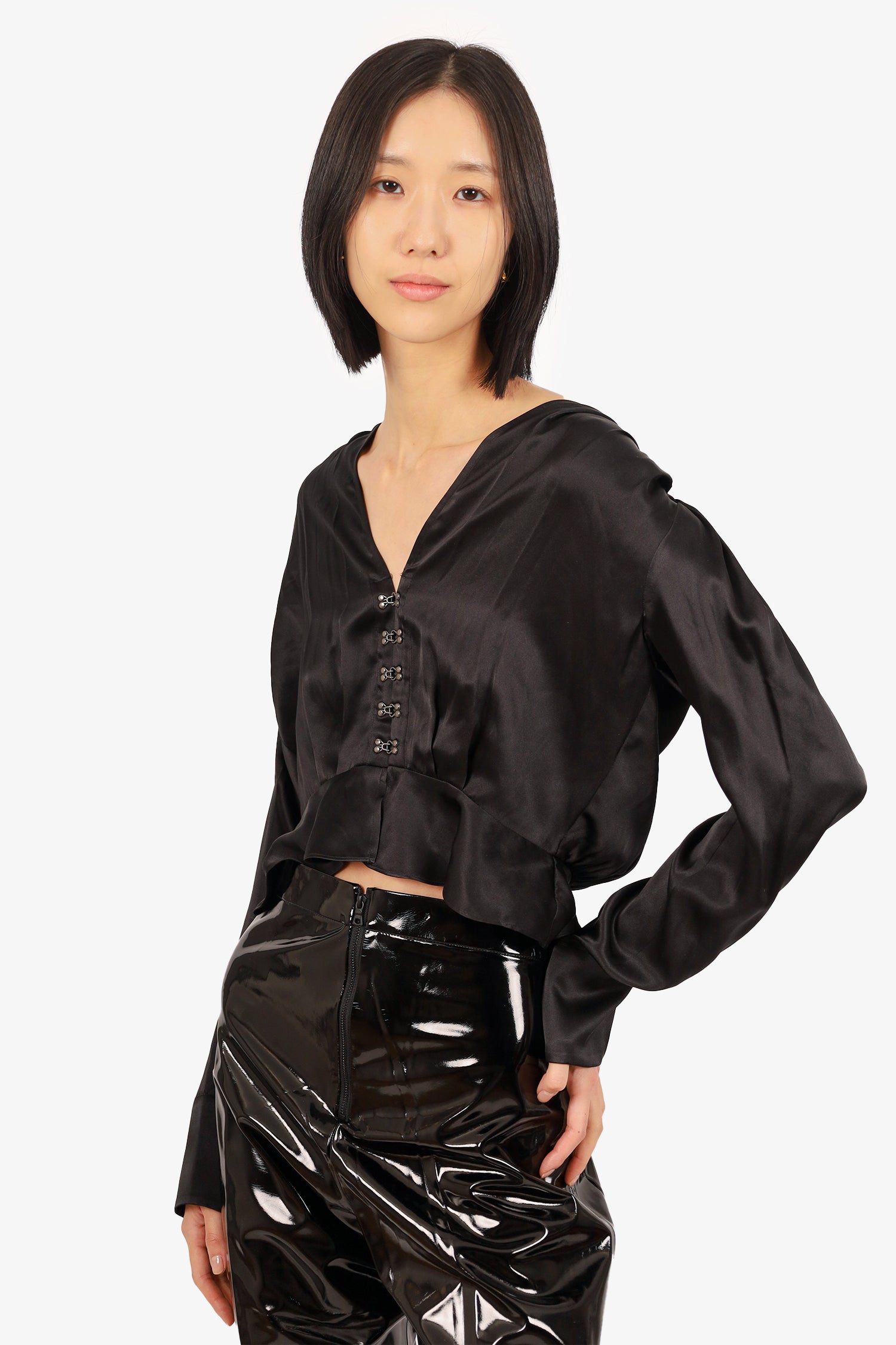 Refresh availabilityThe Kooples Silk V-Necklace Long Sleeve. V-neckline. Front hook closure. Button-up sleeve cuffs. Dark-metal tone hardware. Unlined. Tonal stitching.