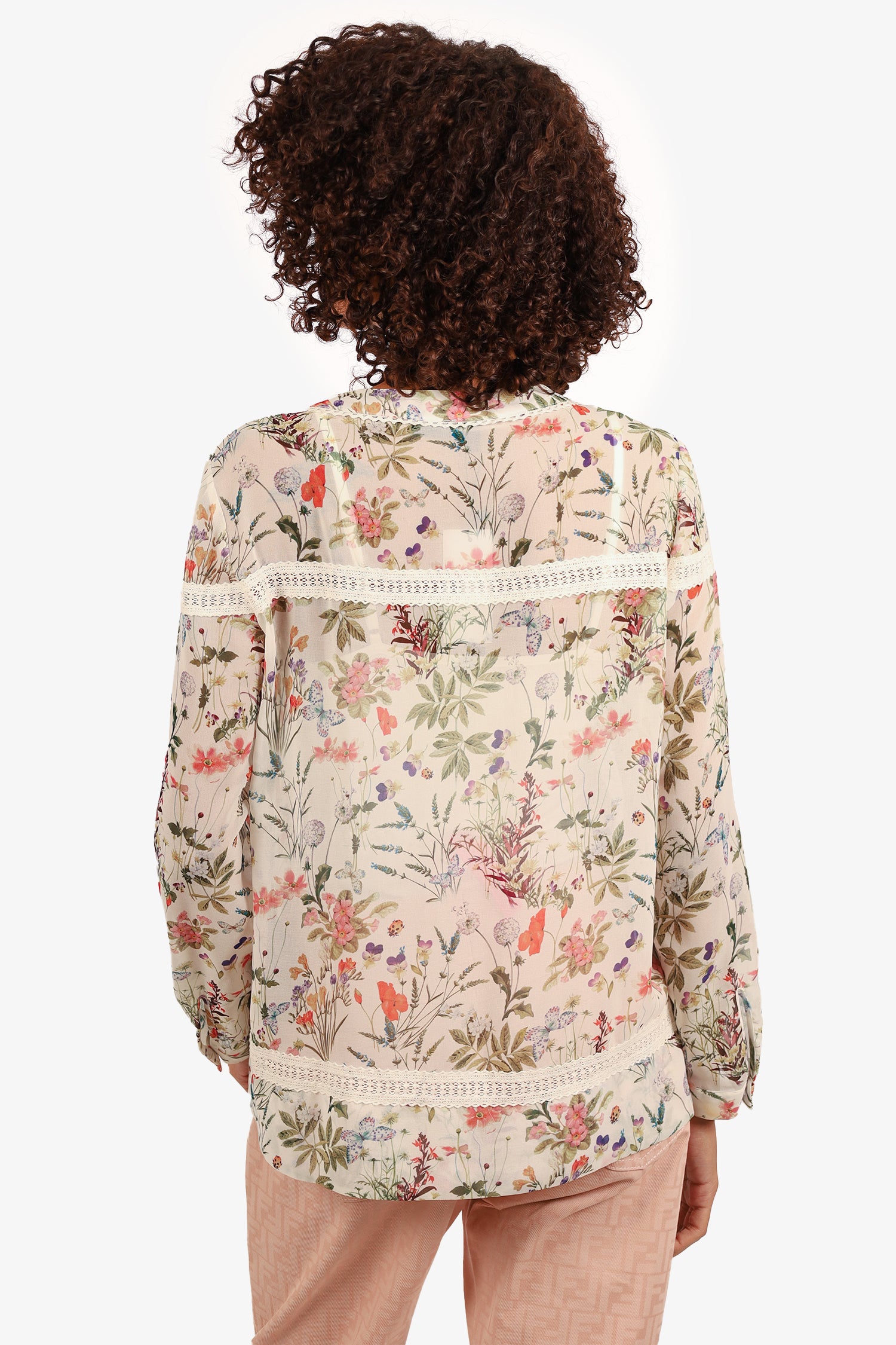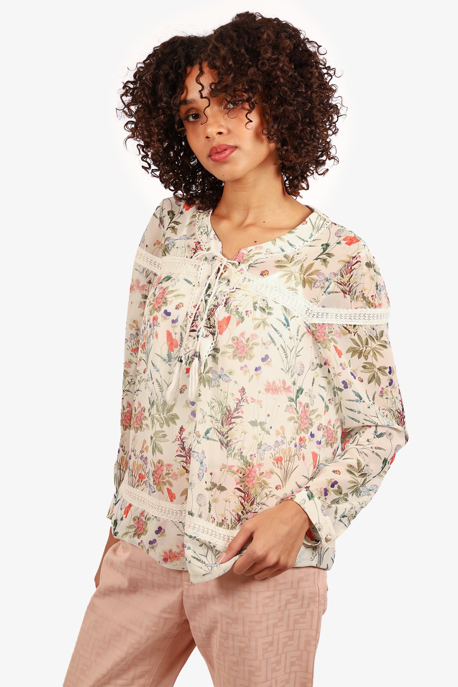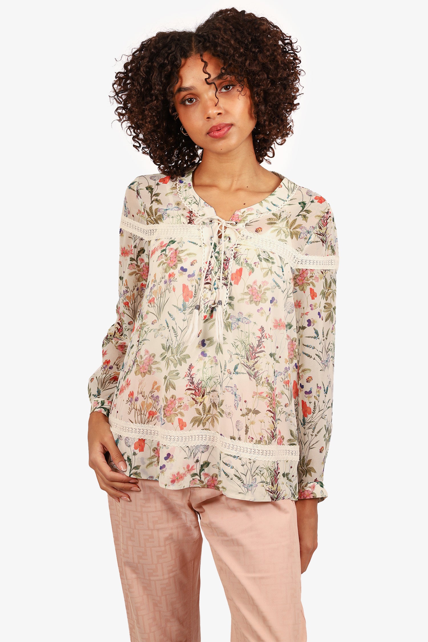 Refresh availabilityThe Kooples White/Green Floral Print Blouse. Pull-on. Front tassel lace-up closure. Round-neckline. Single button-up sleeve cuff closure. Semi-sheer body. Lace trim at hemline. Silver-tone hardware. Tonal stitching.