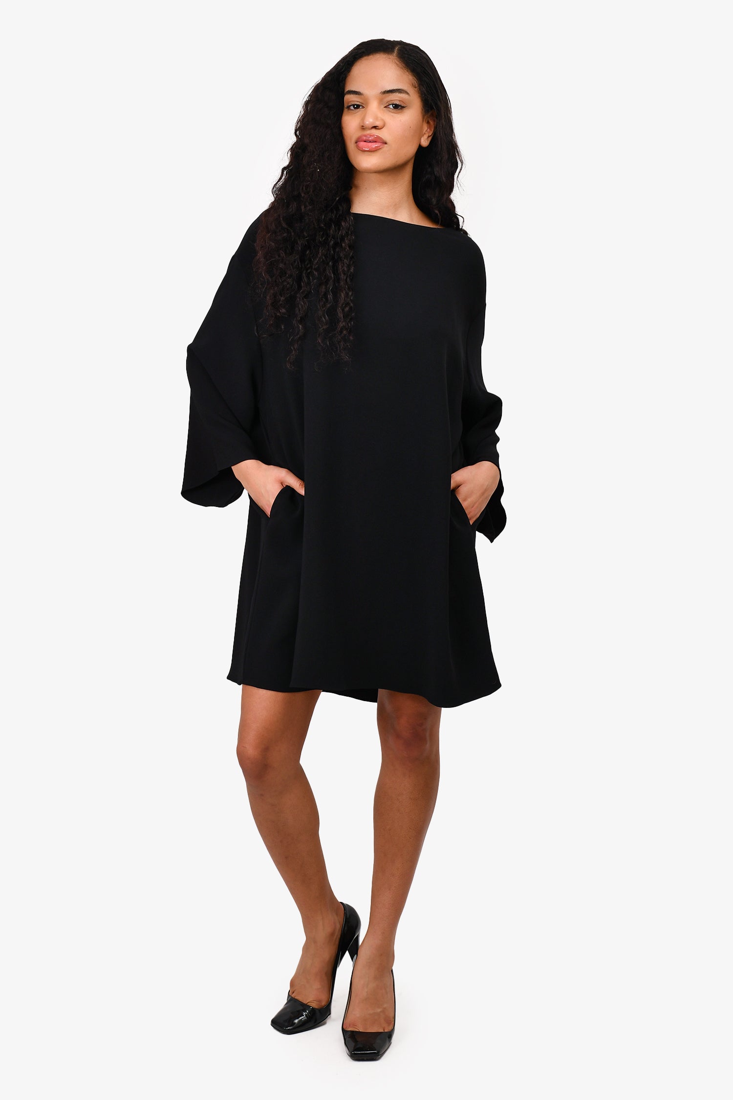 Refresh availabilityThe Row Black 3/4 Sleeve Oversized Dress. Lined collar. Draped, oversized fit. Concealed side pockets. Tonal stitching.
