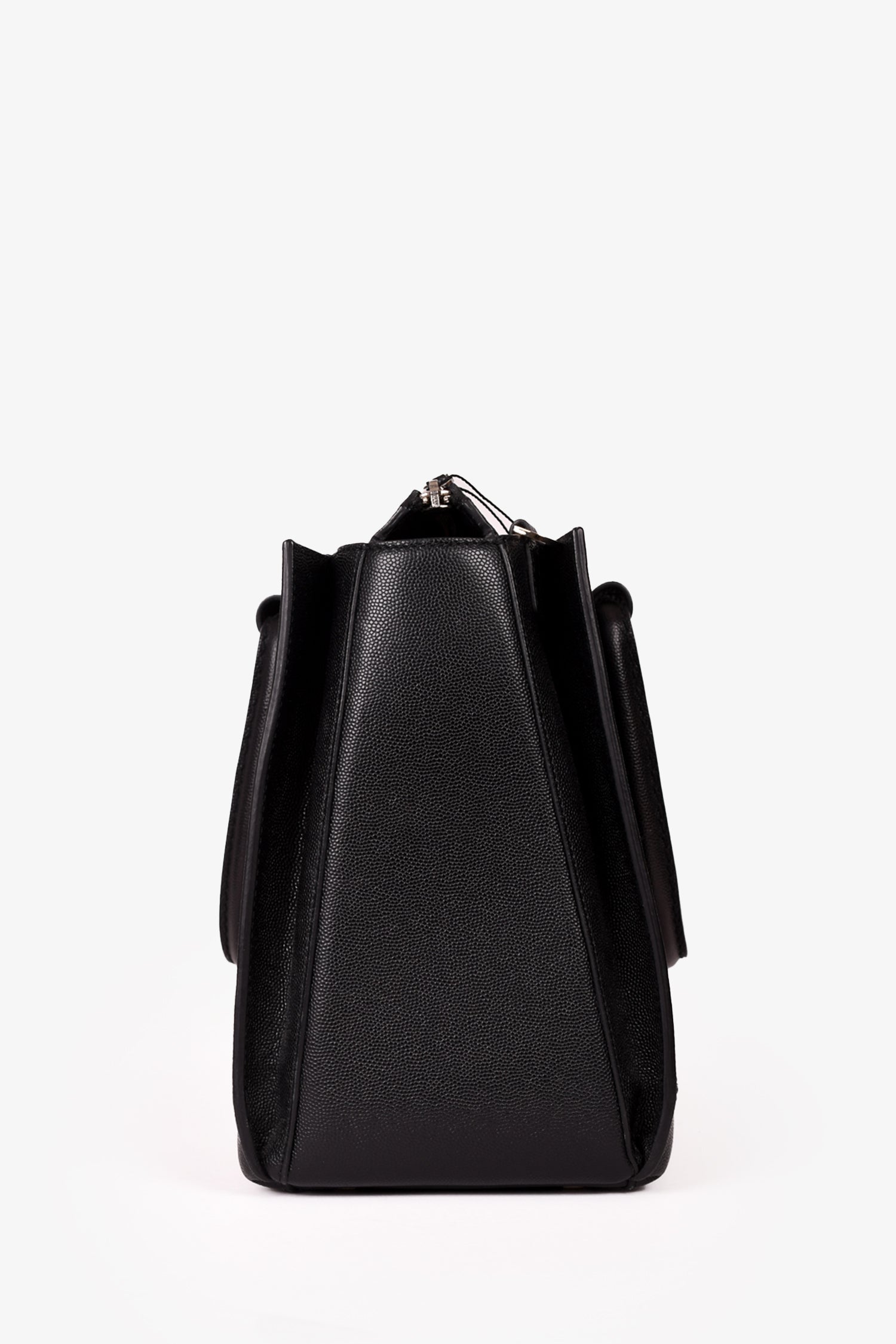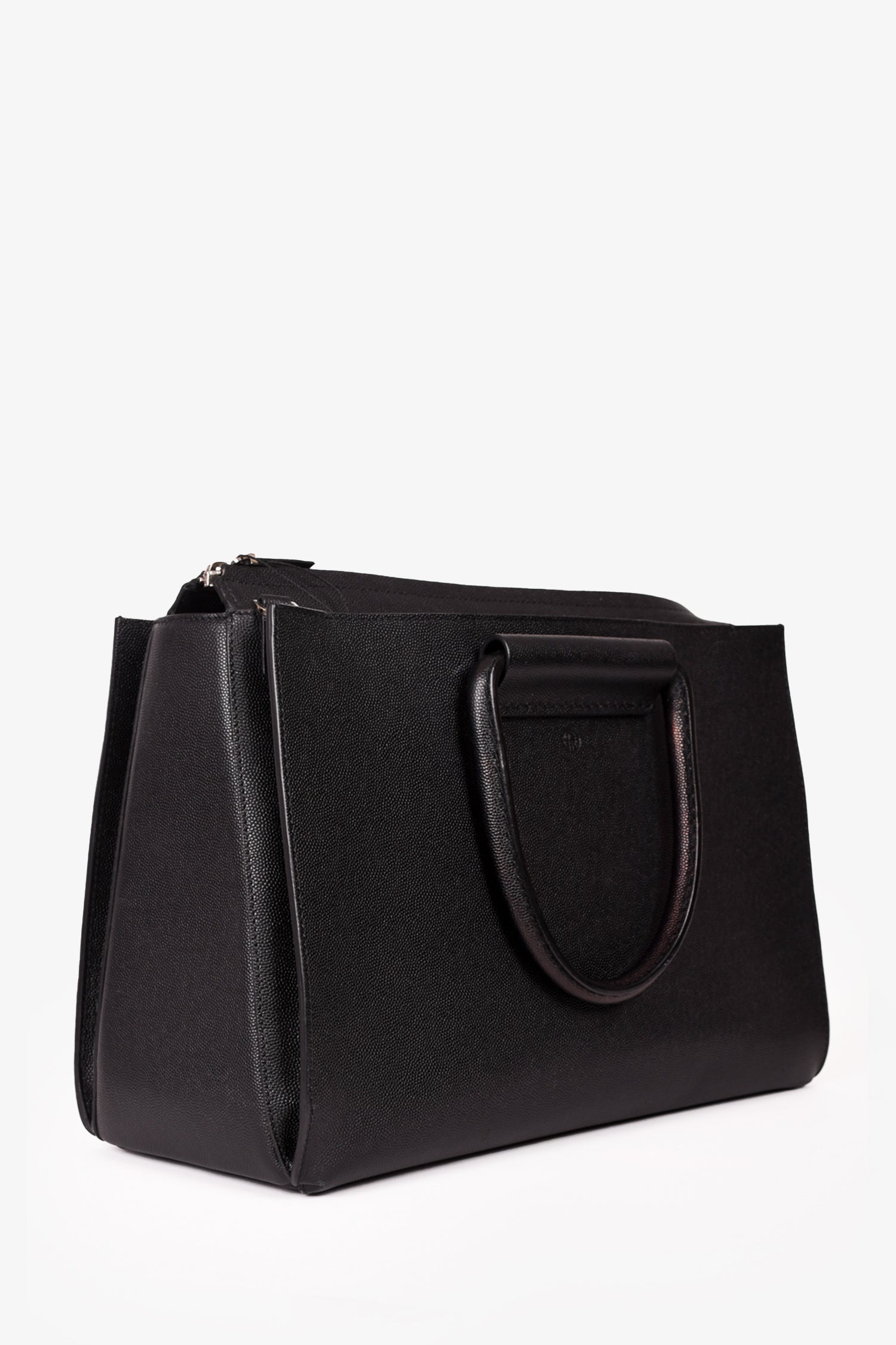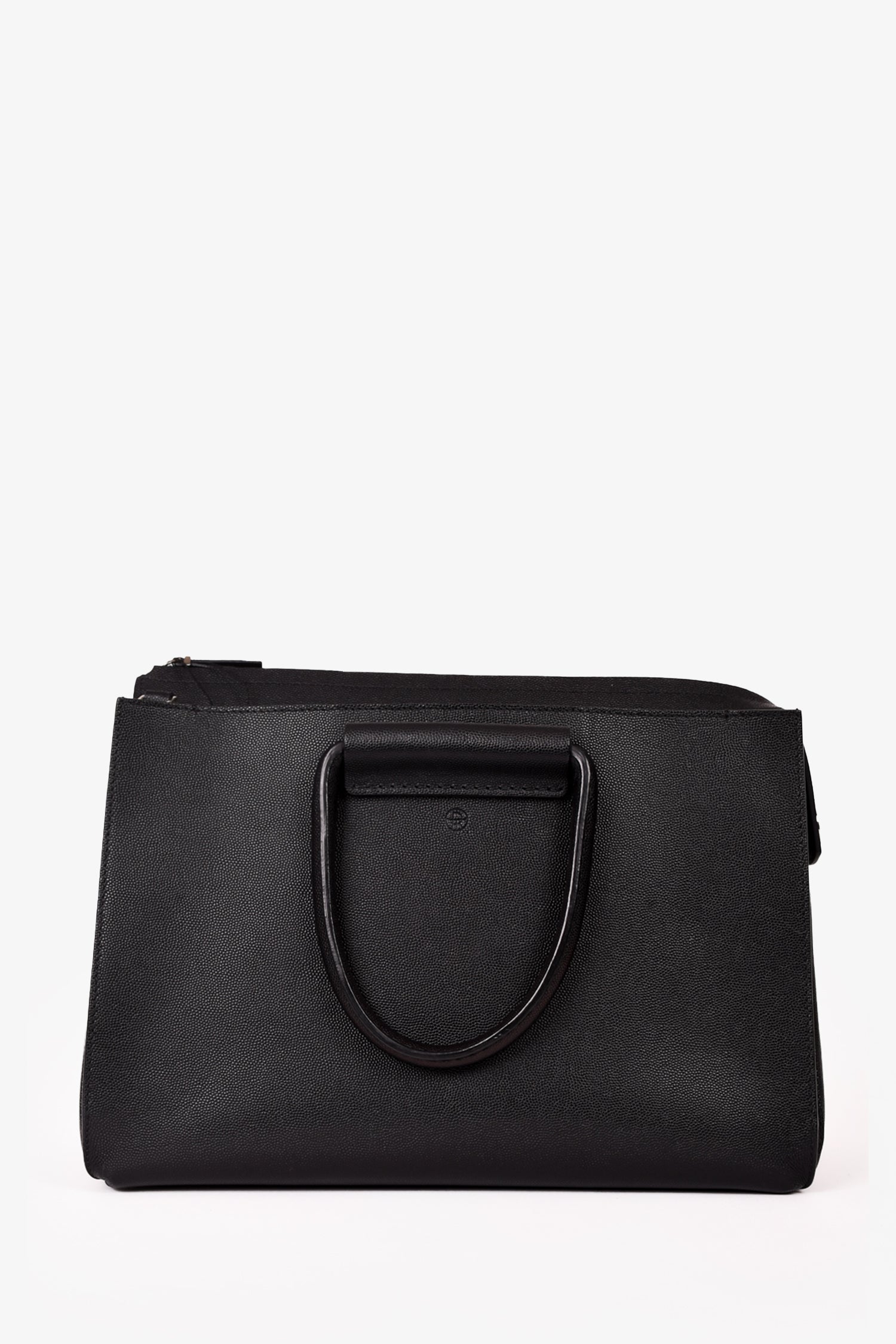 Refresh availabilityThe Row Black Leather Classic 5 Tote with Strap. Dual rolled handles. Front and rear open compartments. Top zip closure. Grey textile interior lining. 3 interior wall pockets; 2 slip and 1 with zip closure. Removable strap. Silver-tone hardware. Protective metal bottom. Tonal stitching.