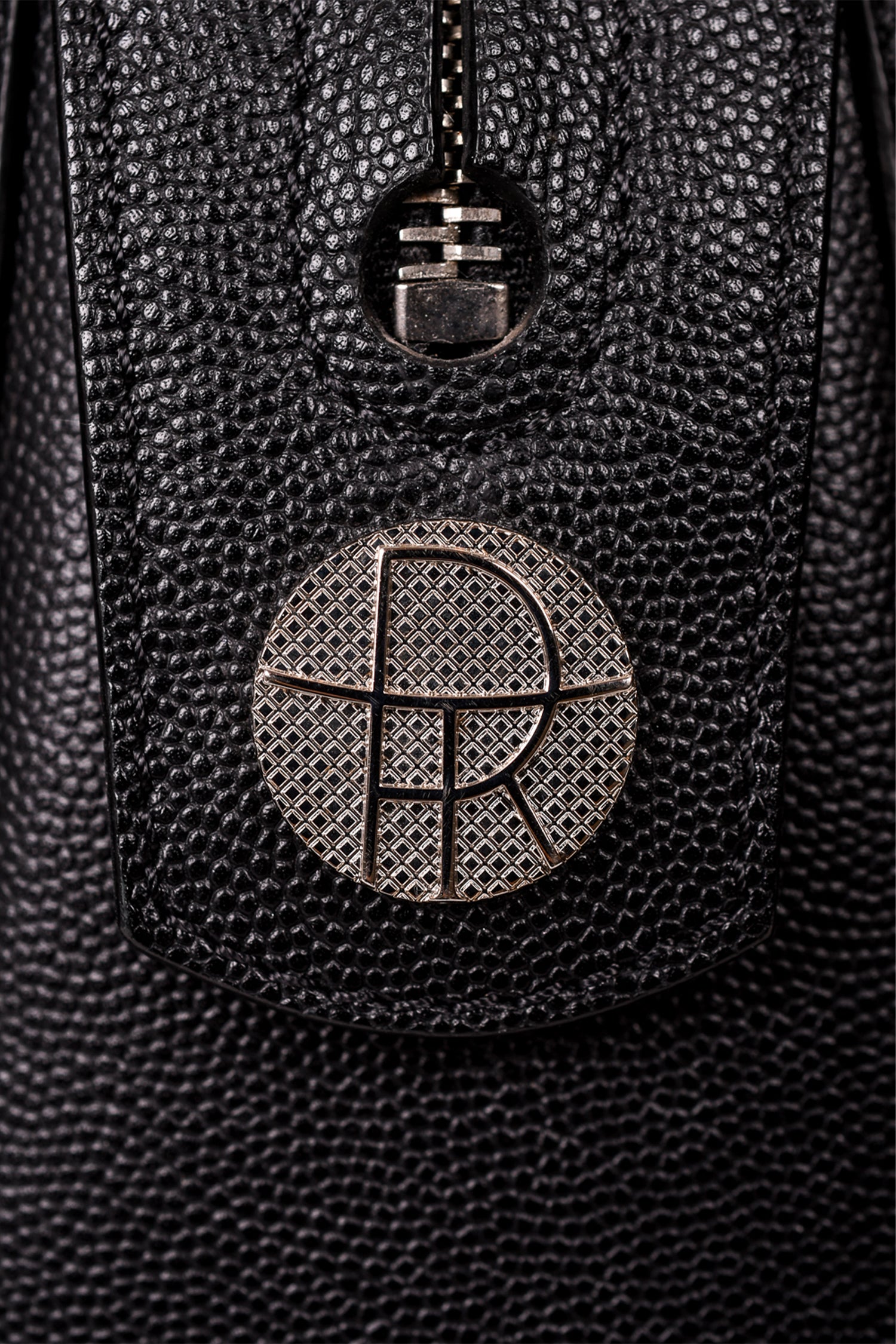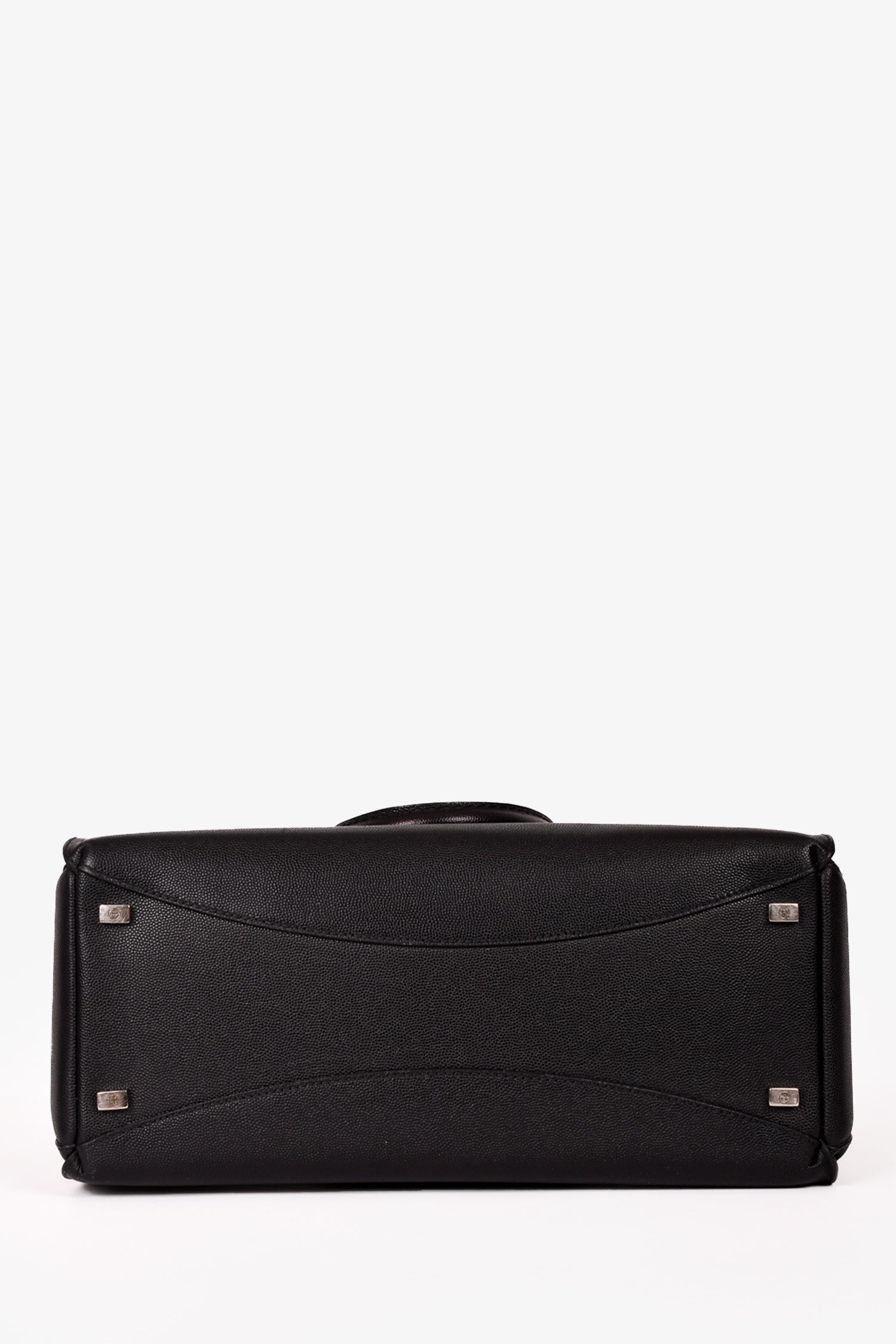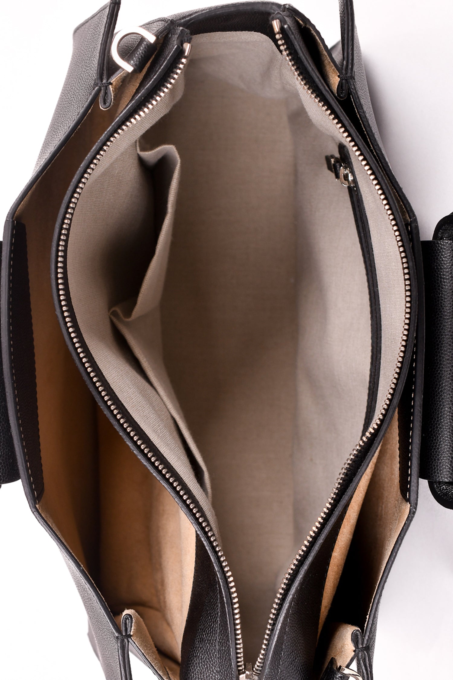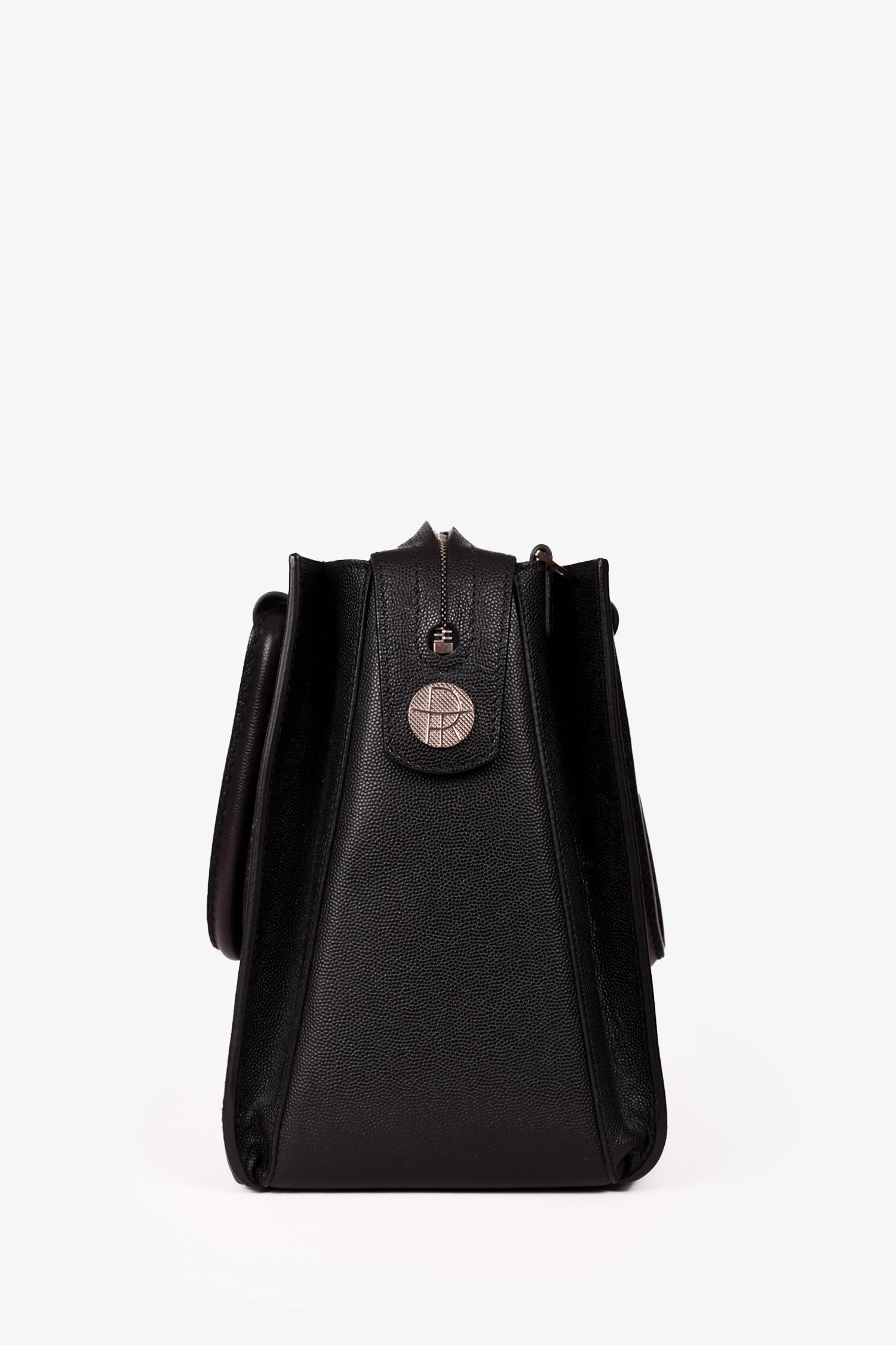 Refresh availabilityThe Row Black Leather Classic 5 Tote with Strap. Dual rolled handles. Front and rear open compartments. Top zip closure. Grey textile interior lining. 3 interior wall pockets; 2 slip and 1 with zip closure. Removable strap. Silver-tone hardware. Protective metal bottom. Tonal stitching.