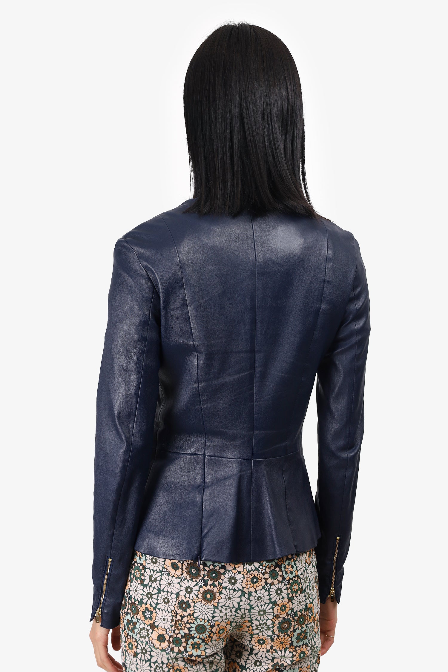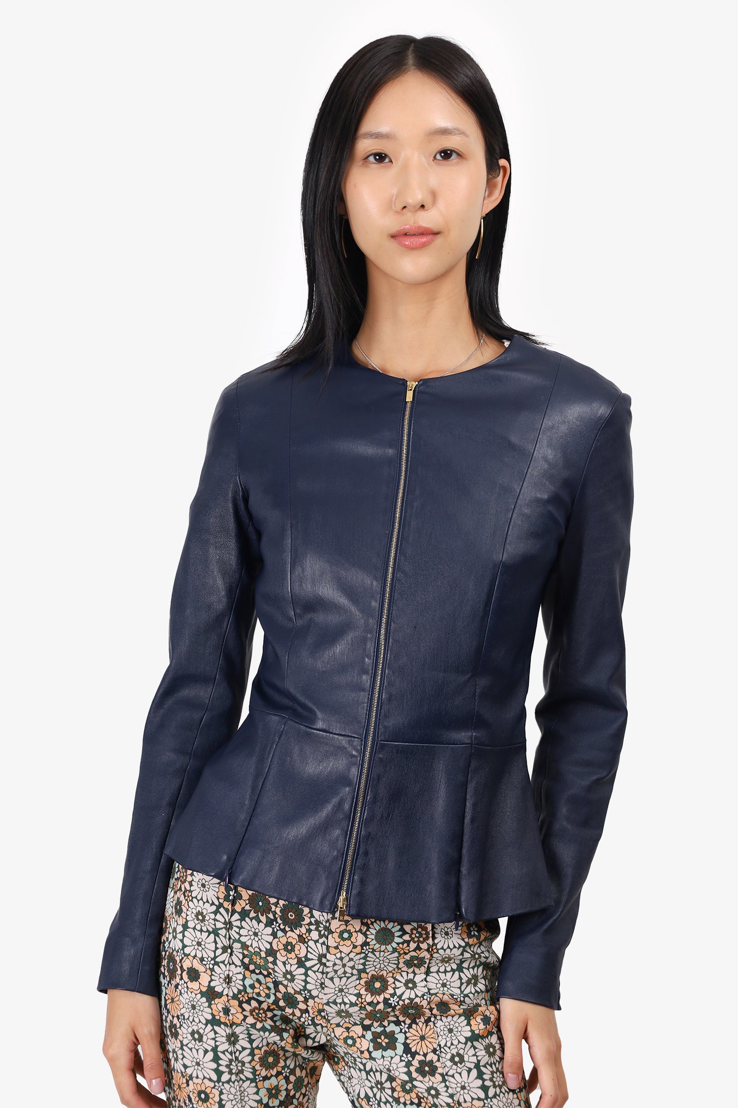 Refresh availabilityThe Row Navy Lambskin Anasta Leather Jacket. Round neckline. Front zip closure. Expanding zippers on sides of front and back. Zipper closure on sleeve cuffs. Peplum bottom. Lined. Gold-tone hardware. Tonal stitching.
