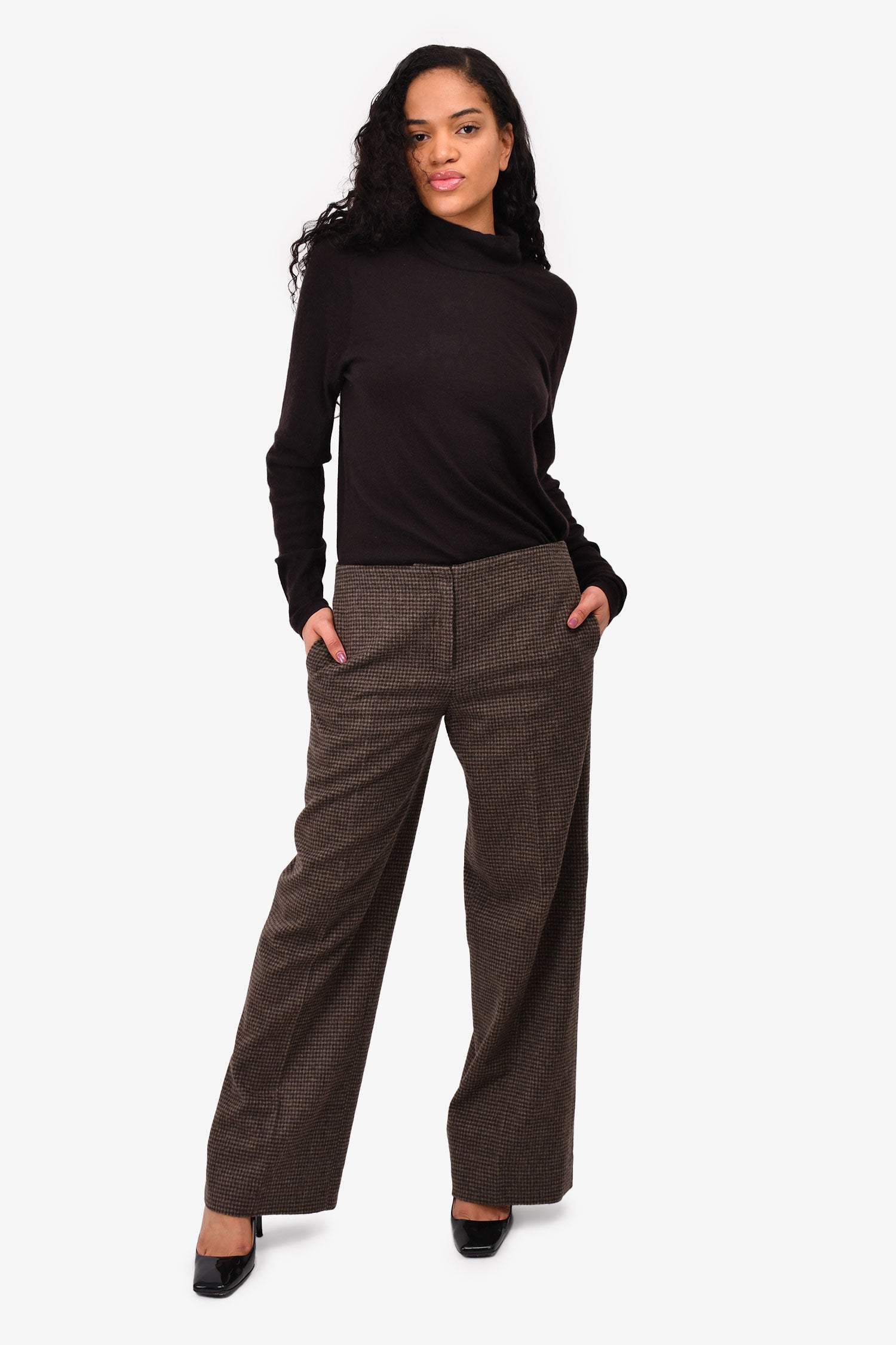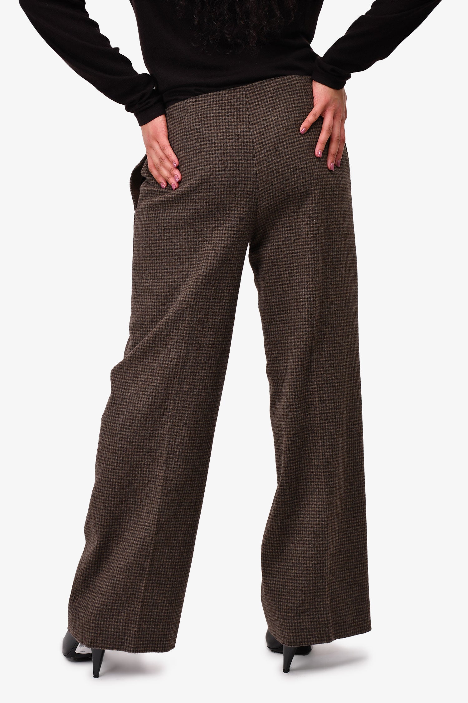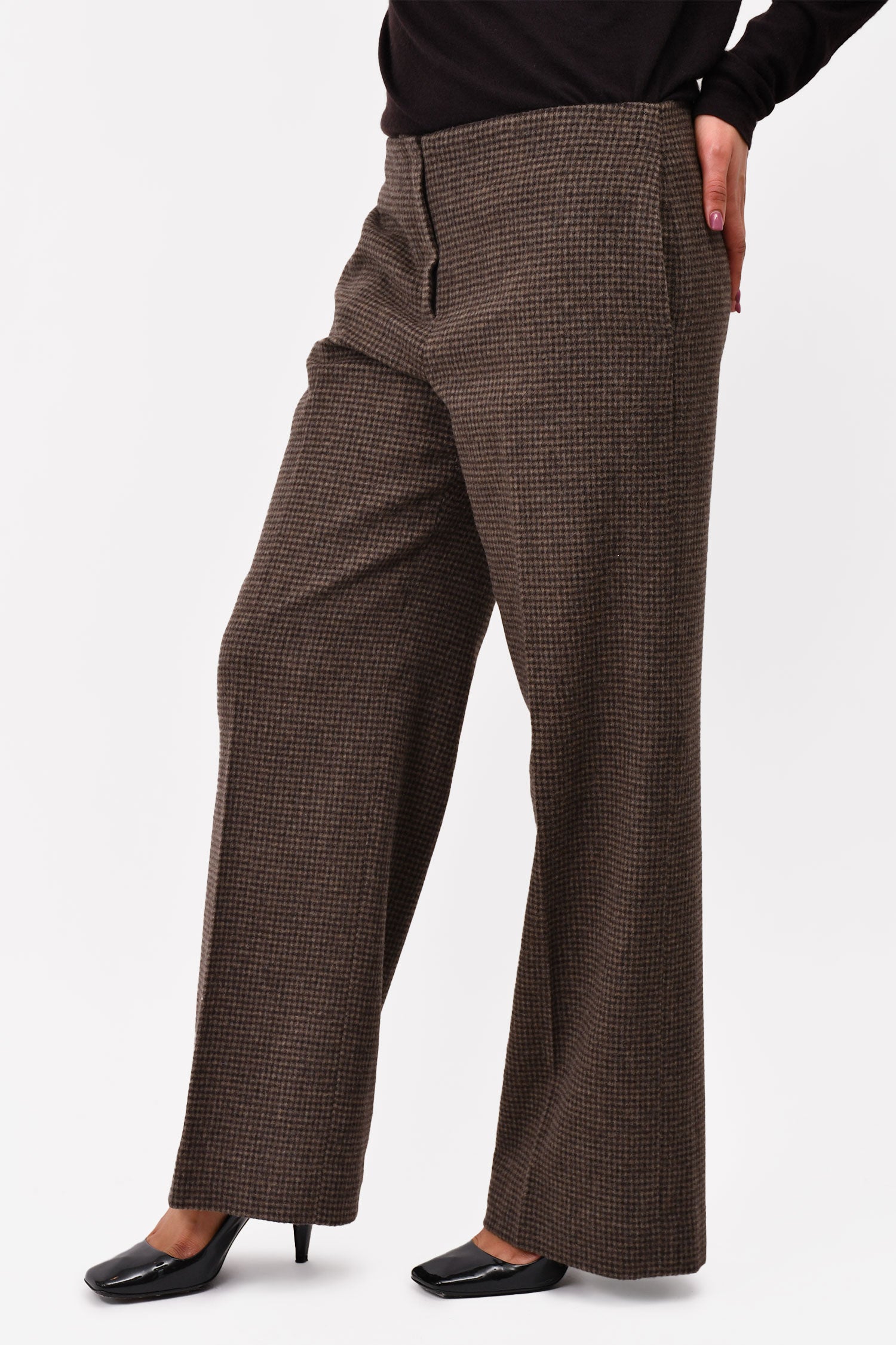 Refresh availabilityTheory Brown Houndstooth Wool Wide Leg Trousers. Concealed side pockets on the seams. Tonal stitching. Zipped front with a hook fastening. Lined interior.