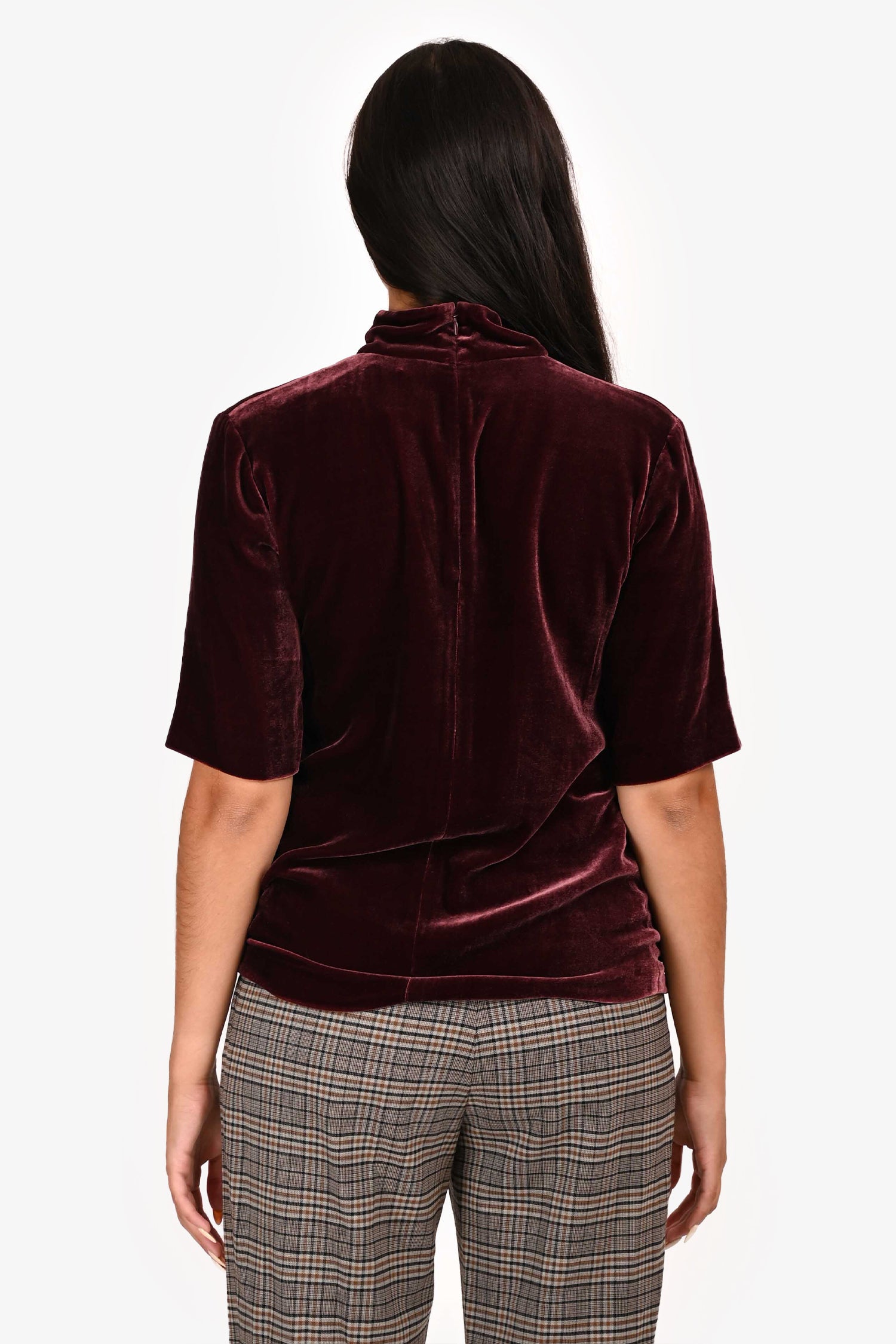 Refresh availabilityTheory Burgundy Velvet Mock Neck Cut Out Top. Back red-tone zipper closure with silver-tone clasp. V cut out neckline. Tonal stitching.