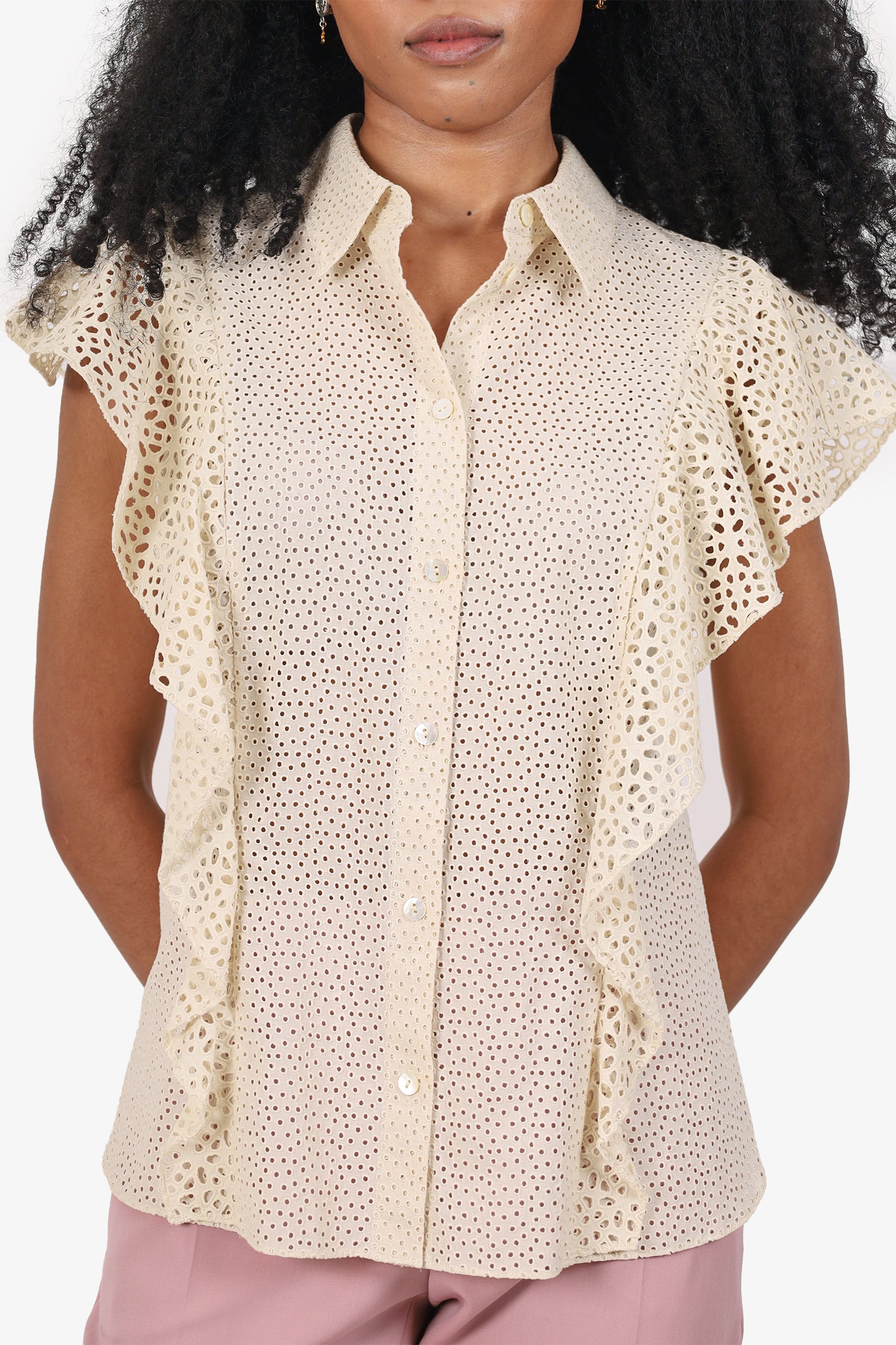 Refresh availabilityTheory Cream Ruffle Detail Eyelet Top. Pull-on. Collared-neckline. Front button-up closure. Perforated exterior. Tonal stitching.
