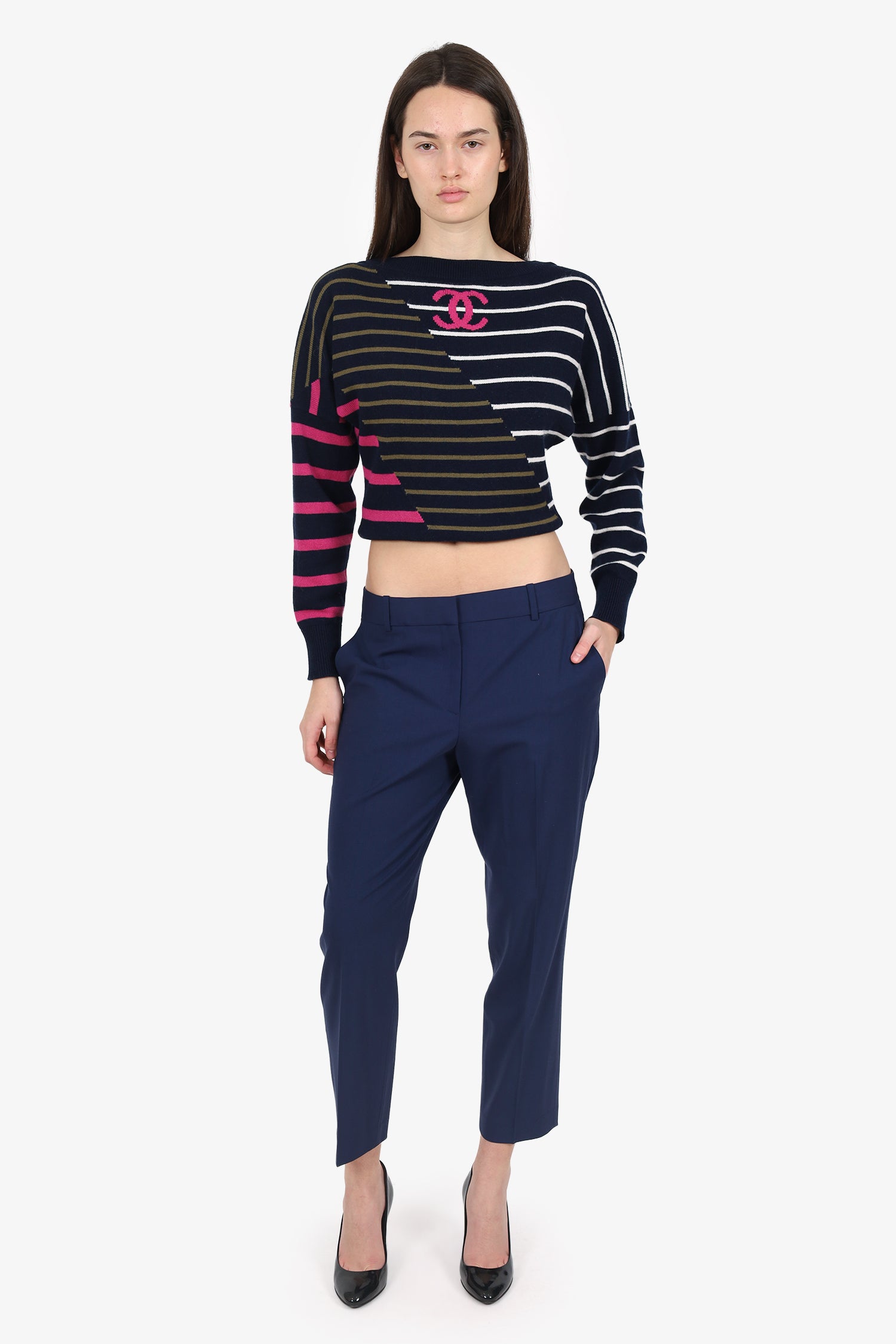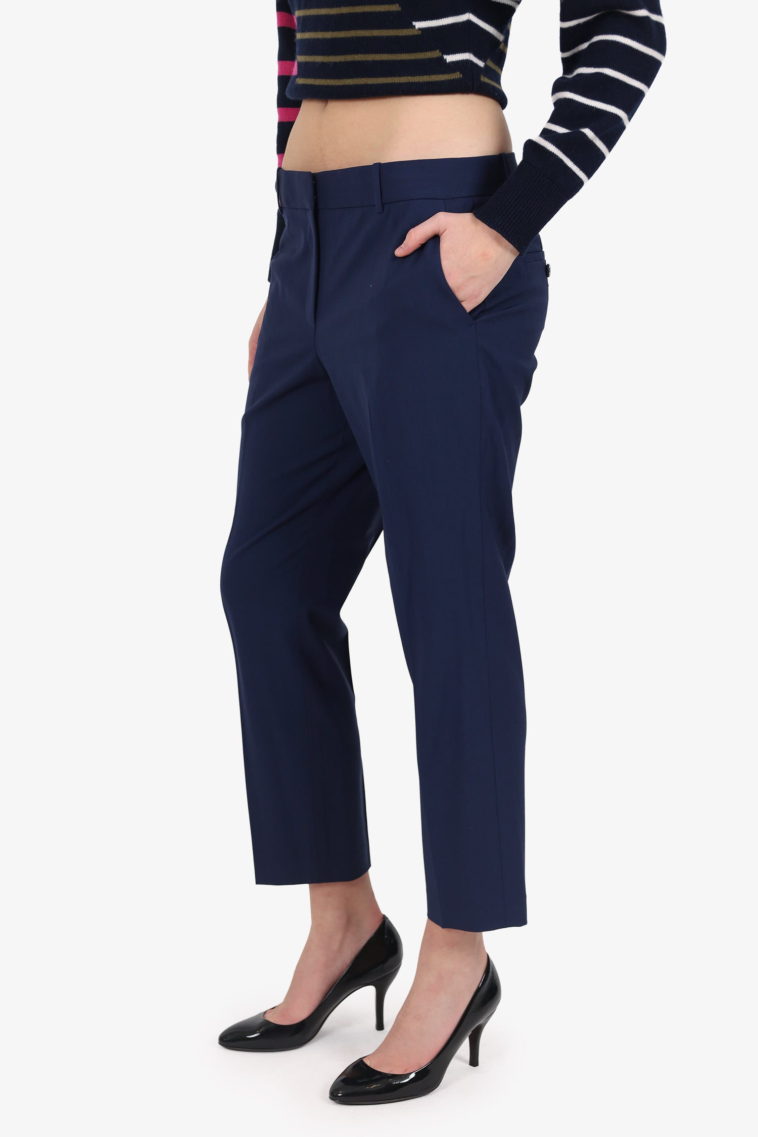 Refresh availabilityTheory Navy Blue Wool Cropped Trousers. Pull-on. Front zip with hook and button-up closure. Waistband belt-loops. 4 exterior pockets; 2 front slip, and 2 rear button-up. Gunmetal-tone hardware. Tonal stitching.