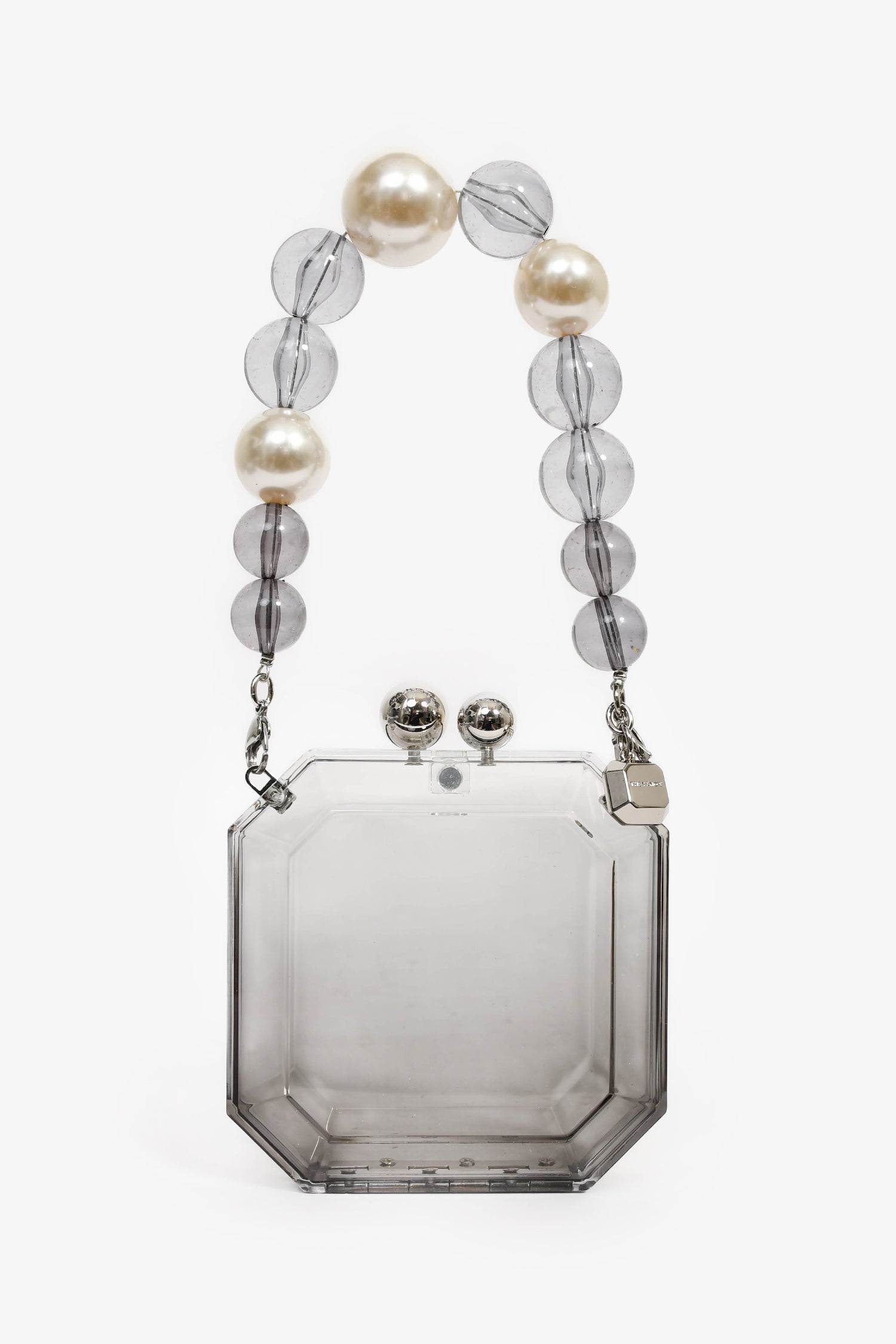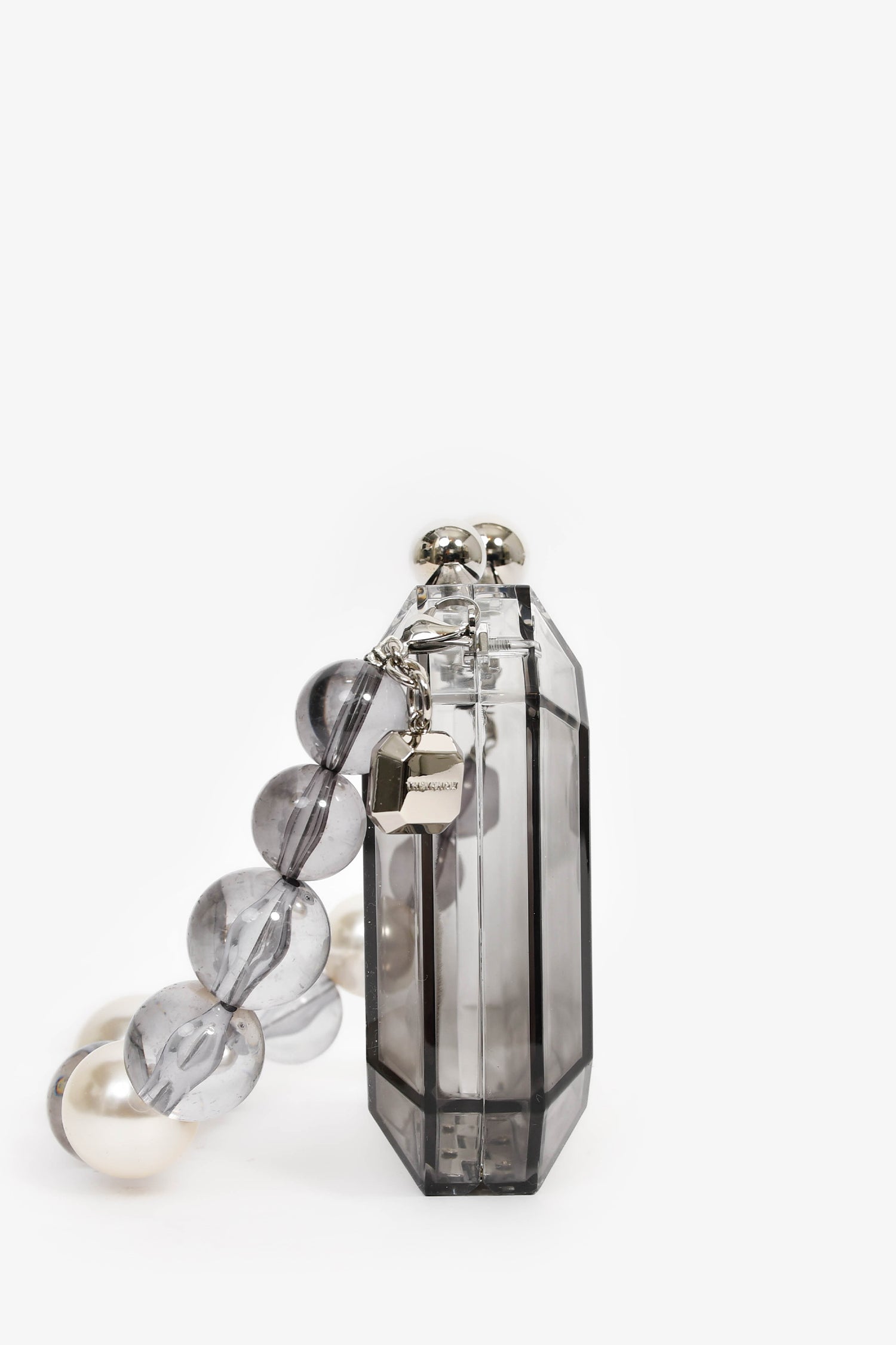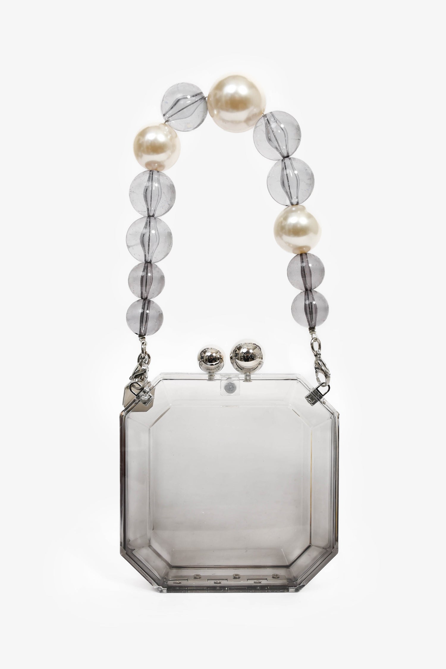 Refresh availabilityTheyknow Grey Acrylic Faux Pearl Mini Top Handle. Top magnetic closure. Single interior compartment. Detachable handle. Silver-tone hardware.