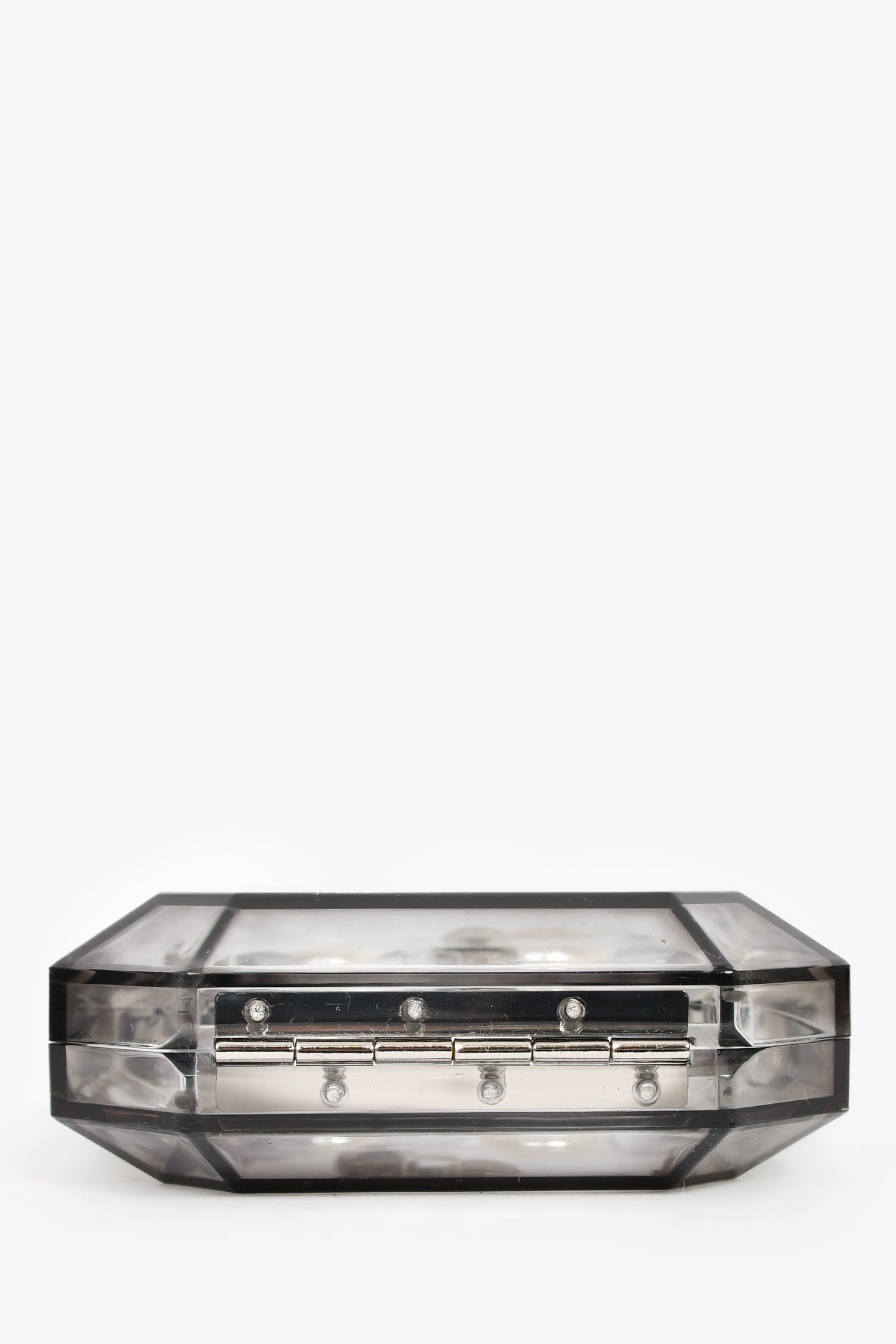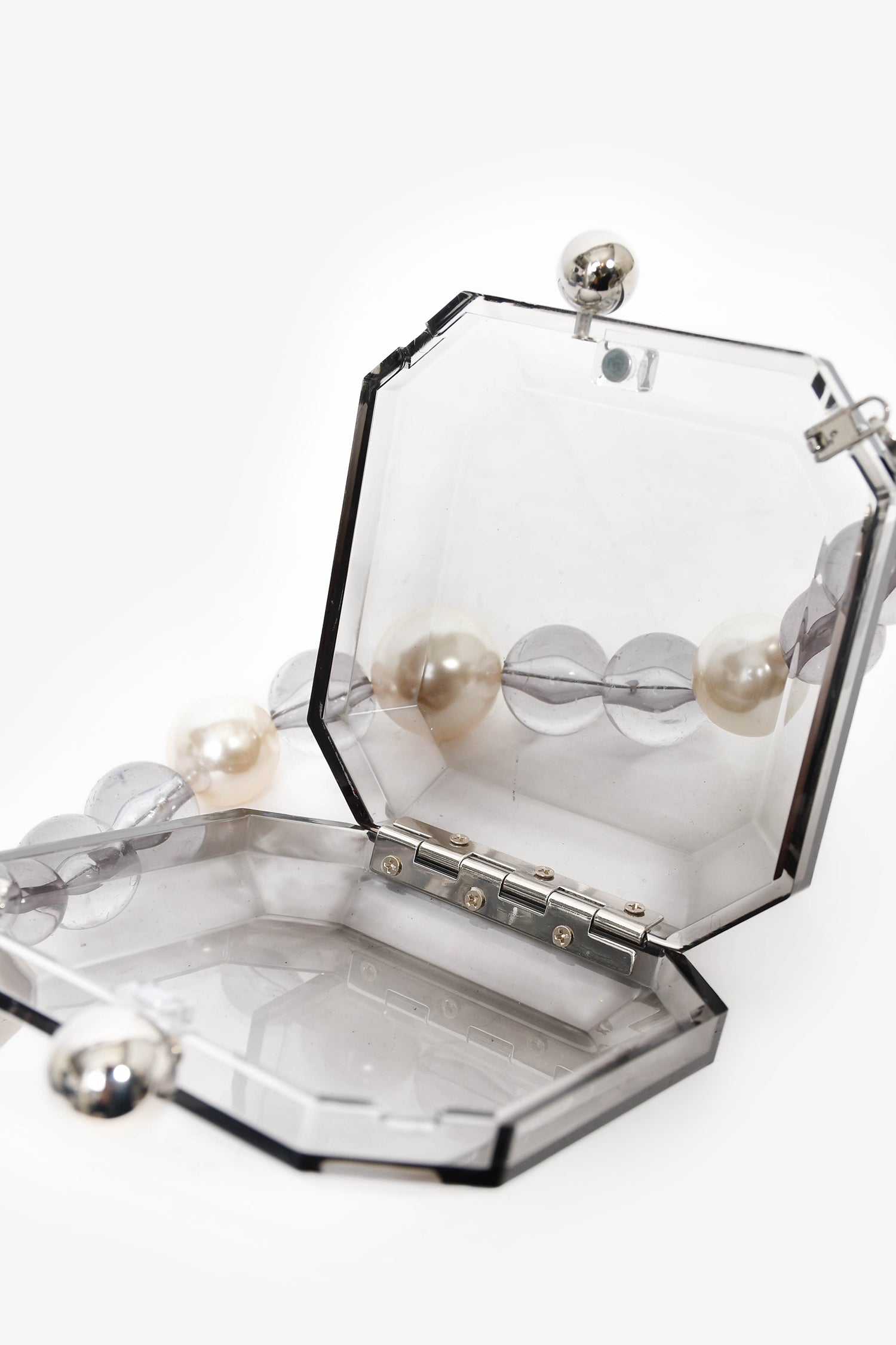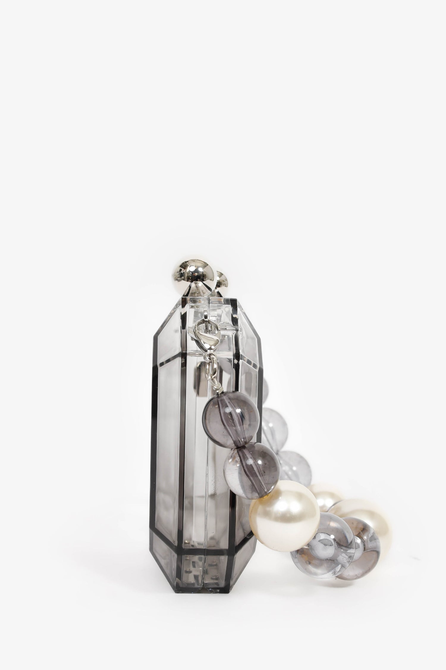 Refresh availabilityTheyknow Grey Acrylic Faux Pearl Mini Top Handle. Top magnetic closure. Single interior compartment. Detachable handle. Silver-tone hardware.
