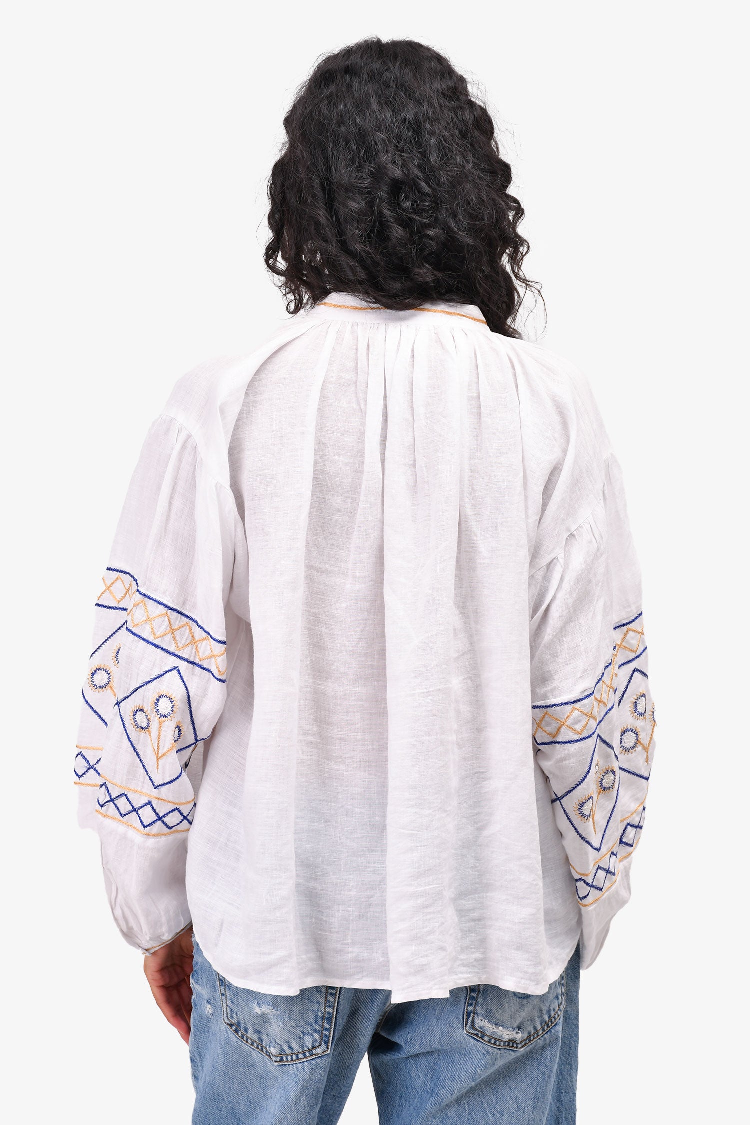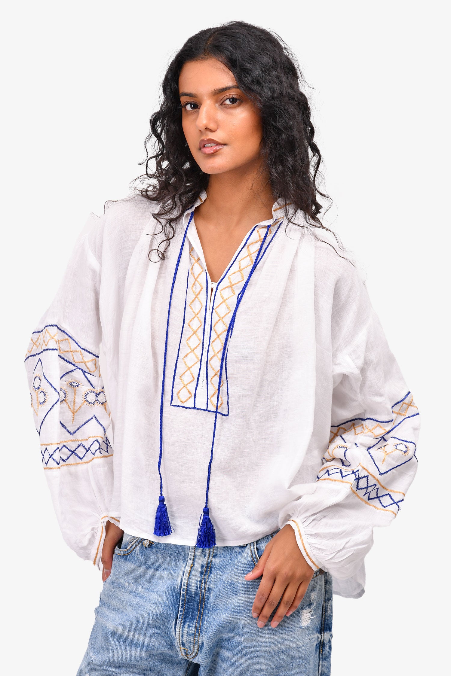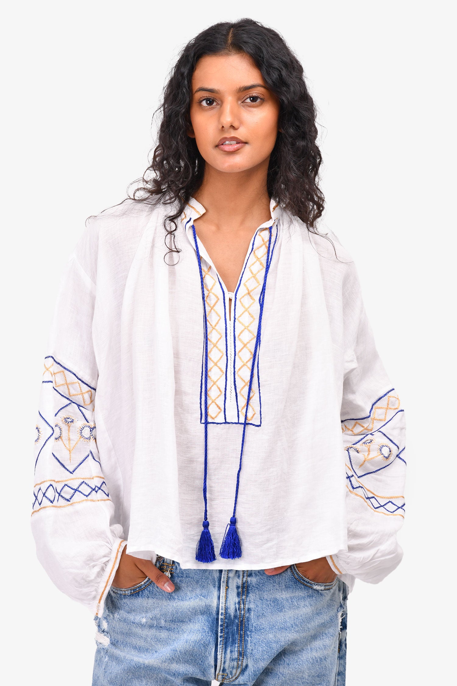 Refresh availabilityThierry Colson White Linen Tie Neck 'Guise' Blouse. Pull-on. Single front button closure. Button closure on the cuffs. Tassel detail on the neckline.