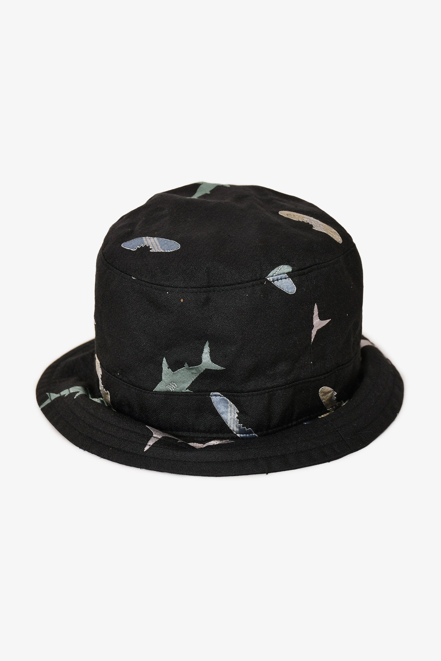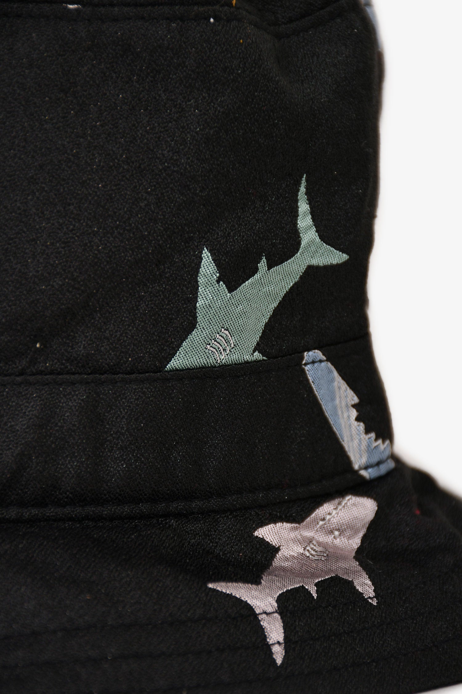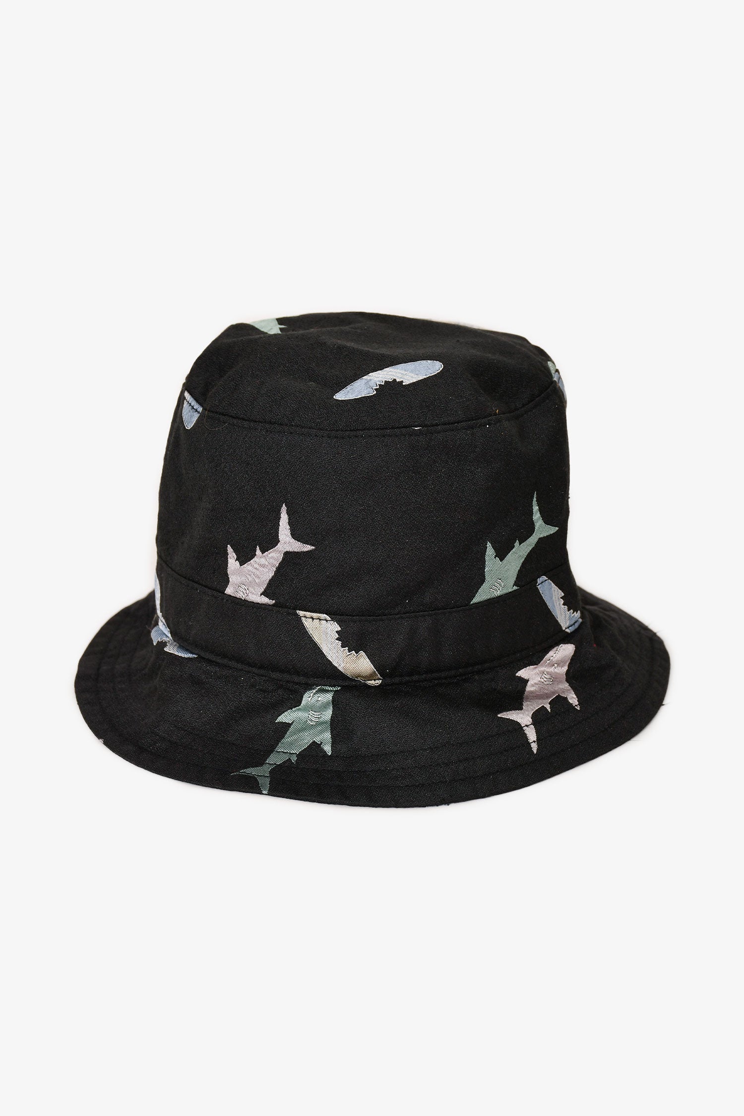 Refresh availabilityThom Browne Black Shark Pattern Bucket Hat. Classic bucket hat silhouette with stitched brim. Tonal stitching.