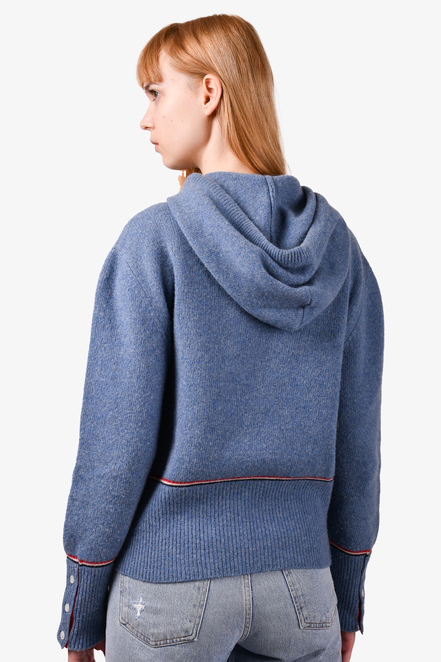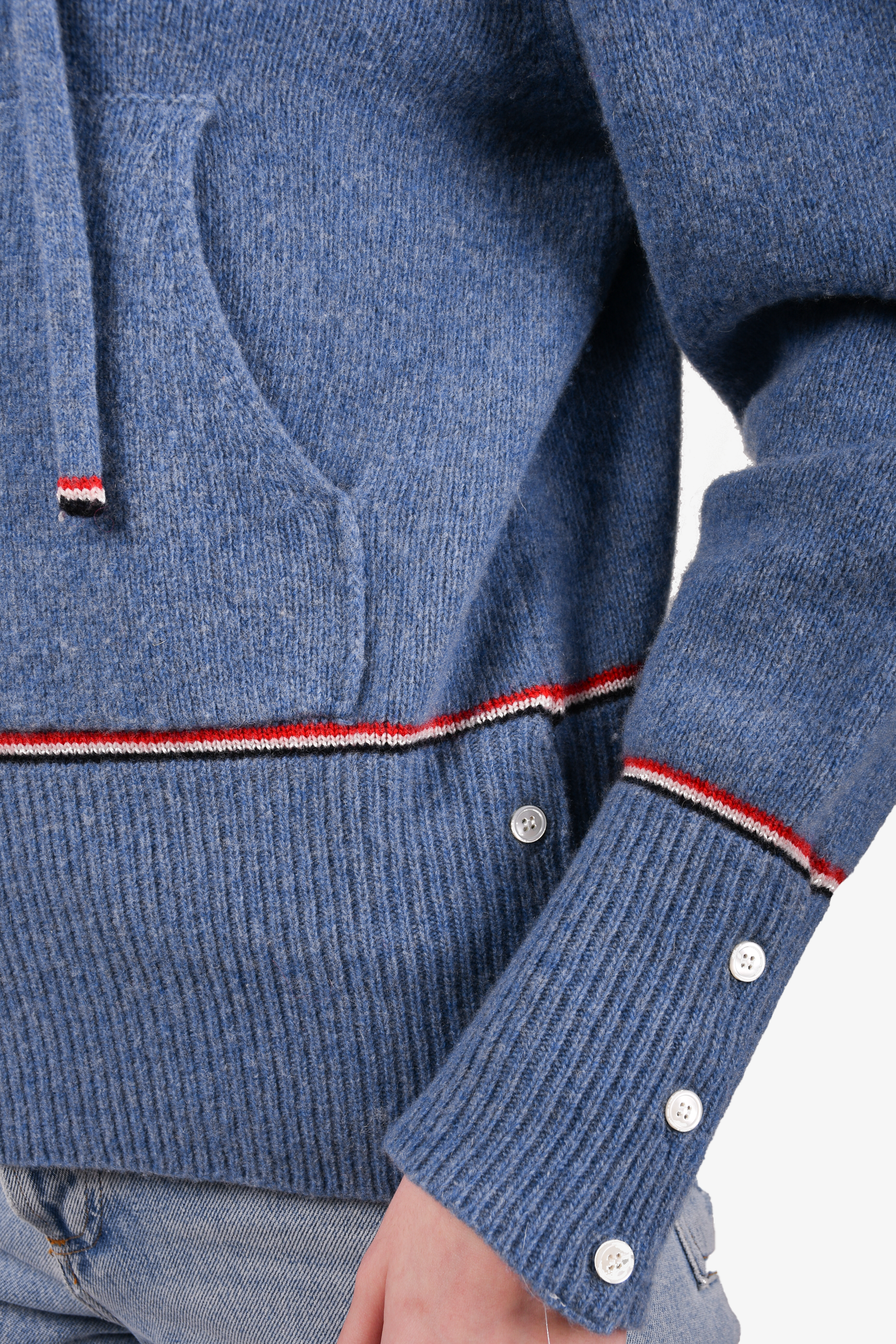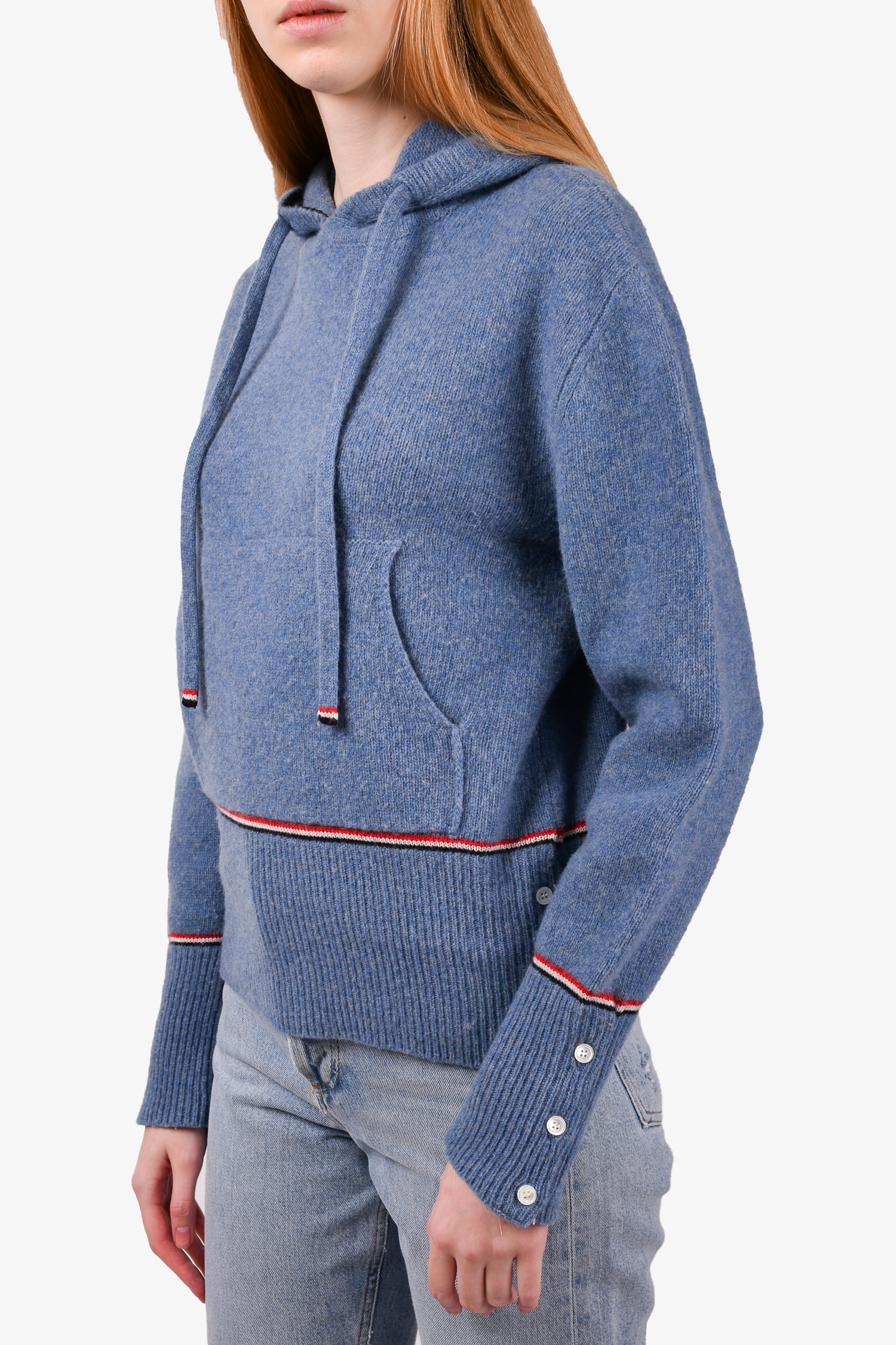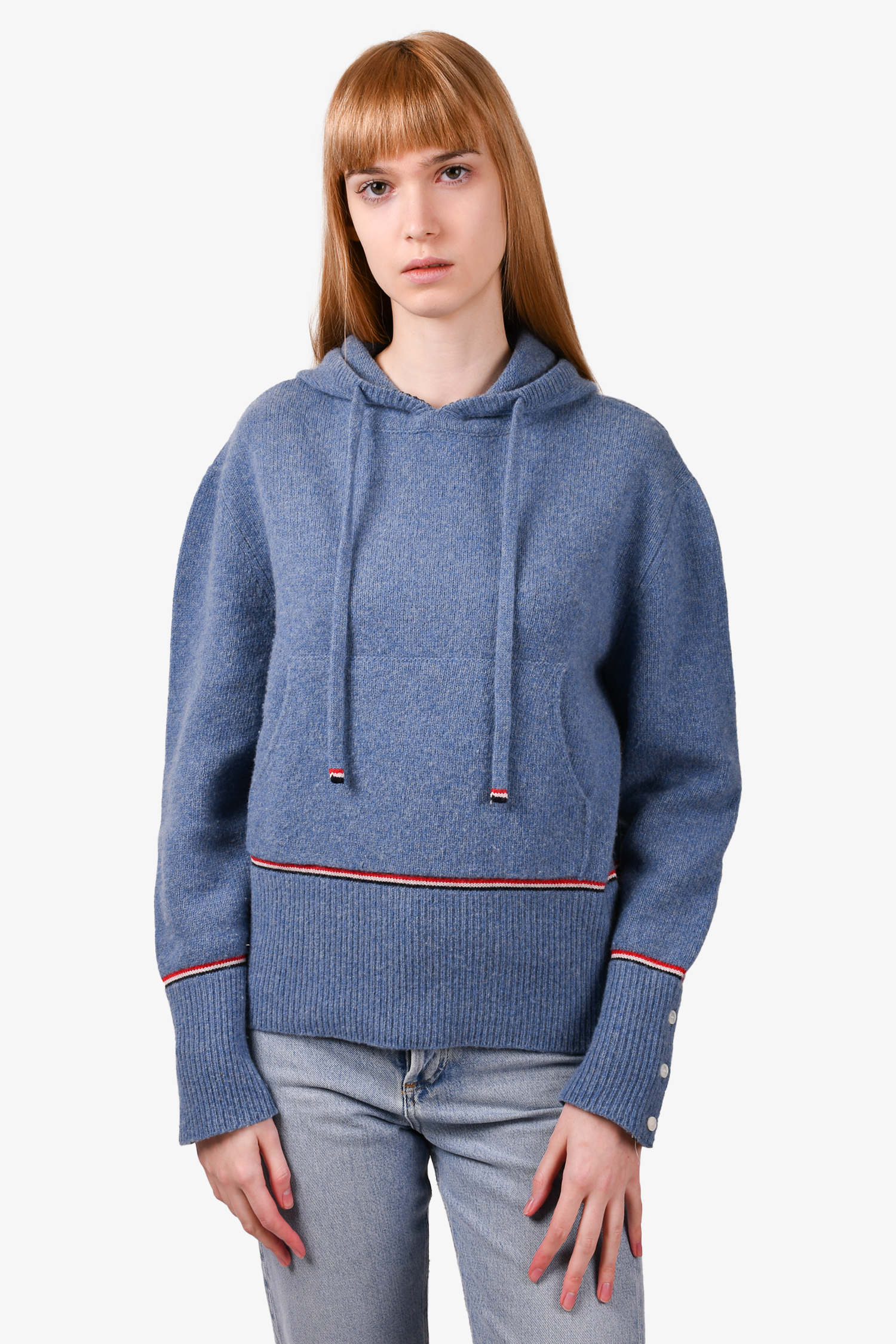 Refresh availabilityThom Browne Blue Wool/Cashmere Knit Hoodie. Pull over. Unlined. Buttons on the bottom of sleeve. Front pouch pocket. Adjustable hood. Tonal stitching.