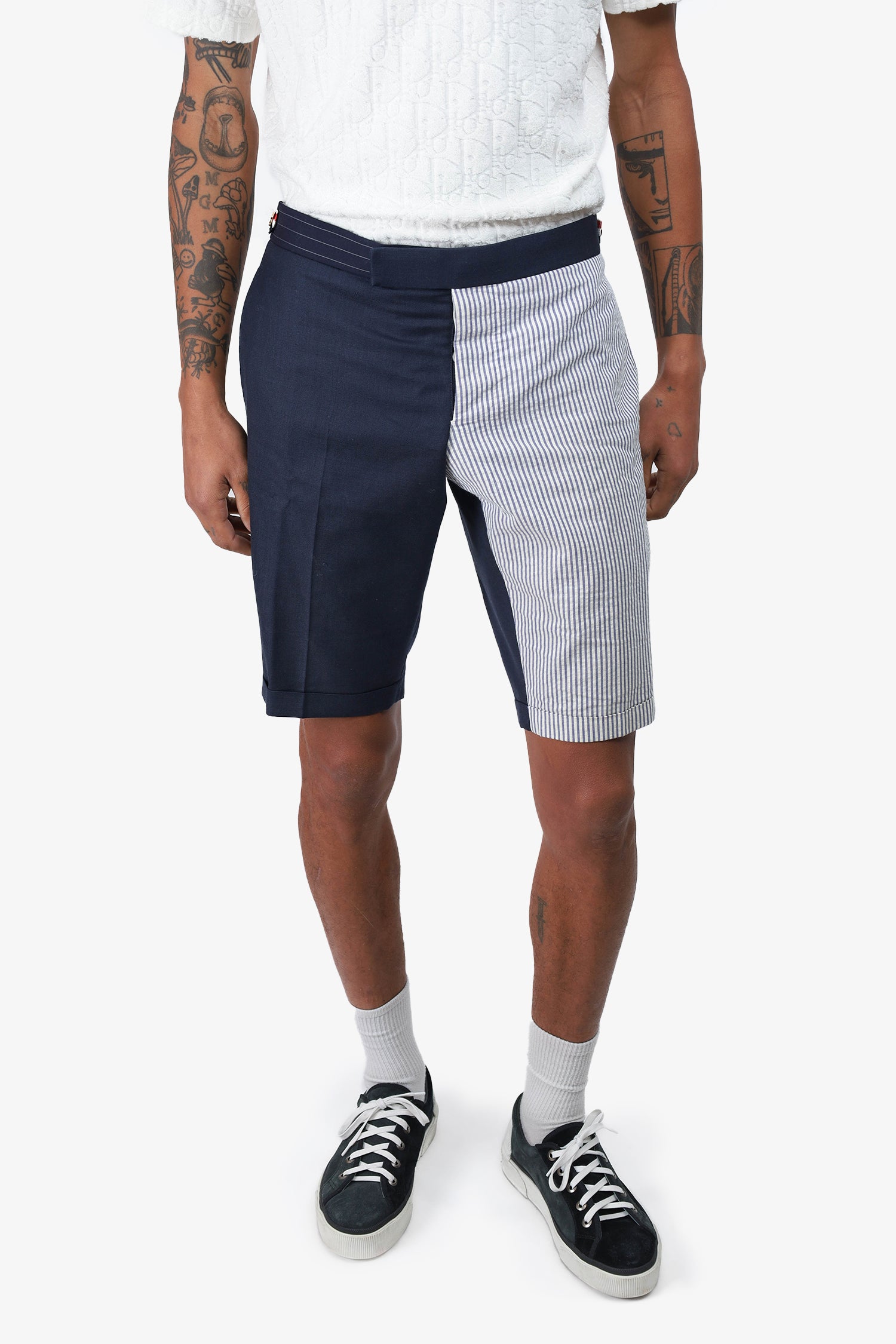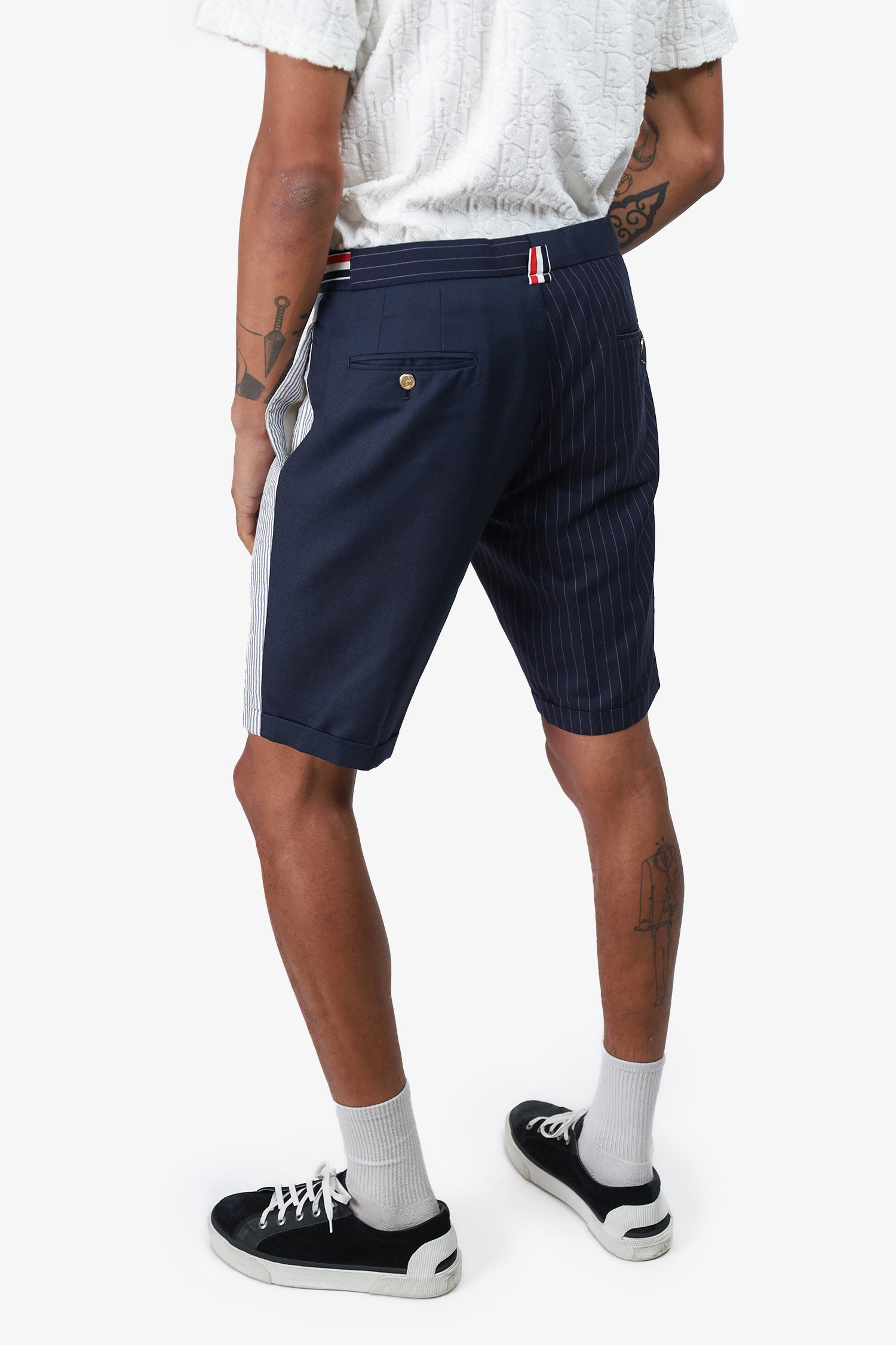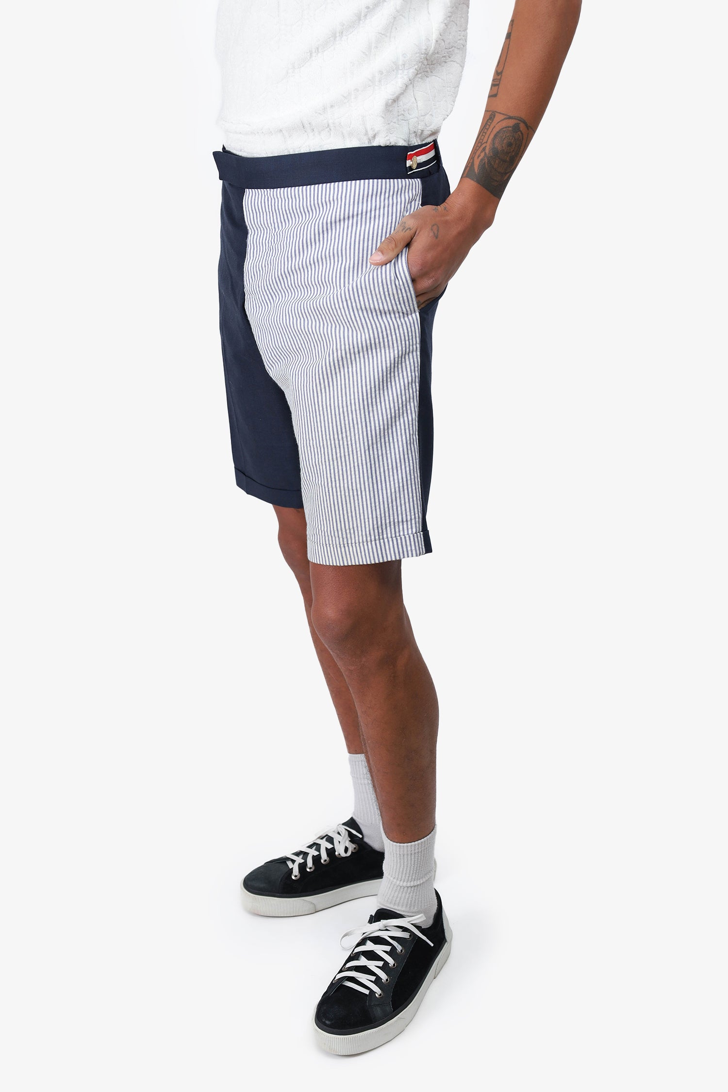 Refresh availabilityThom Browne Navy/White Striped Two-Tone Shorts. Front button-up with double hook closure. 2 front slip pockets and 2 rear slip pockets with button. Fold-over pant leg detail. Adjustable button strap on both sides of waist. Gold-tone hardware. Lined. Tonal stitching.