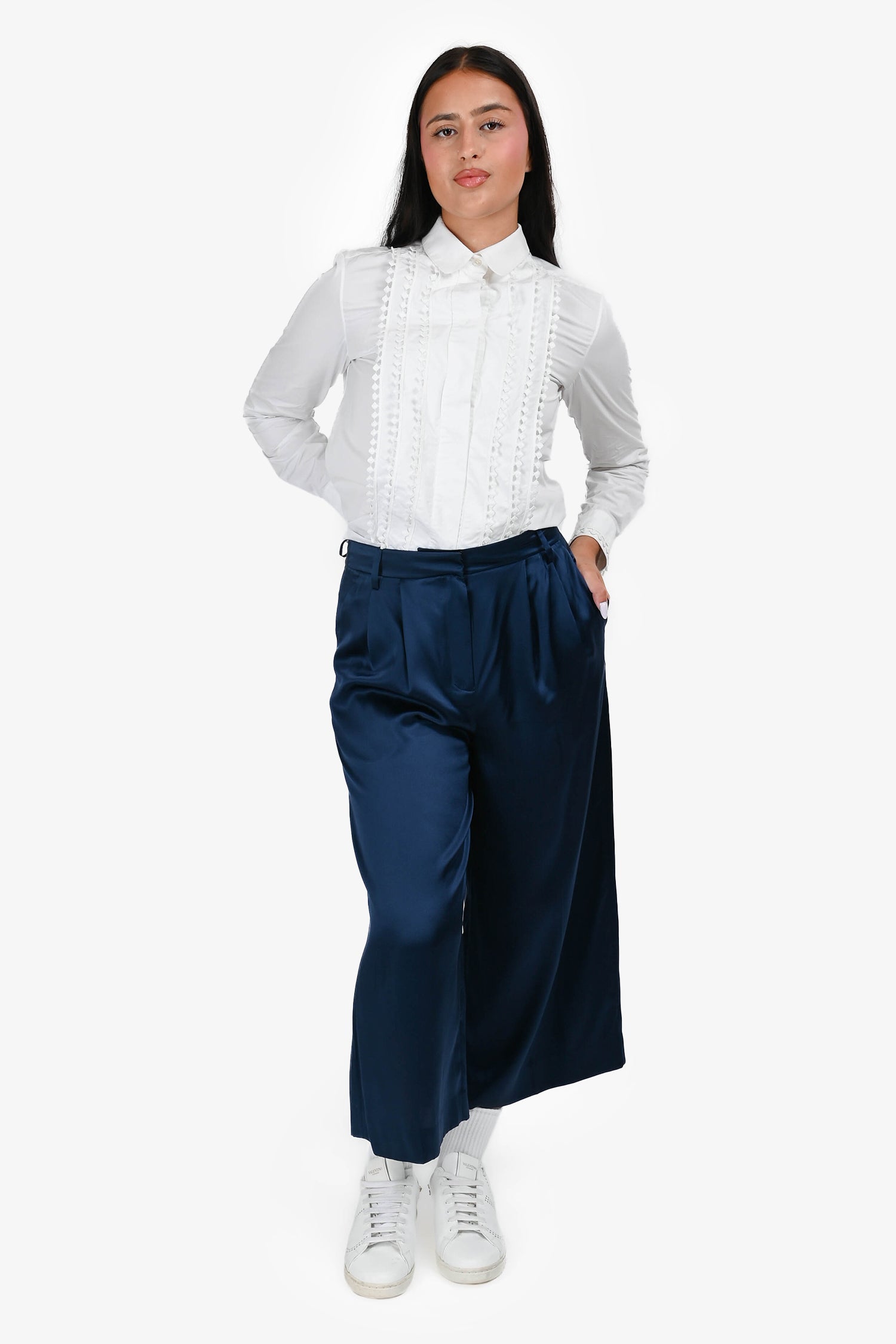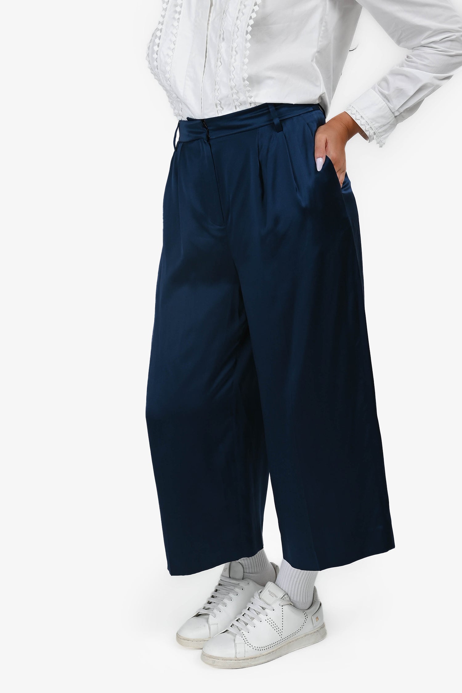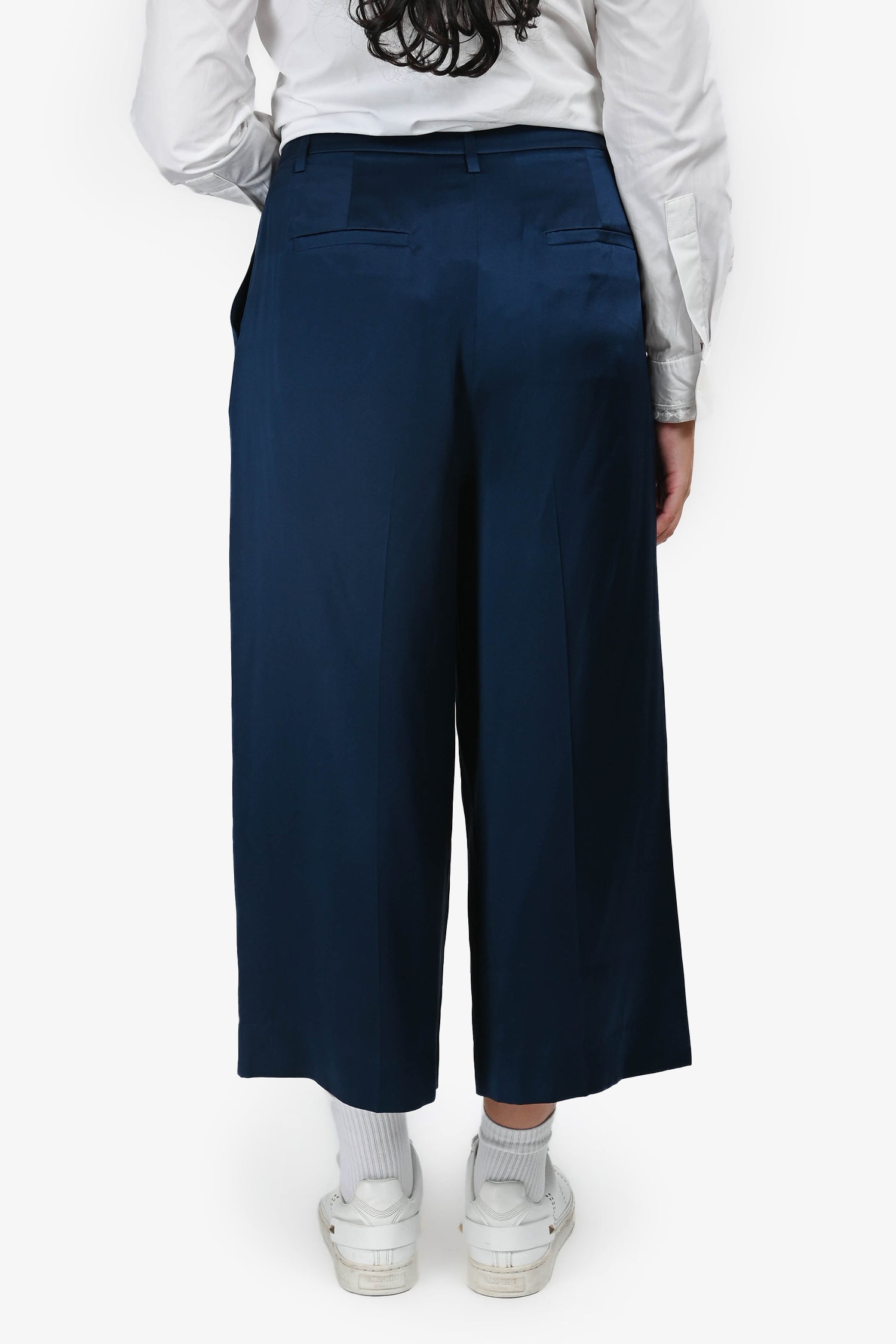 Refresh availabilityTibi Navy Satin Cropped 'Stella' Pants. Front zip, hook and button closures. Waist belt loop. Front and rear pockets.