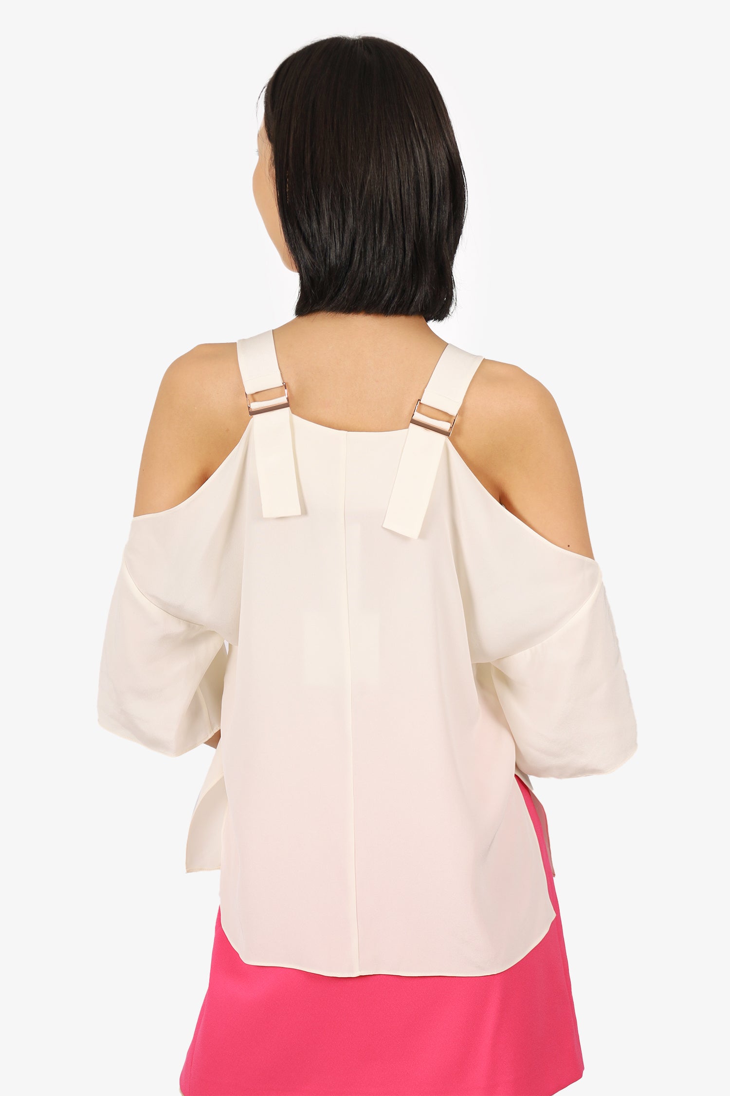 Refresh availabilityTibi White Buckled Strap Top. Pull-on. V-neckline. Cold-shoulder design. Adjustable shoulder straps with buckle closure. Bottom side slits. Rose gold-tone hardware. Tonal stitching.