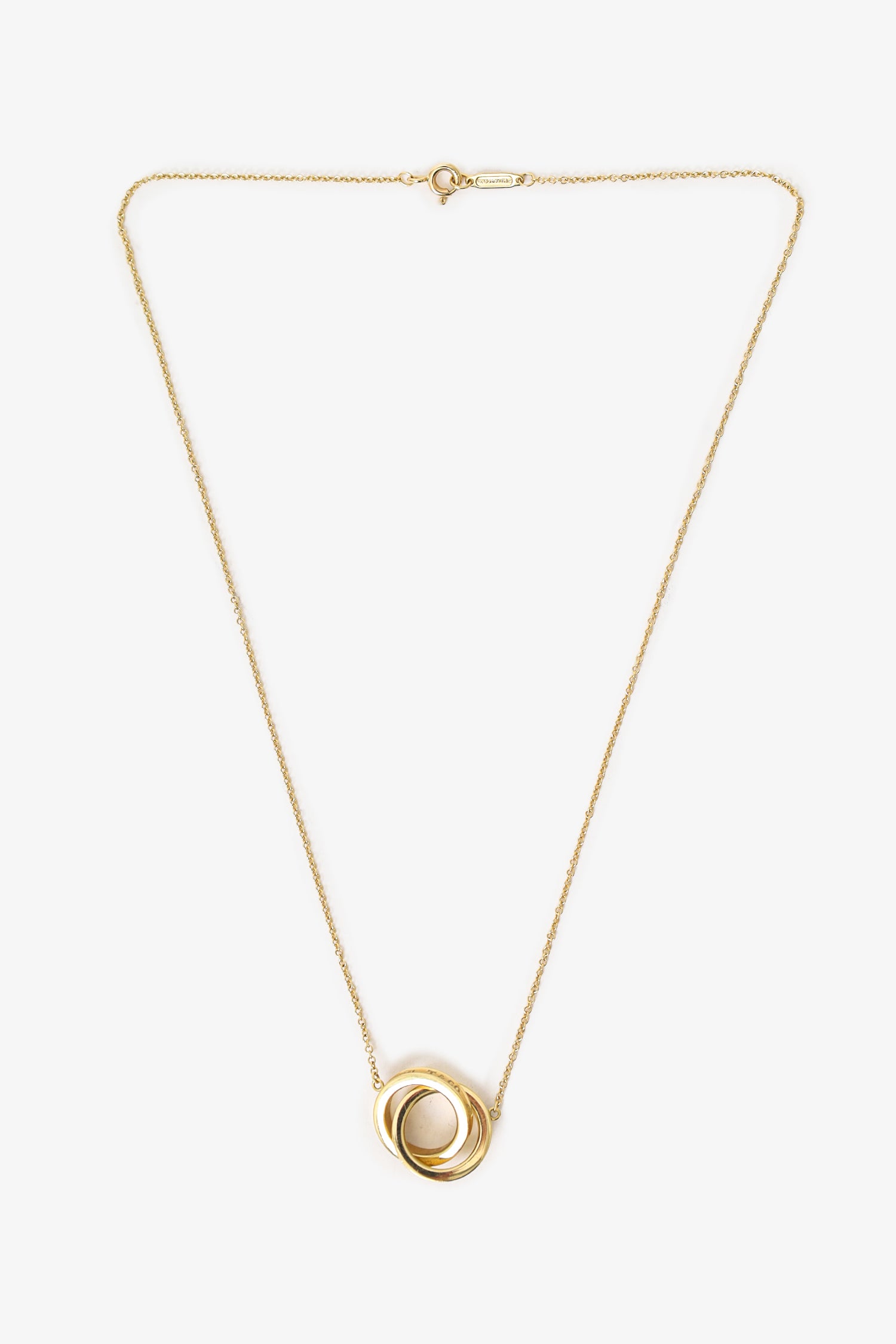 Refresh availabilityTiffany & Co 18K Gold Interlocking Circles Necklace. Rear lobster-clasp closure. Gold-tone hardware.