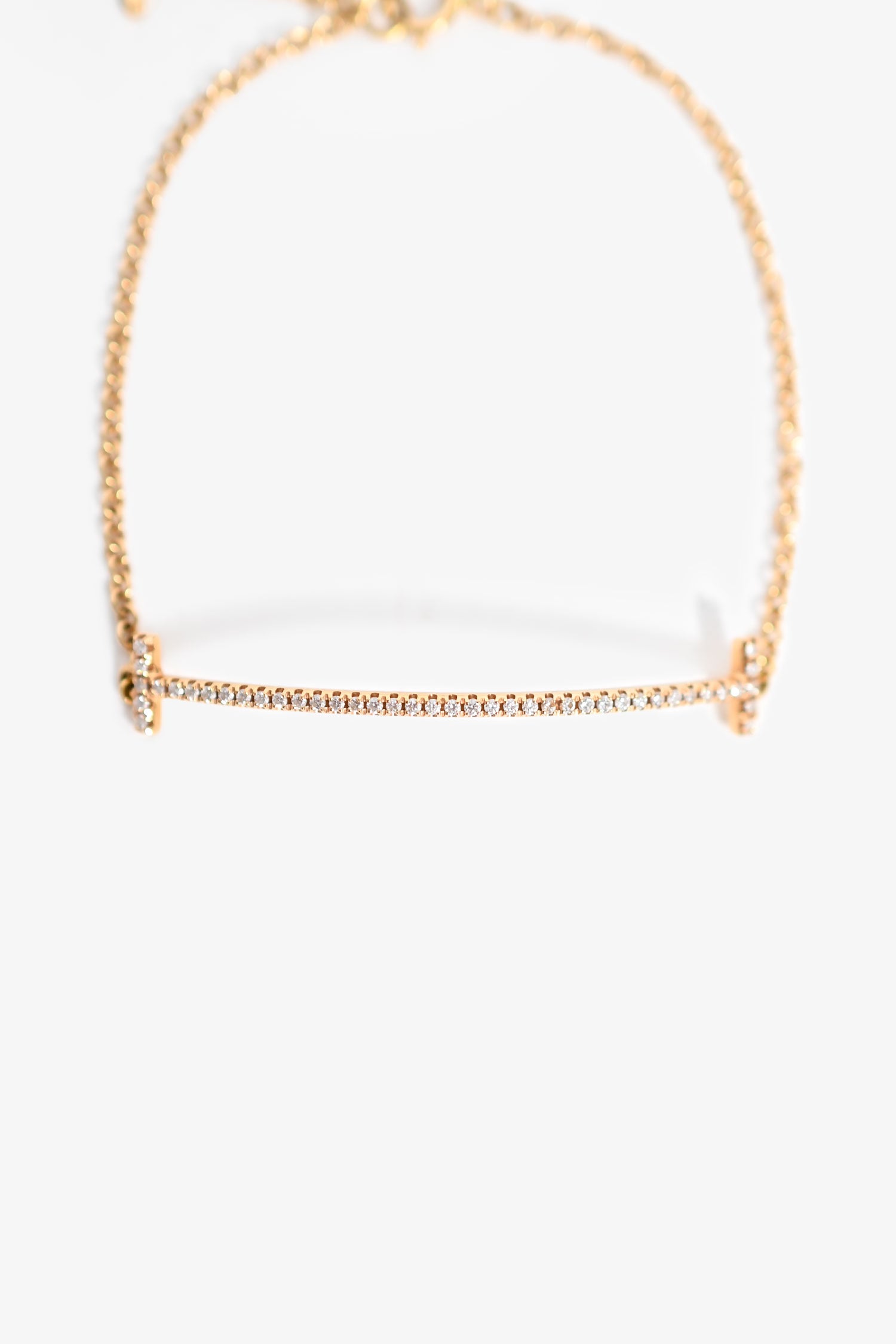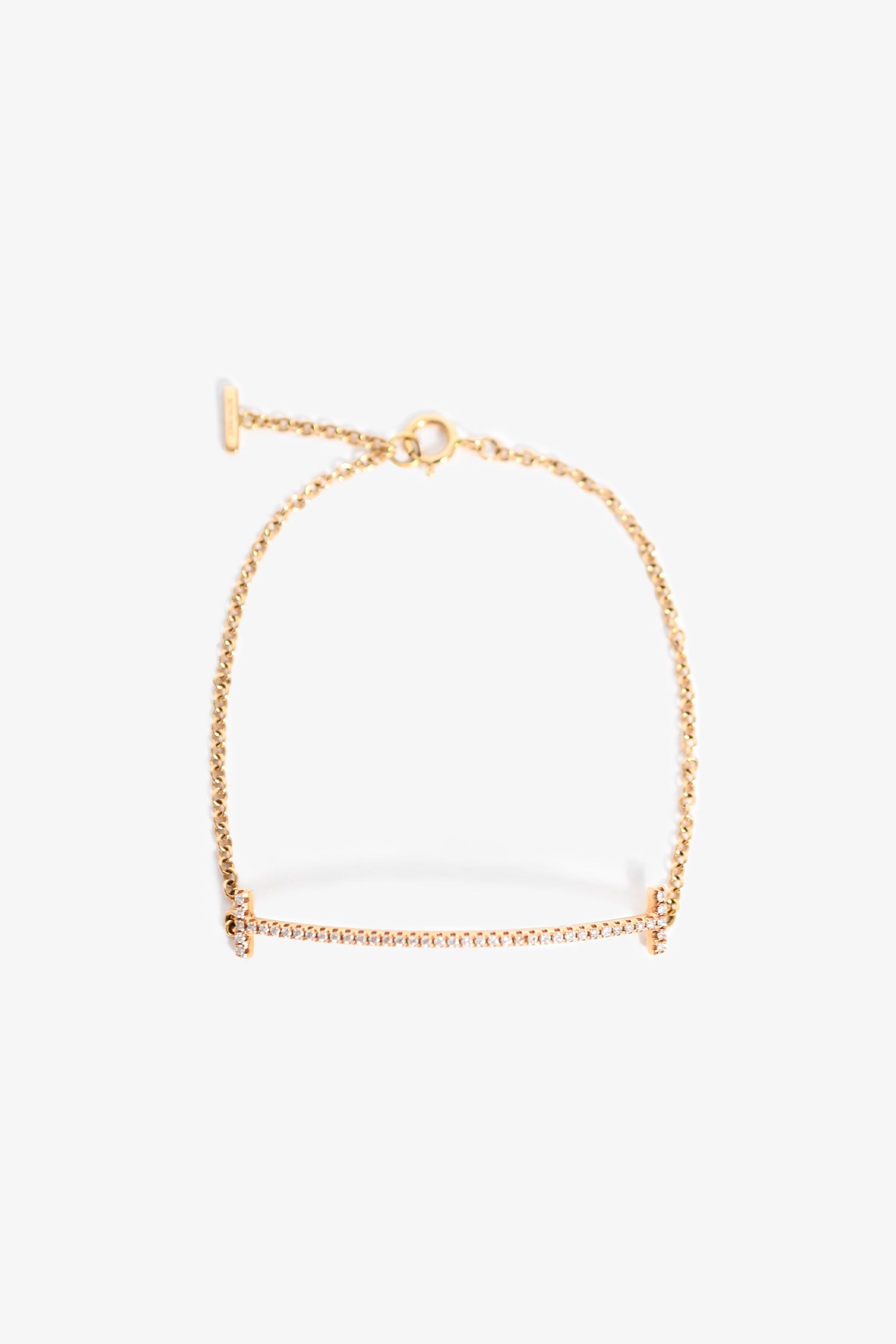 Refresh availabilityTiffany & Co. 18K Yellow Gold Diamond Set Tiffany T Bracelet. Cable-link wristlet chain. Spring ring closure. Pave-set diamonds in a 'T'. Bar drop.
