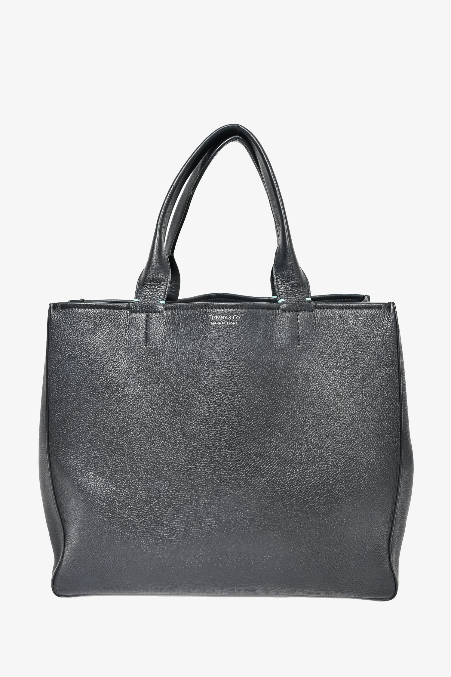 Tiffany & Co. Black Leather Tote. Dual rolled handles. Tonal interior. 3 interior compartments; 2 open and 1 with zip closure. Single interior wall slip pocket. Silver-tone hardware. Tonal stitching.