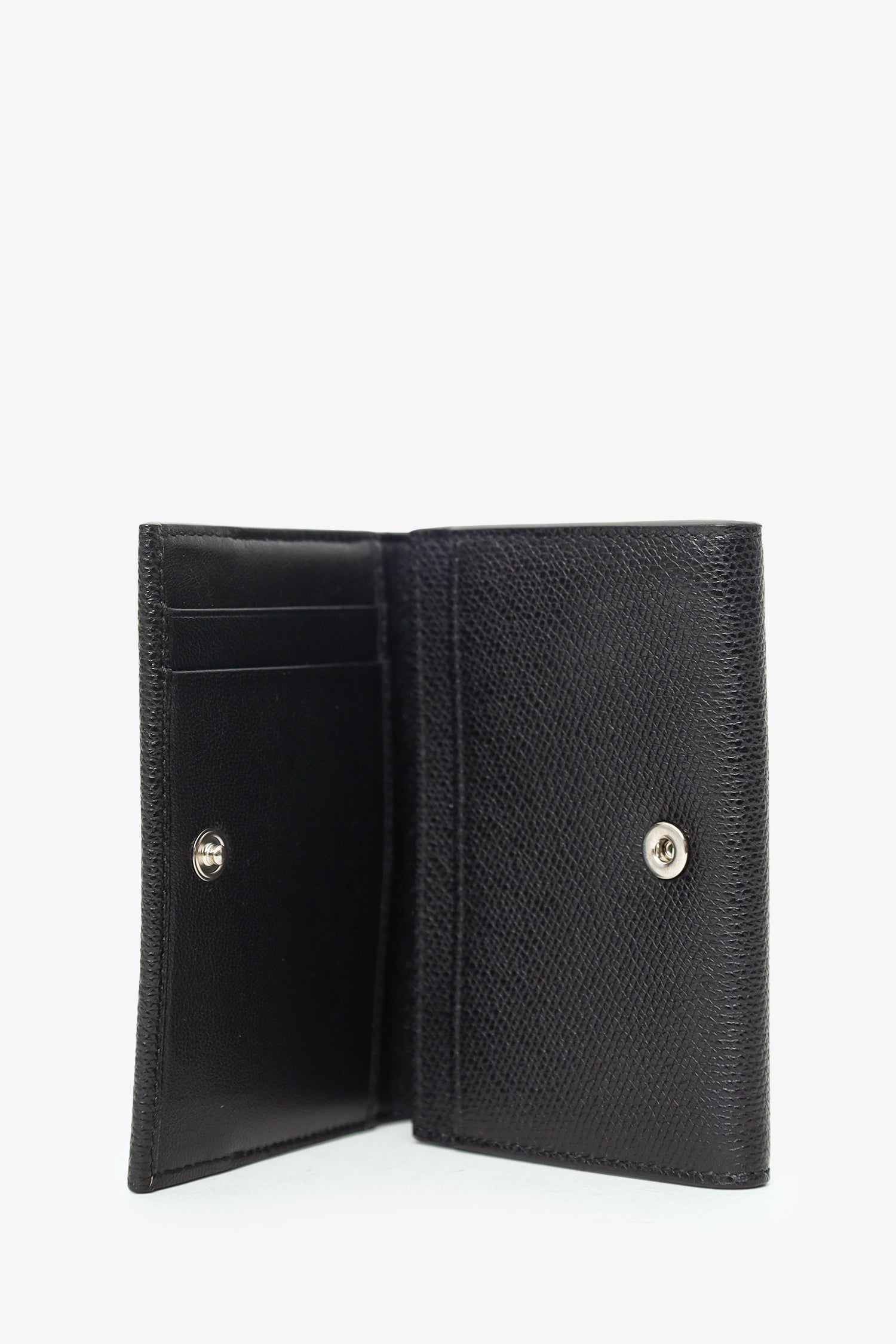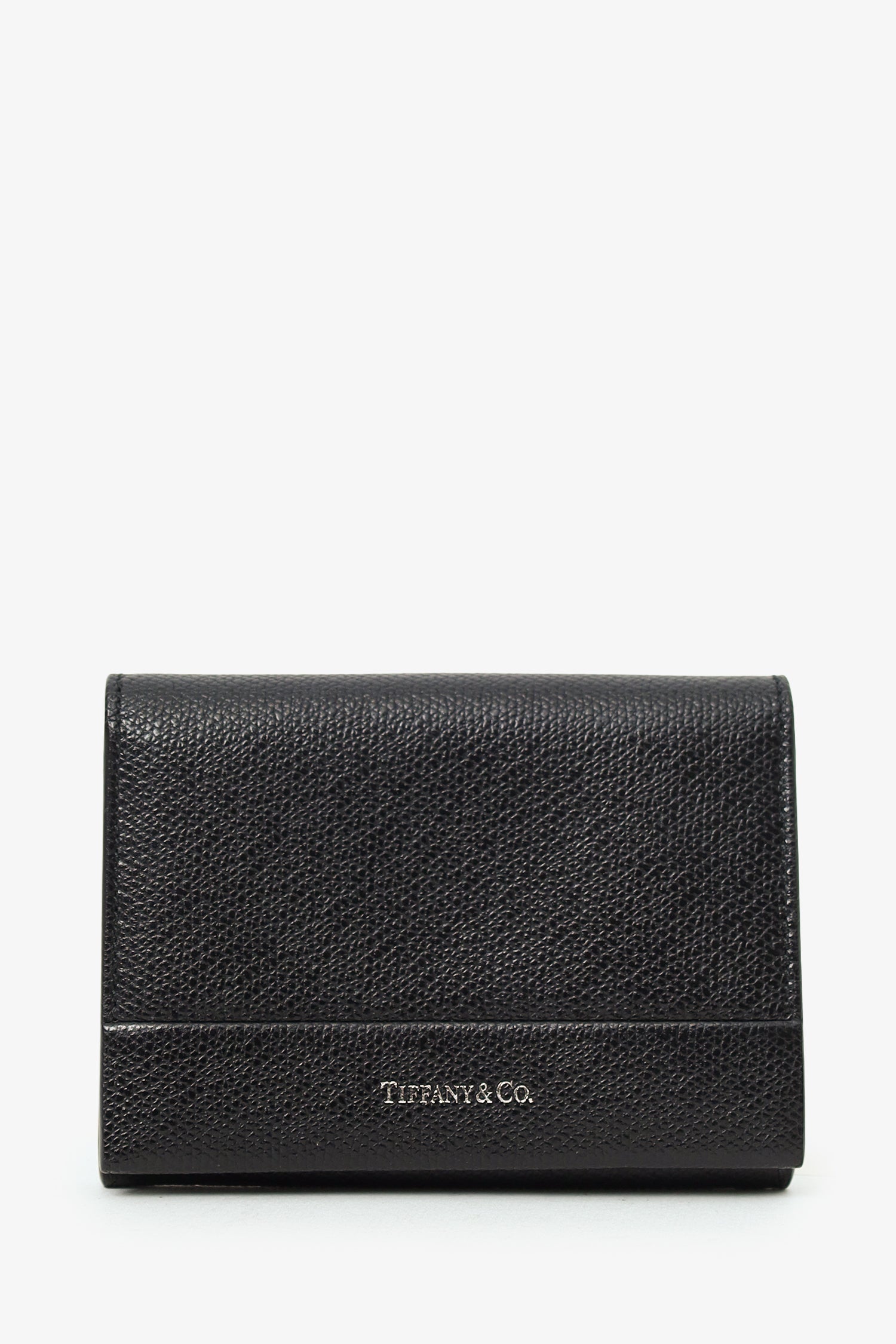 Refresh availabilityTiffany & Co Black Leather Wallet. Front fold-over flap with snap-button-up closure. Single rear exterior slip pocket. Lined interior with 5 pockets; 3 slip, and 2 card slots. Silver-tone hardware. Tonal stitching.