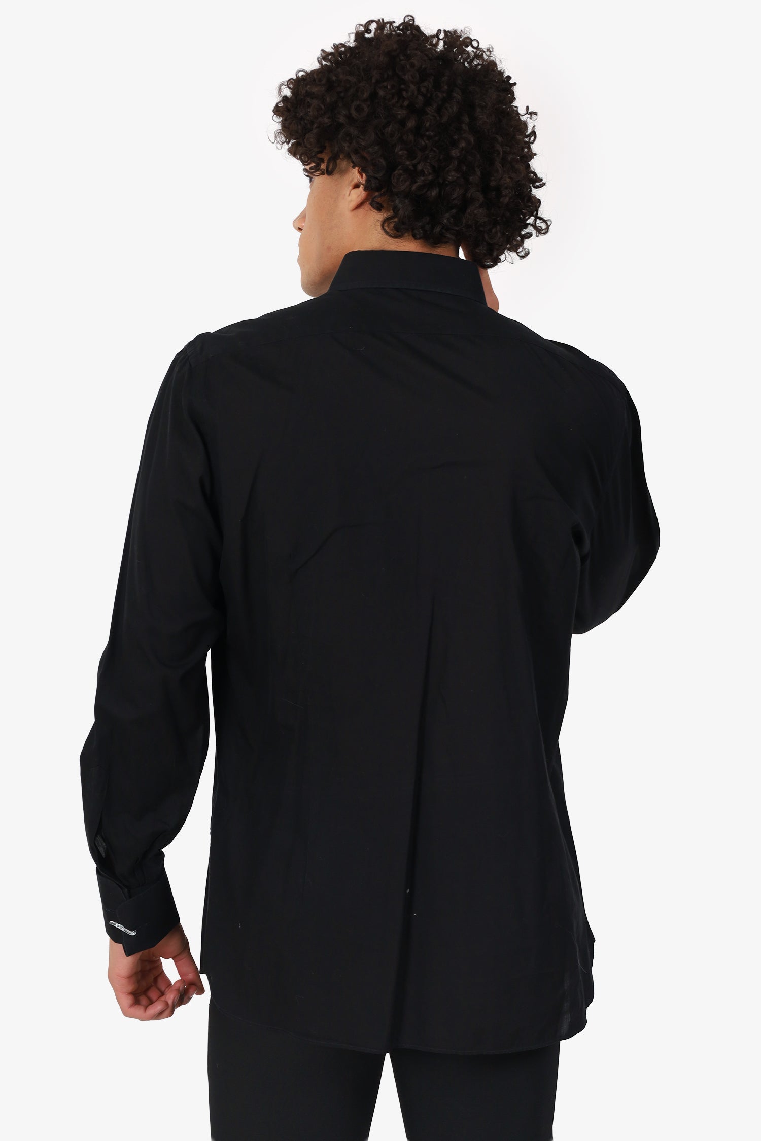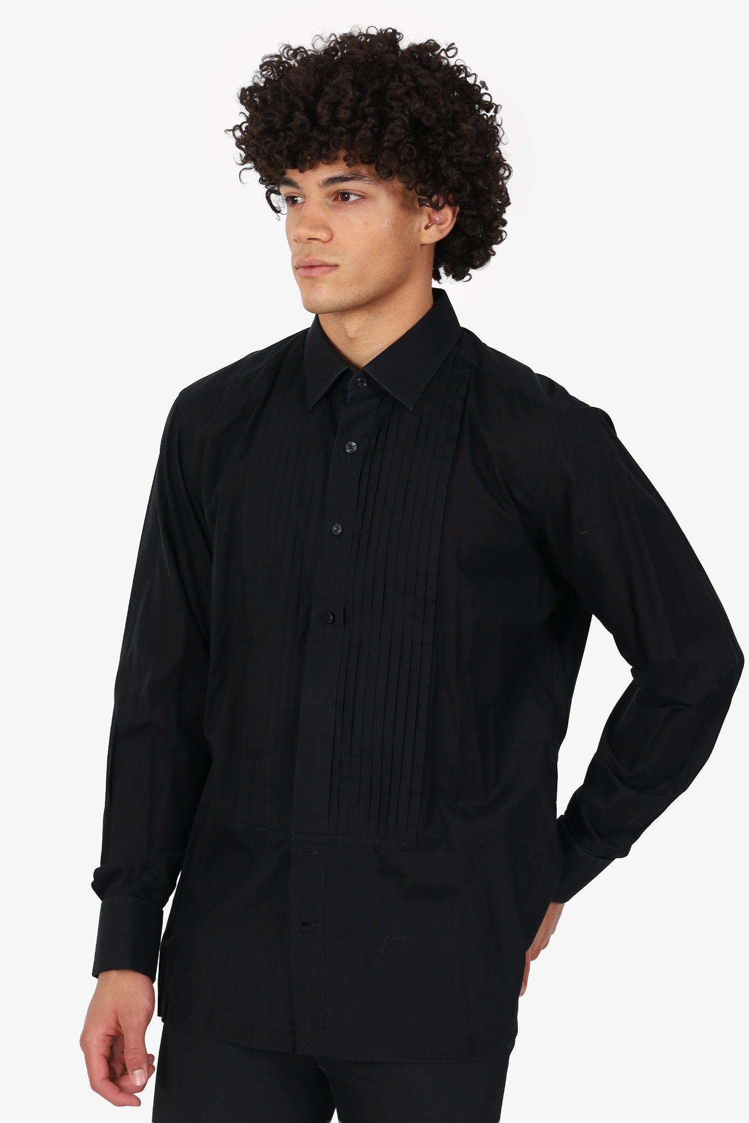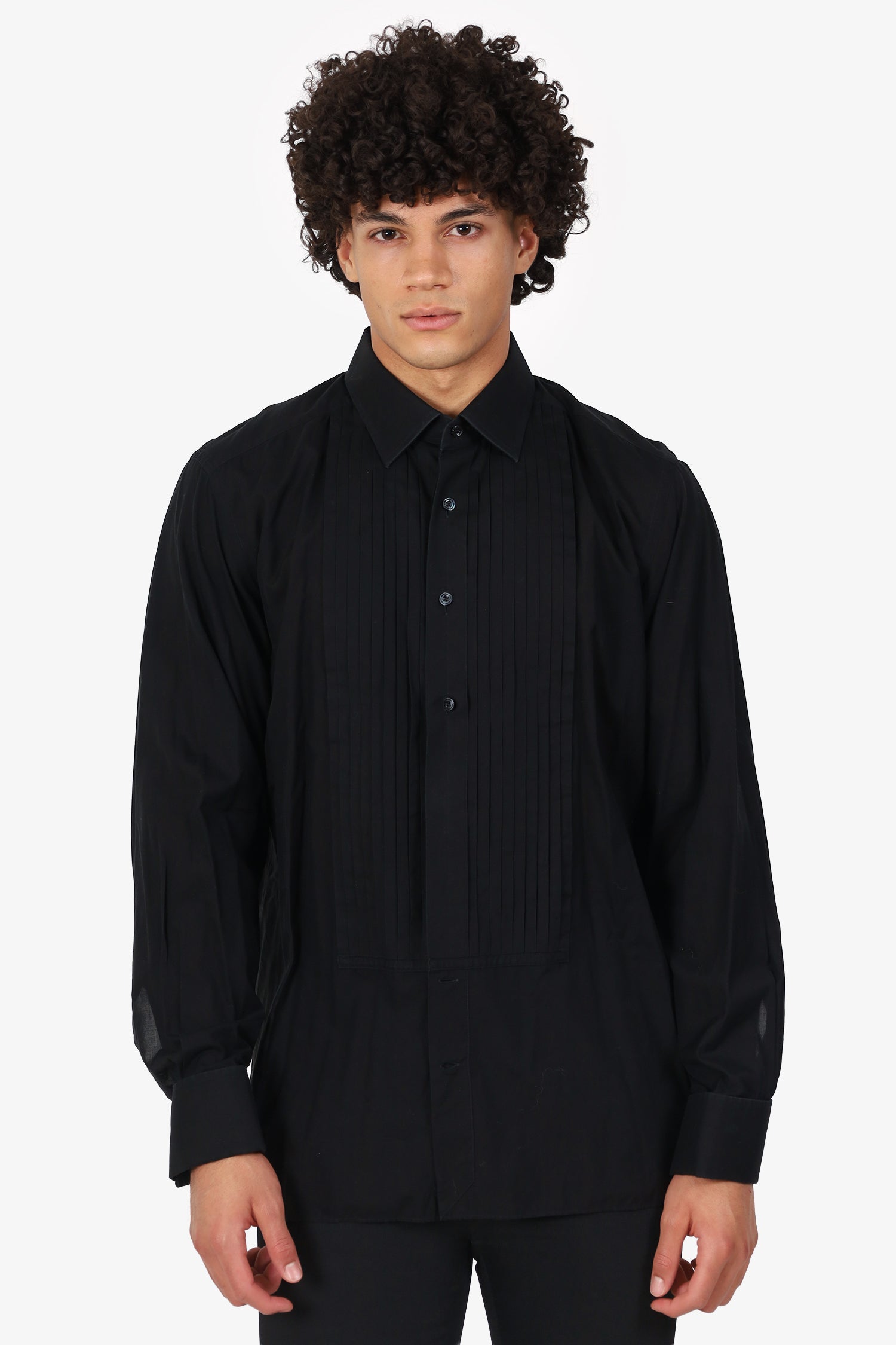 Refresh availabilityTom Ford Black Cotton Pleated Tuxedo Shirt. Collared neckline. Front button-up closure. Sleeve cuffs with button-up closure. Tonal stitching.