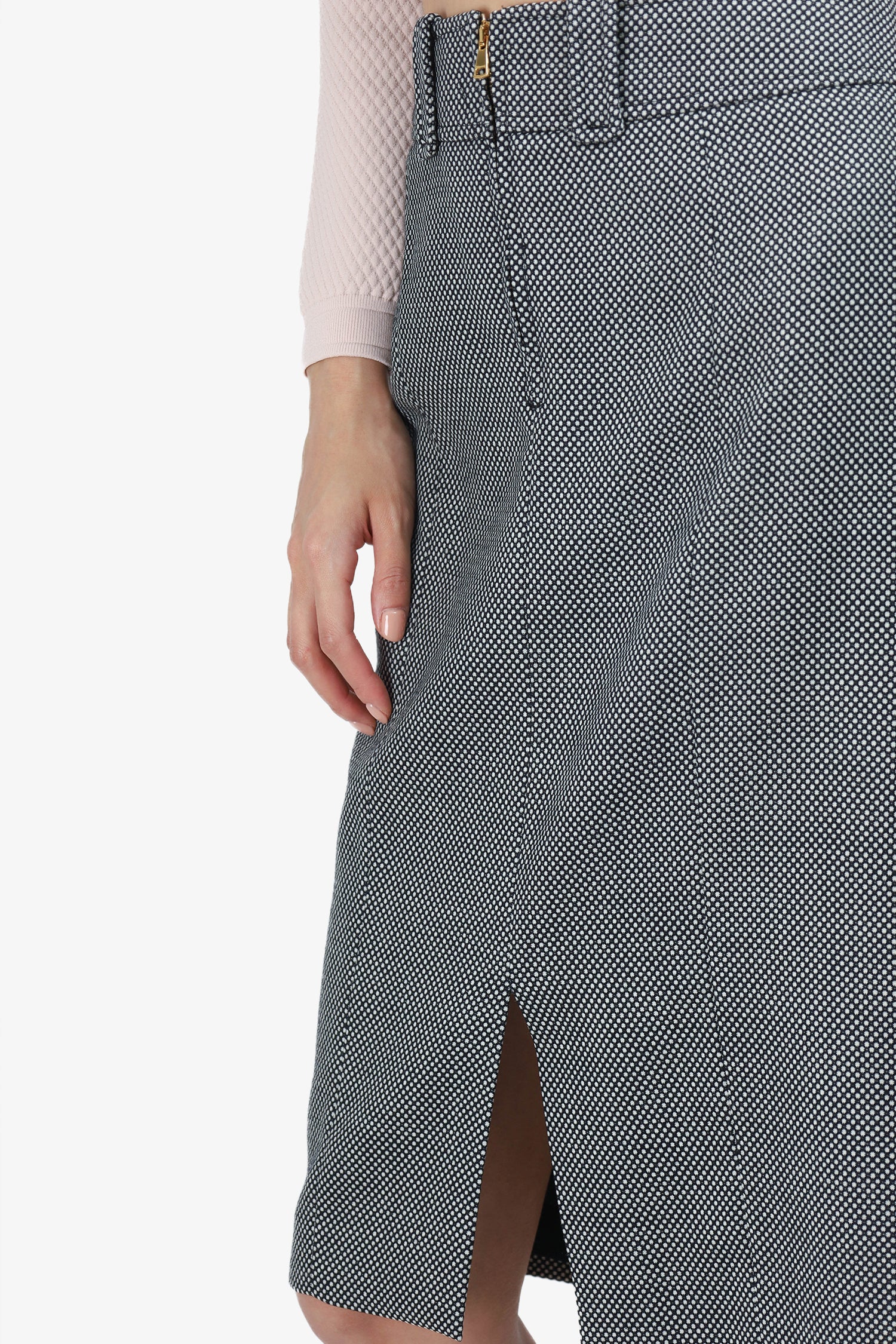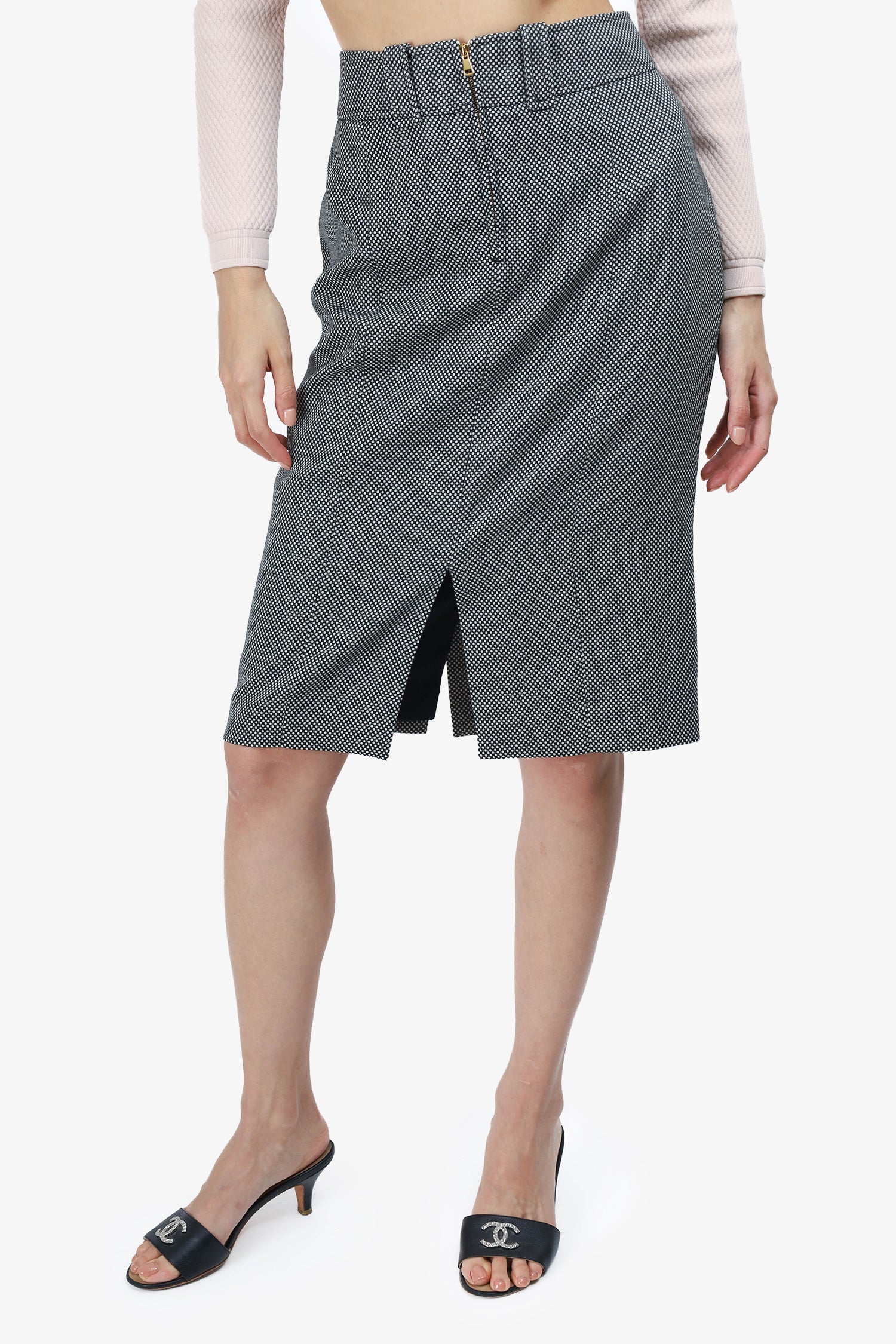 Refresh availabilityTom Ford Black/White Wool Knee Length Pencil Skirt. Slip-on. Front zip with single button closure. Waist belt loops. Front slit at bottom hem. 2 rear pockets with snap-button closure. Rear vent. Lined. Gold-tone hardware. Tonal stitching.