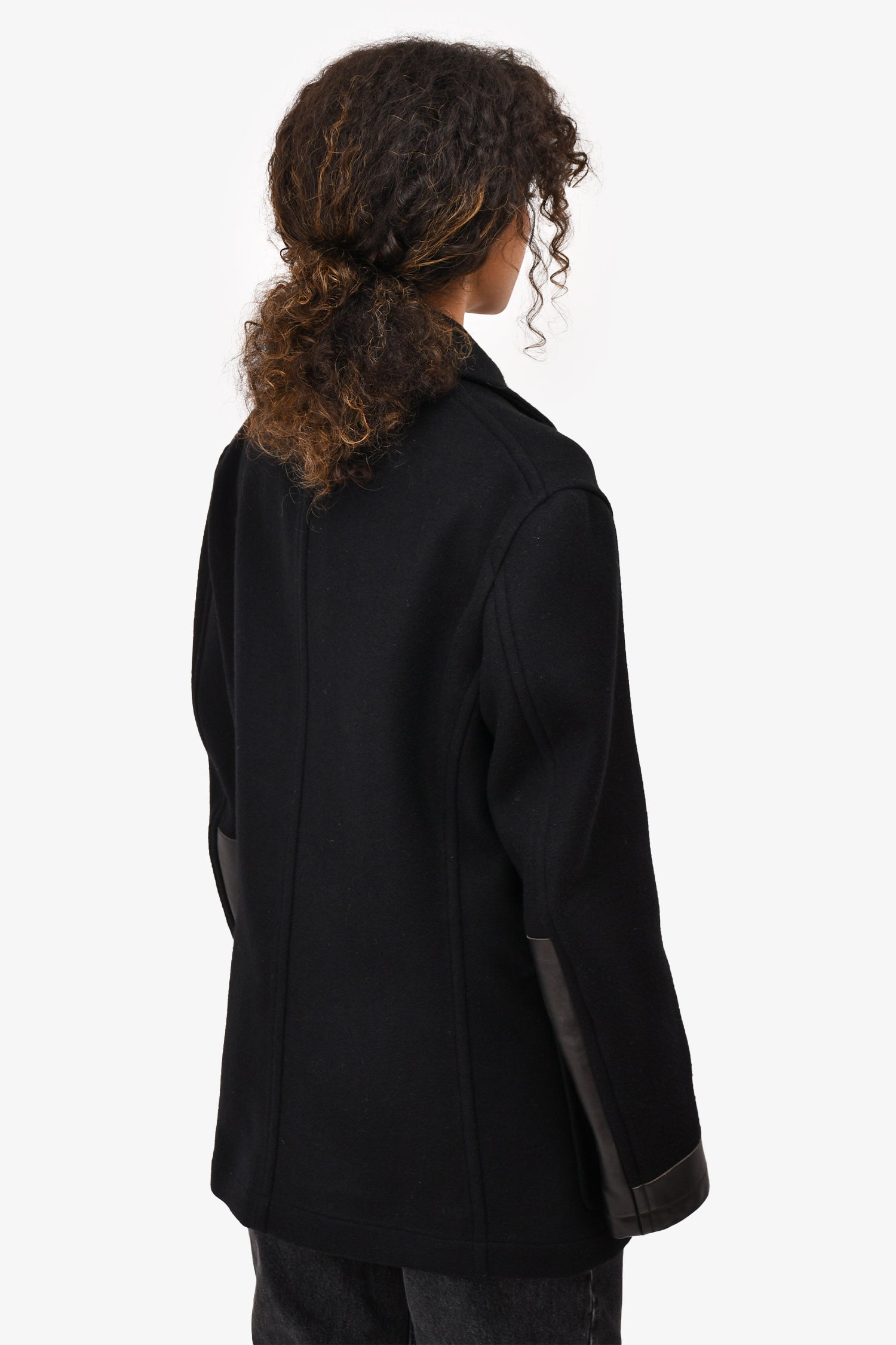 Refresh availabilityTom Ford Black Wool Button/Zip Collared Coat Mens. Silver-tone hardware. Top zipper closure with buttons. Two front pockets. Leather detailing on the sleeves. Interior pocket. Tonal stitching.