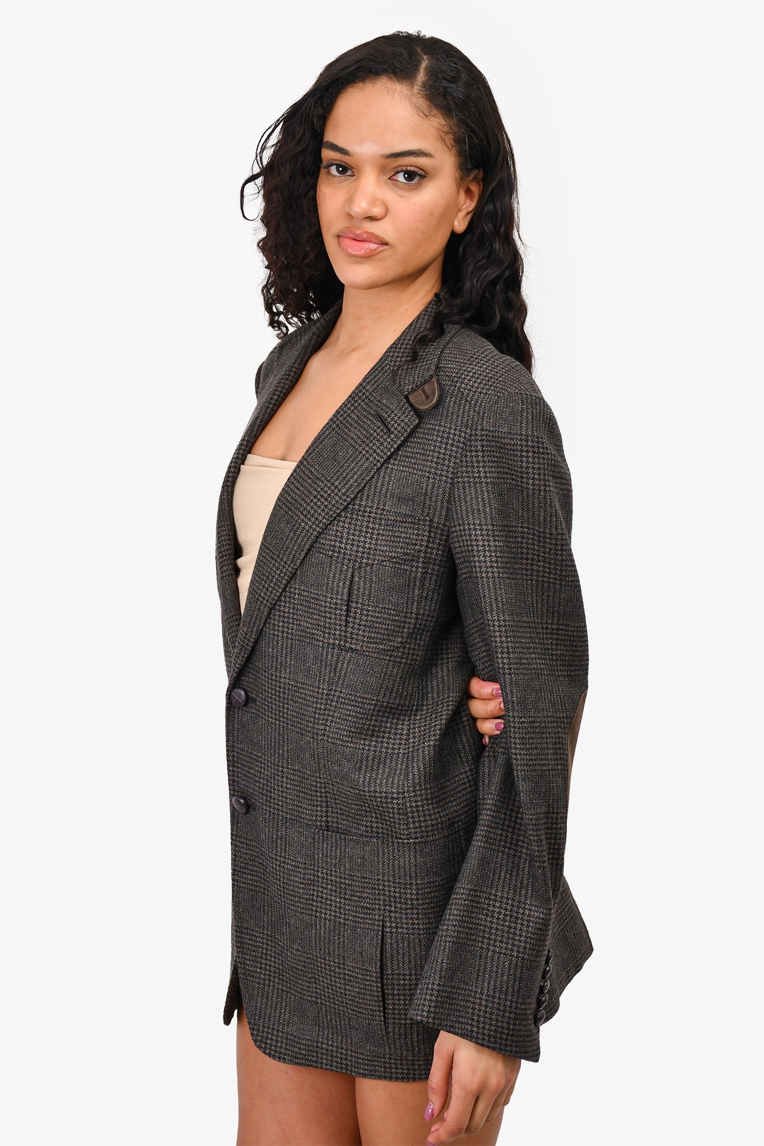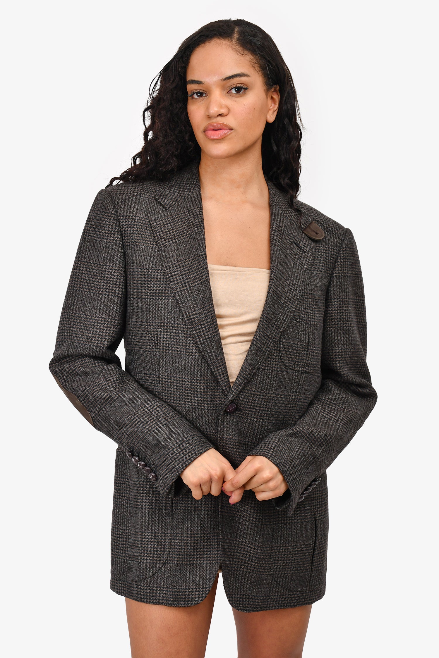 Refresh availabilityTom Ford Brown Plaid Wool Single Breasted Blazer. Front button-up closure. Front pockets. Lined. Padded shoulders. Button closures on the cuffs.