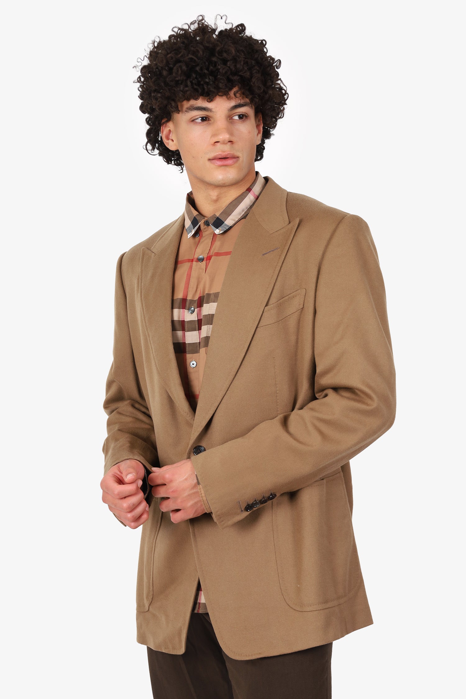 Refresh availabilityTom Ford Camel Cashmere Blazer. Pull-on. Peak lapel. Front button-up closure. Sleeve cuffs with button-up closure. 2 exterior front slip pockets. 4 interior slip pockets. Single rear vent. Tonal stitching.