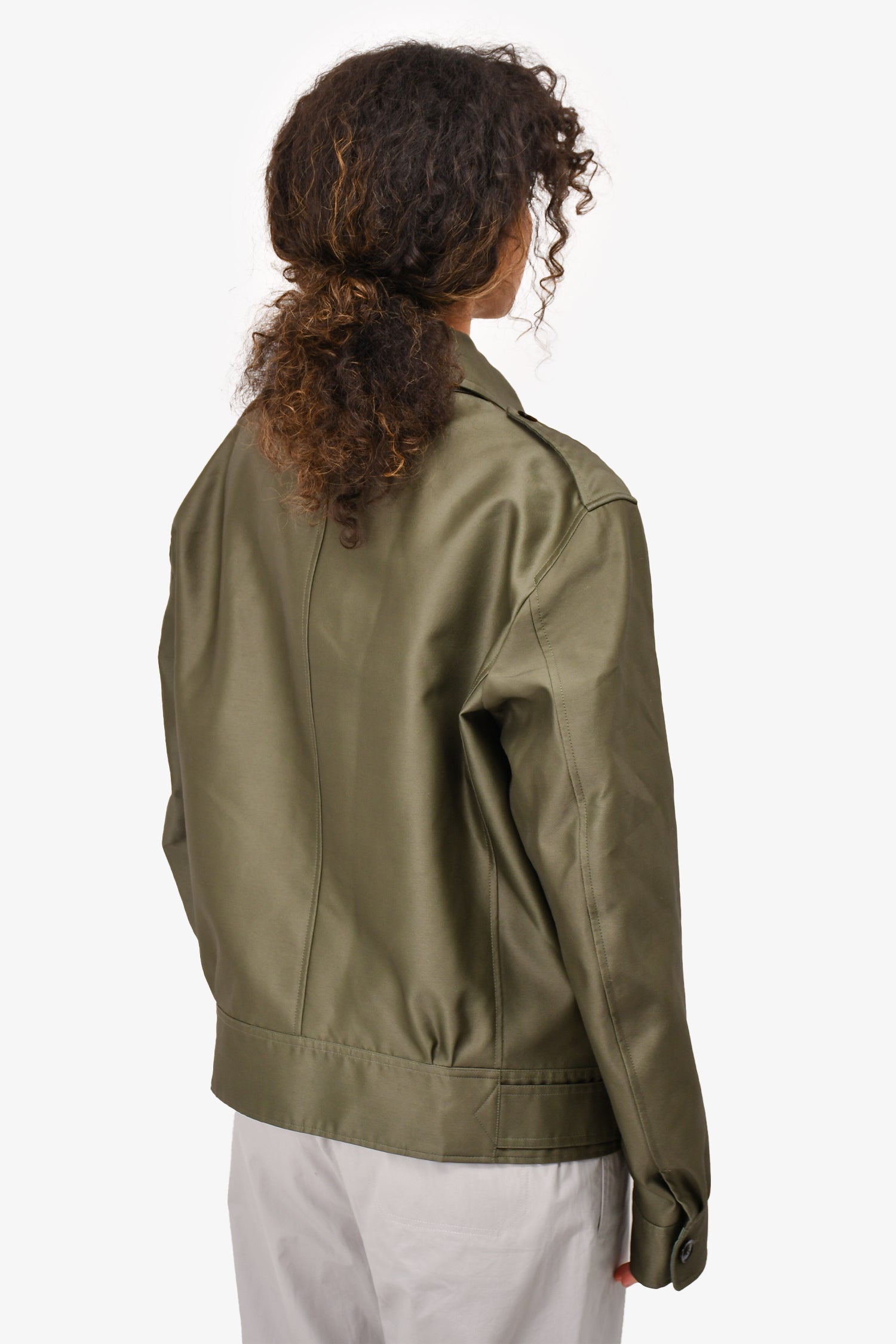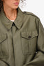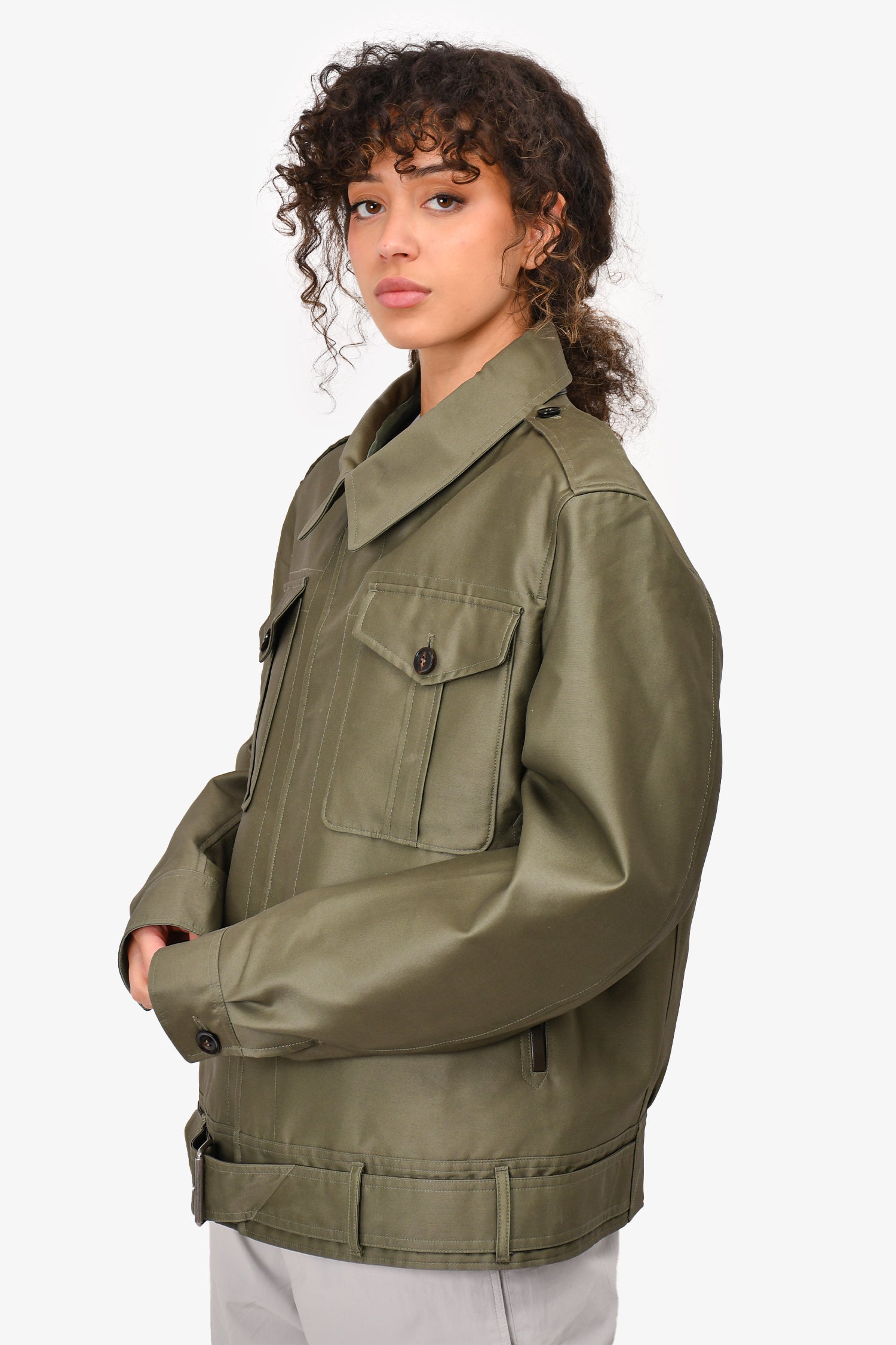 Refresh availabilityTom Ford Dark Green 'Battle' Jacket. Front button up closure. Waist belt loop. Silver-tone hardware. Front chest pockets with button up closures. Lined. Tonal stitching.