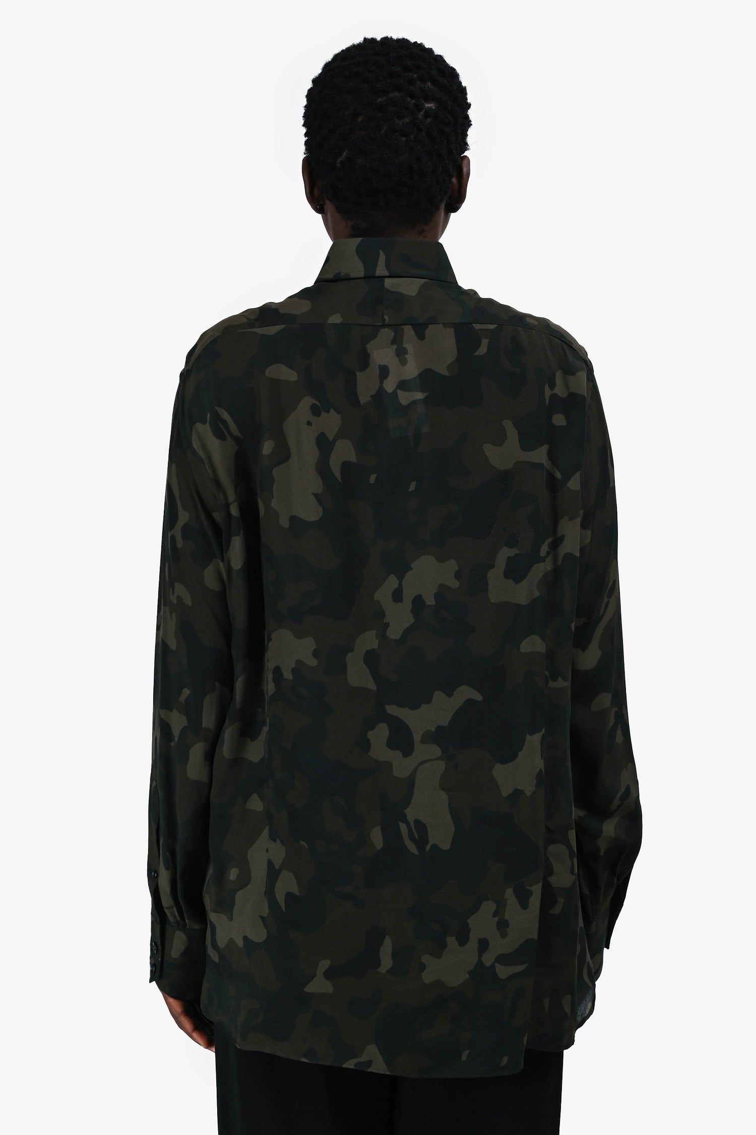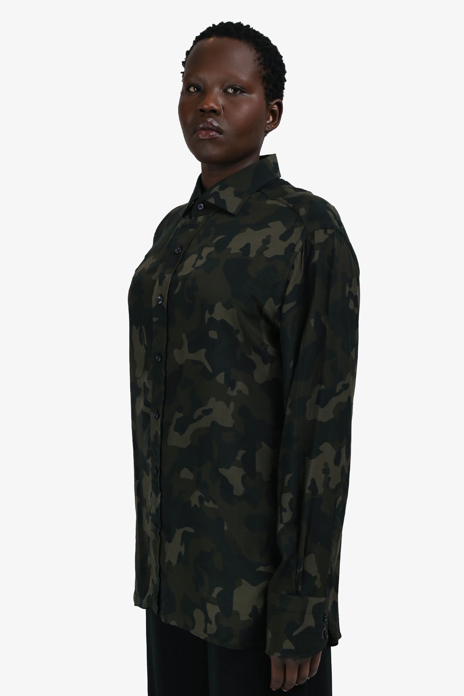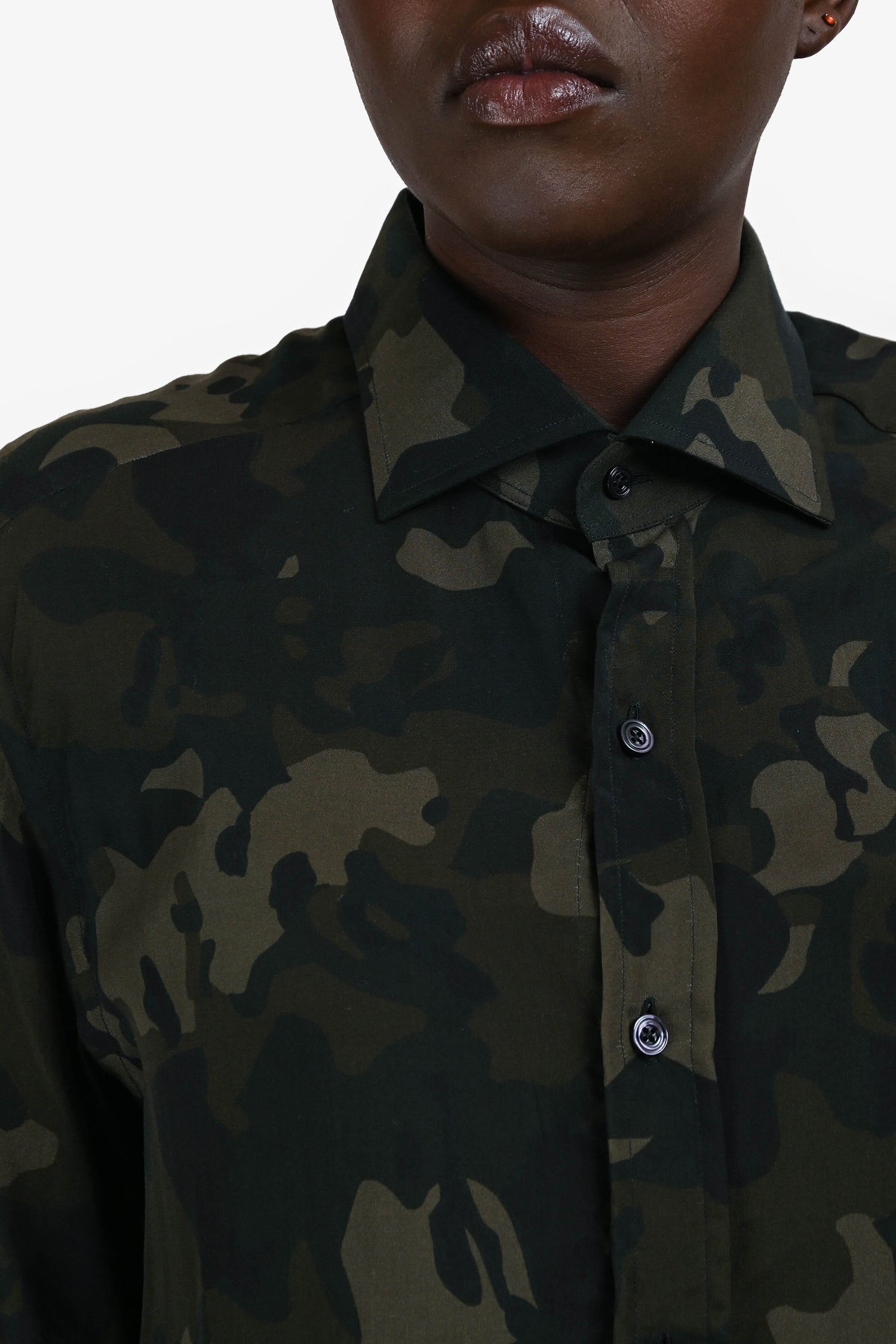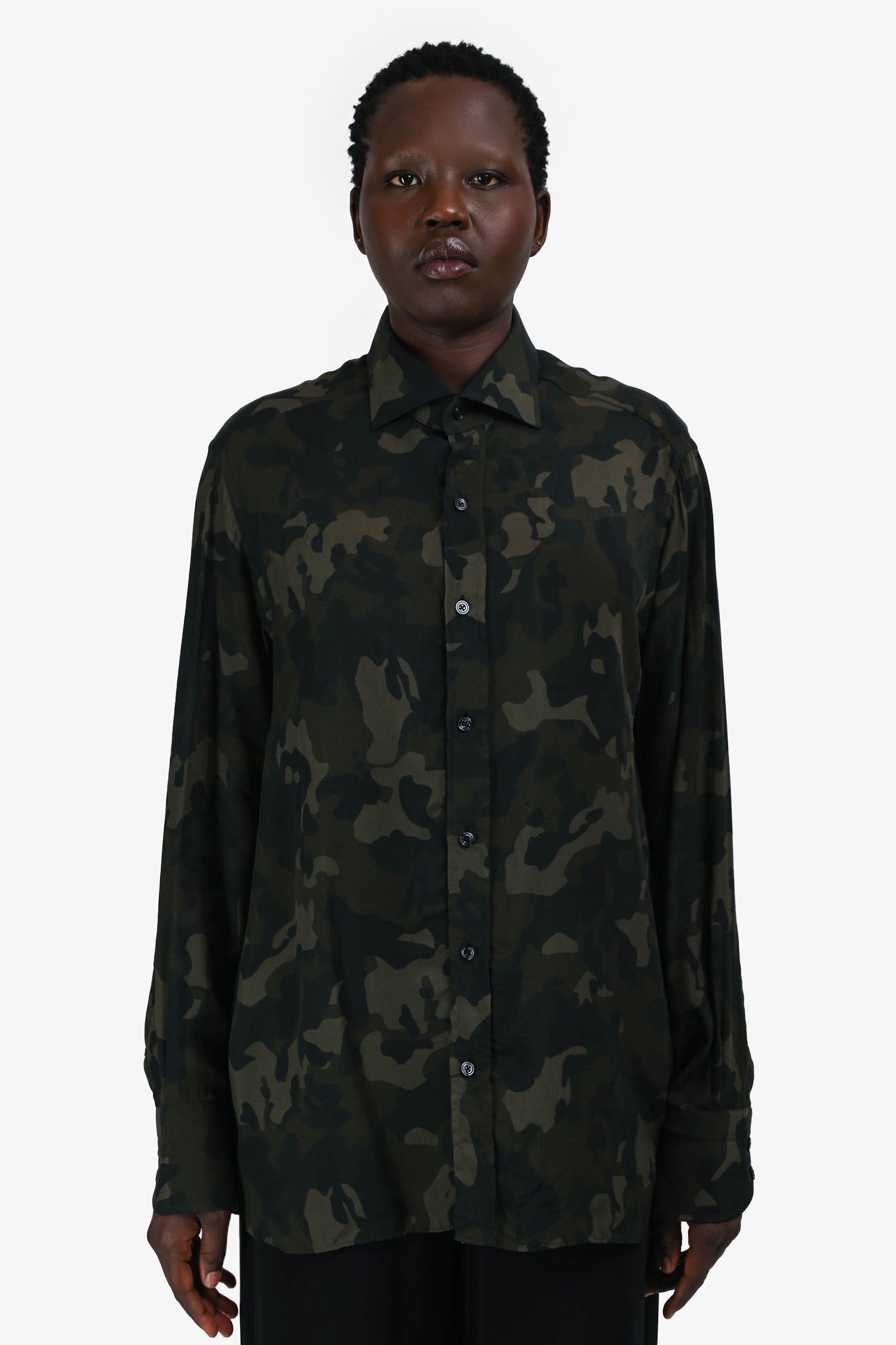Refresh availabilityTom Ford Green/Black Camo Button Down Collared Shirt. Front button-up closure. Button closure on the cuffs.