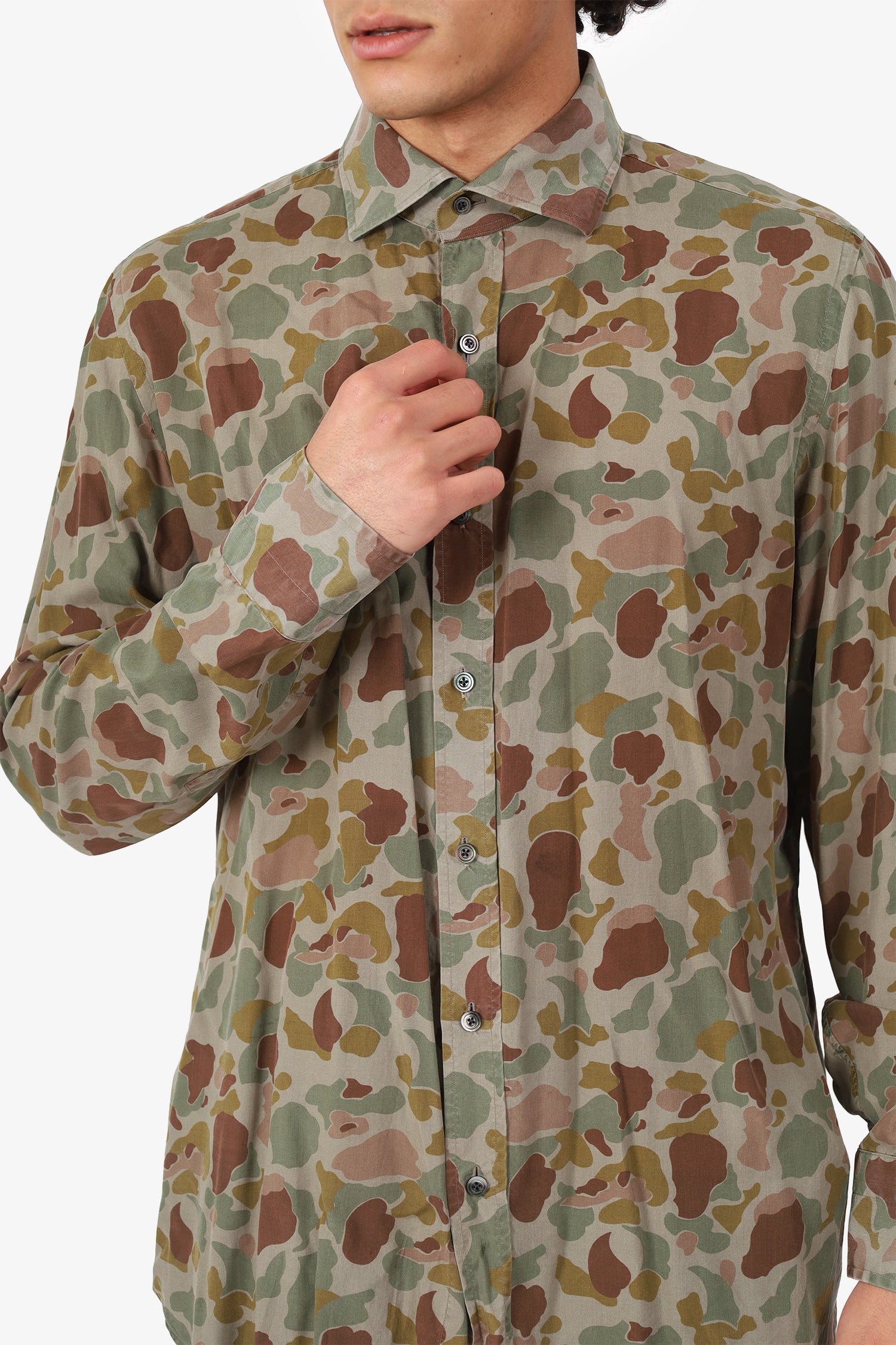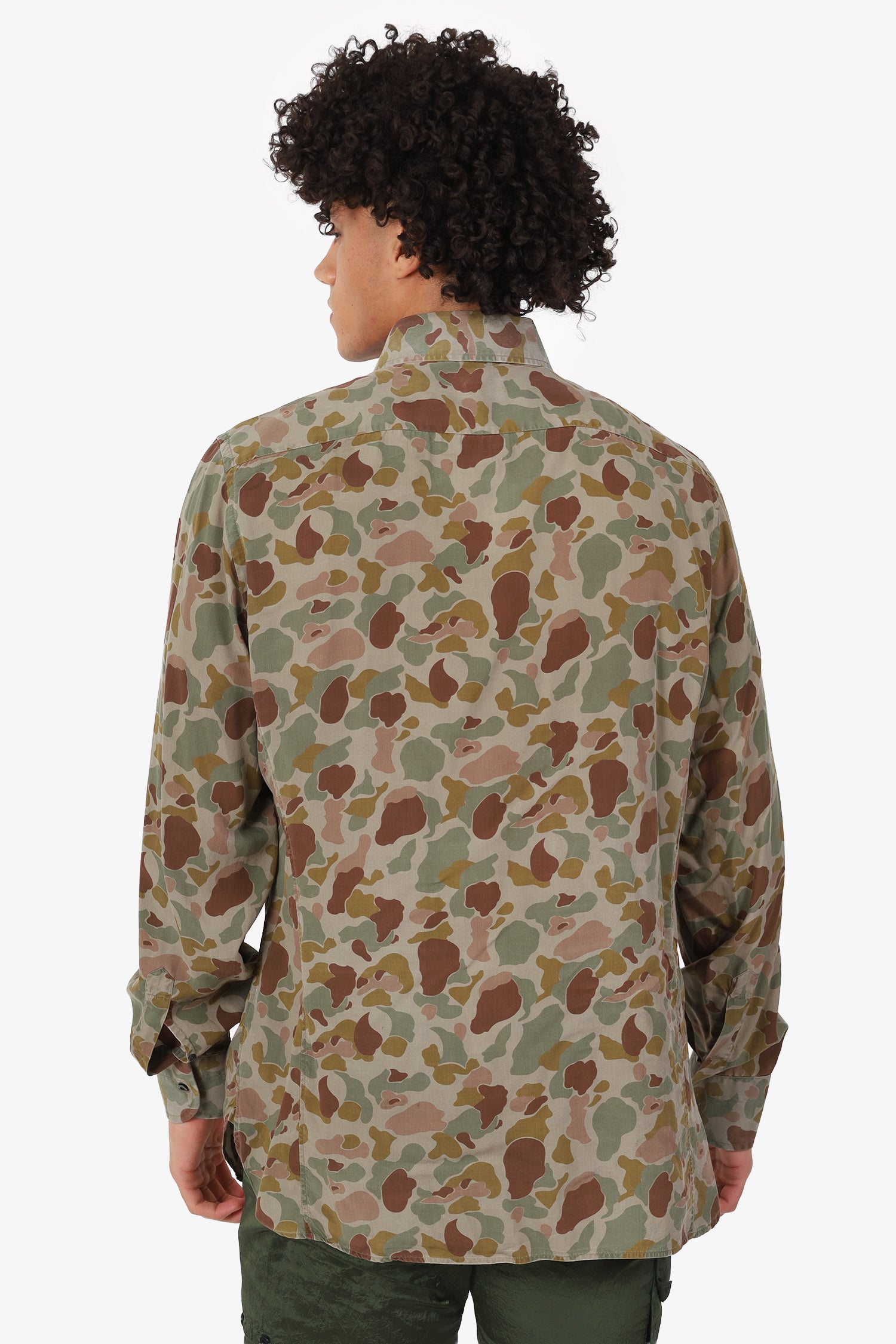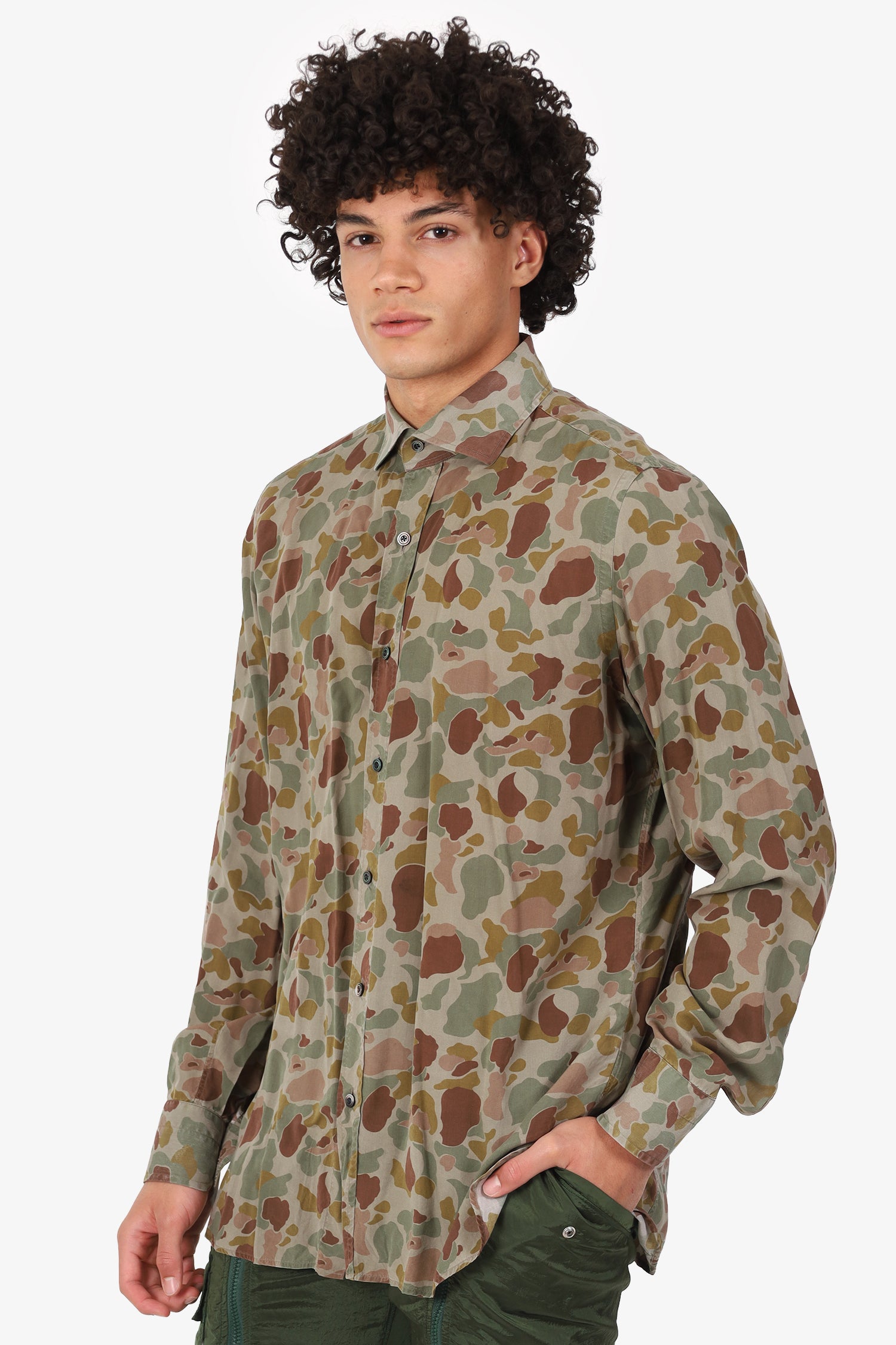 Refresh availabilityTom Ford Green Multicolour Camouflage Print Shirt. Pull-on. Collared neckline. Front button-up closure. Sleeve cuffs with button-up closure. Tonal stitching.