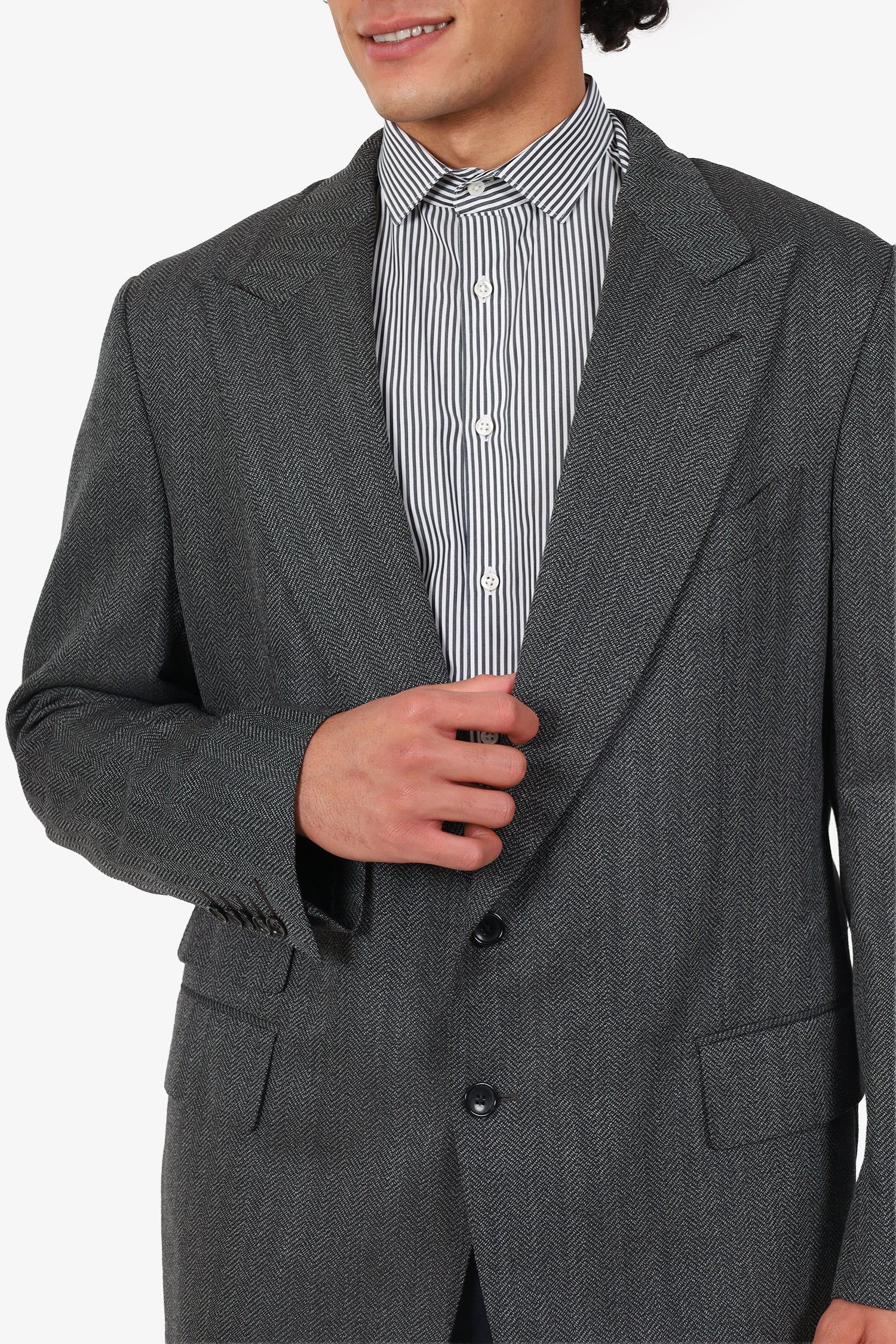 Refresh availabilityTom Ford Grey Wool Mohair Blend Blazer. Pull-on. Peal lapel. Front button-up closure. 3 front exterior pockets; 2 flap and 1 chest slip. Sleeve cuffs with button-up closure. Single rear vent. Padded shoulders. Lined interior. Tonal stitching.