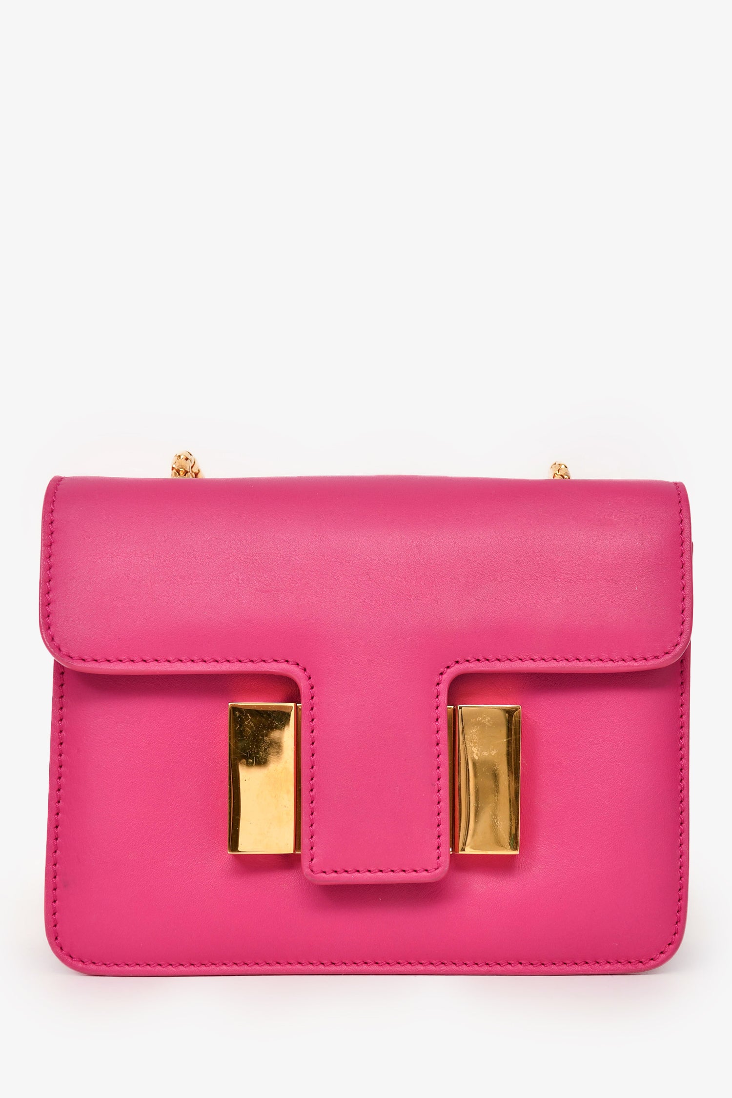 Refresh availabilityTom Ford Pink Leather Gold Hardware Crossbody Bag (As Is). Push-lock flap closure. Two open interior compartments with one wall slip pocket. One rear slip pocket. Gold-tone chain strap. Gold-tone hardware. Tonal stitching.
