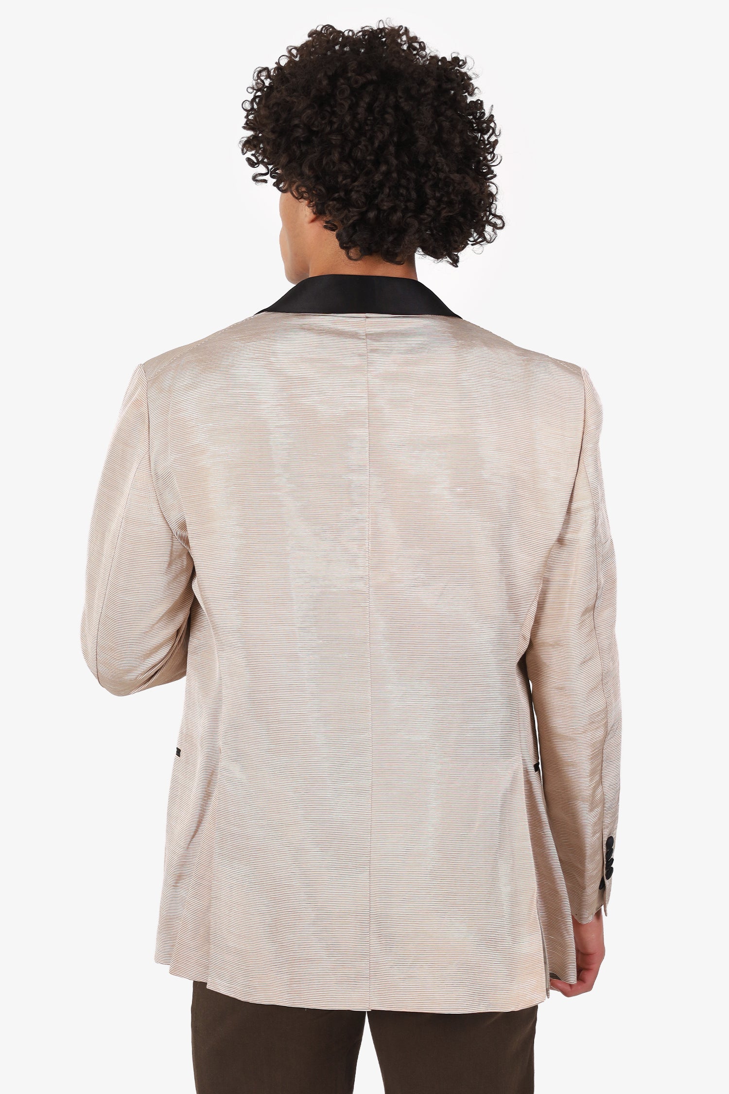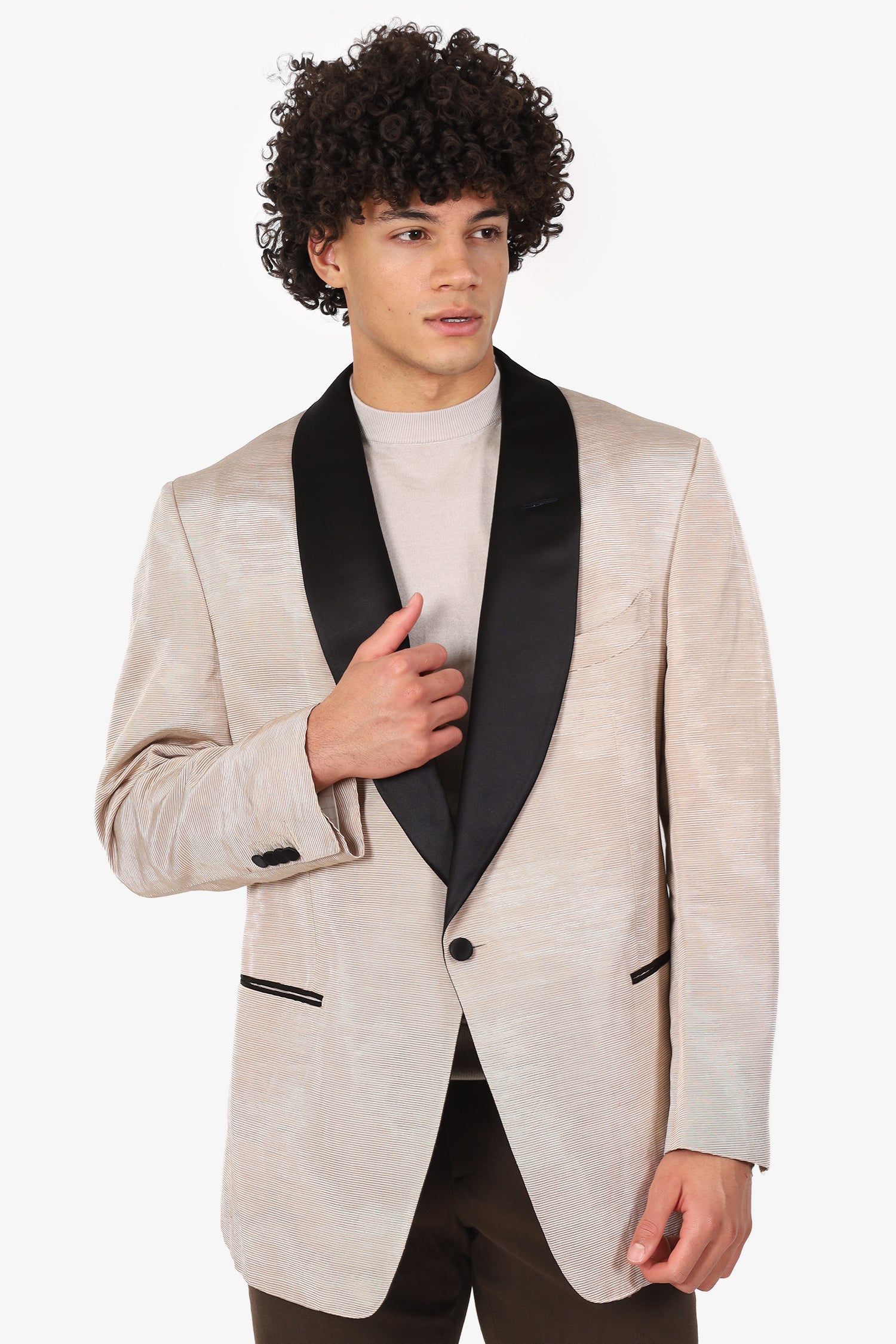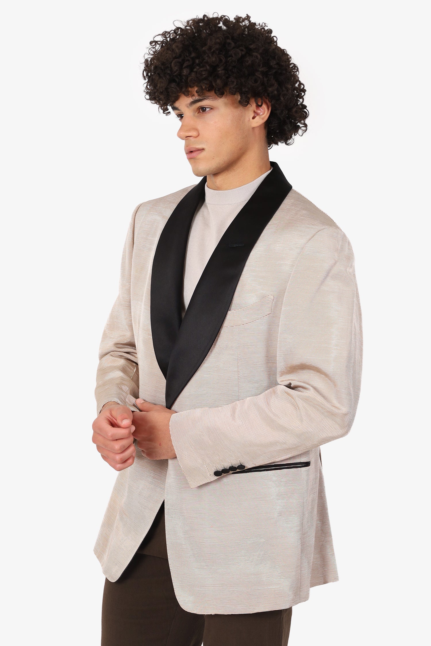 Refresh availabilityTom Ford Shiny Beige Cotton Blend Tuxedo Blazer. Pull-on. Shawl lapel. Front button-up closure. 3 front exterior slip pockets. Sleeve cuffs with button-up closure. Double rear vent. Padded shoulders. Lined interior. Silver-tone hardware. Tonal stitching.