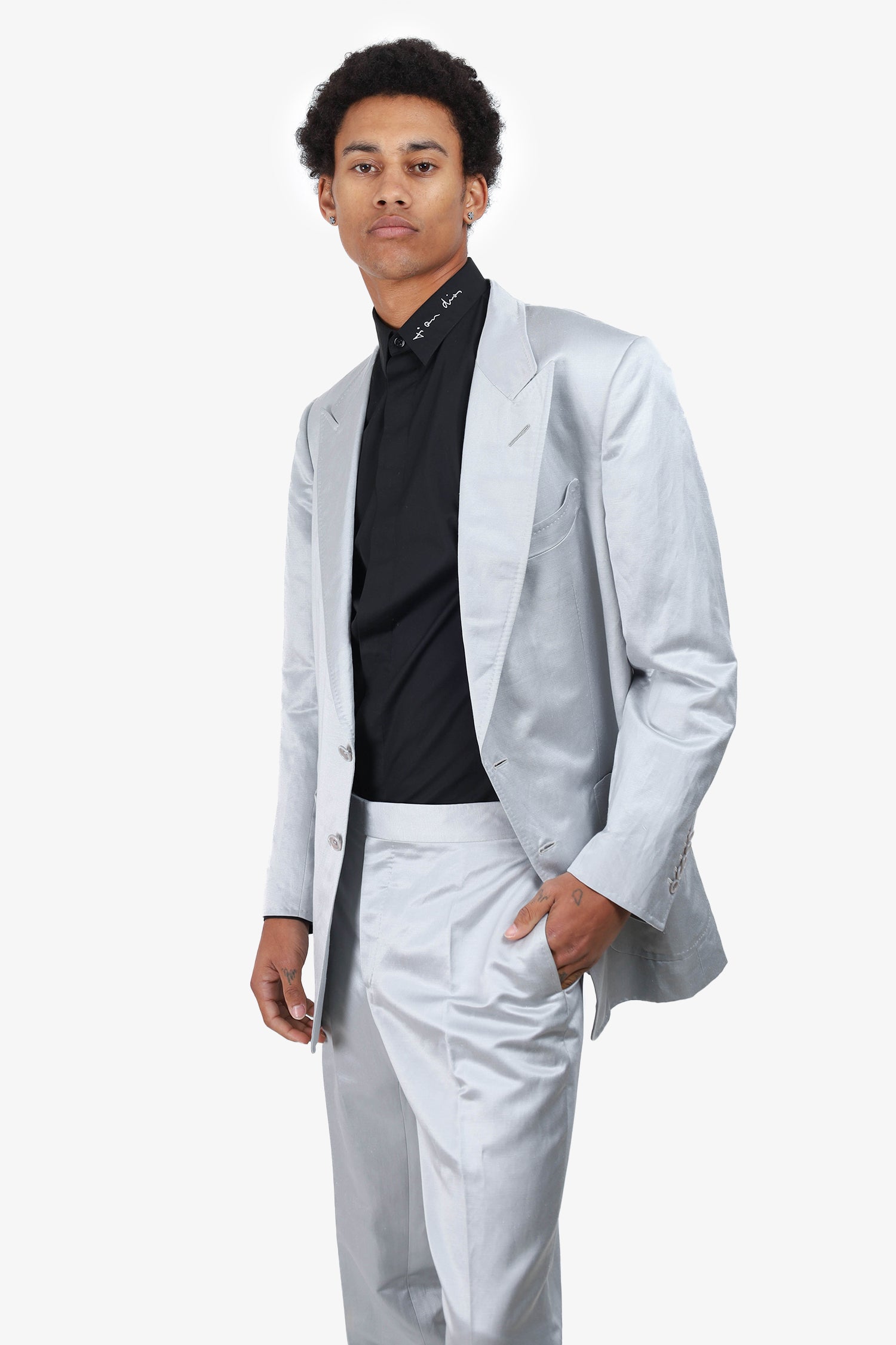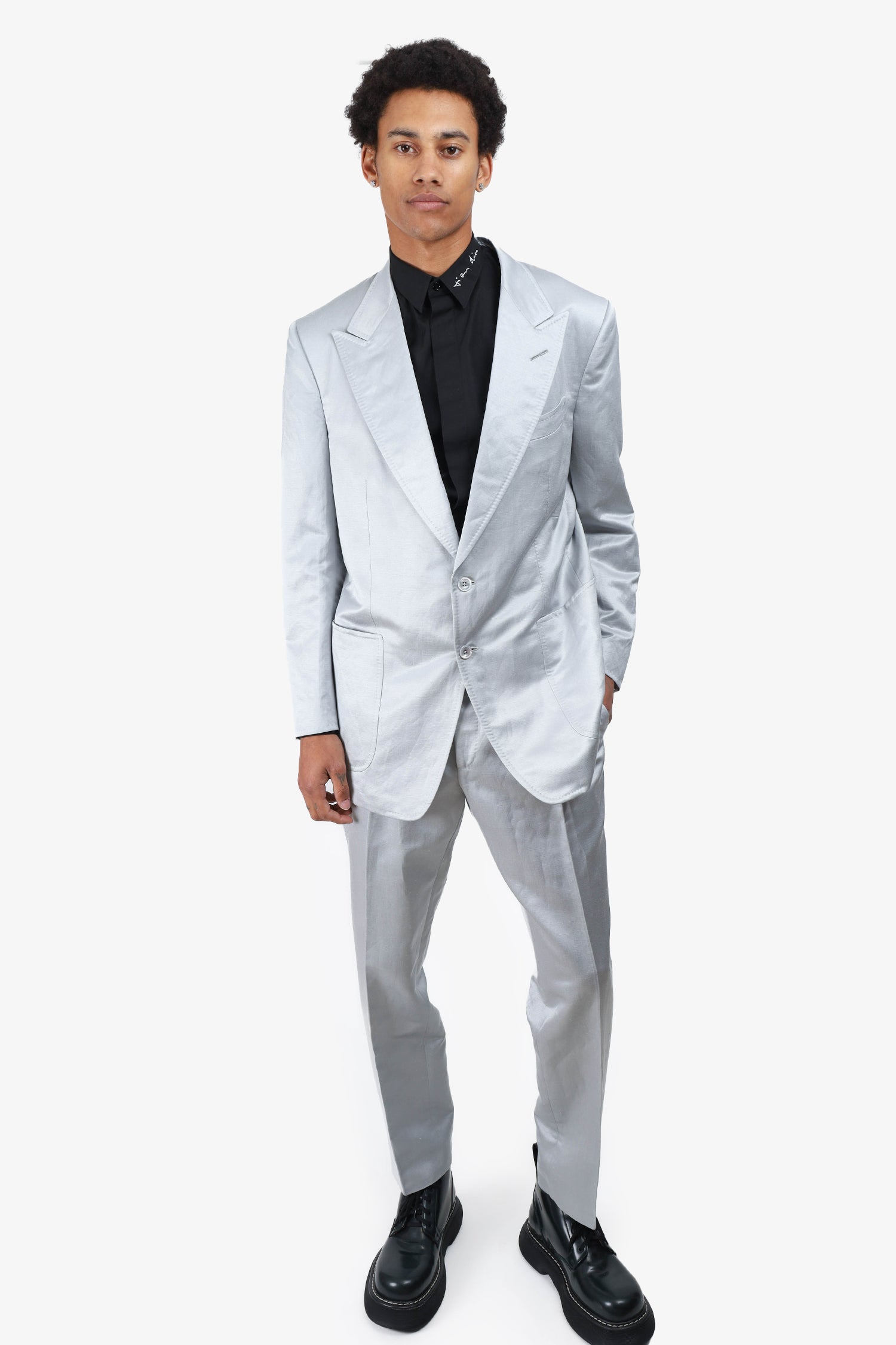 Refresh availabilityTom Ford Silver Linen/Silk 2-Piece Suit. Blazer; Peaked lapel. Front button-up closure. 3 front slip pockets. Button sleeve cuff closure. Rear vent. Partially lined. Tonal stitching. Pants; Front zip with double hook closure. 2 front slip pockets and 2 rear slip pockets with button. Adjustable strap detailing on sides of waist. Partially lined. Tonal stitching.