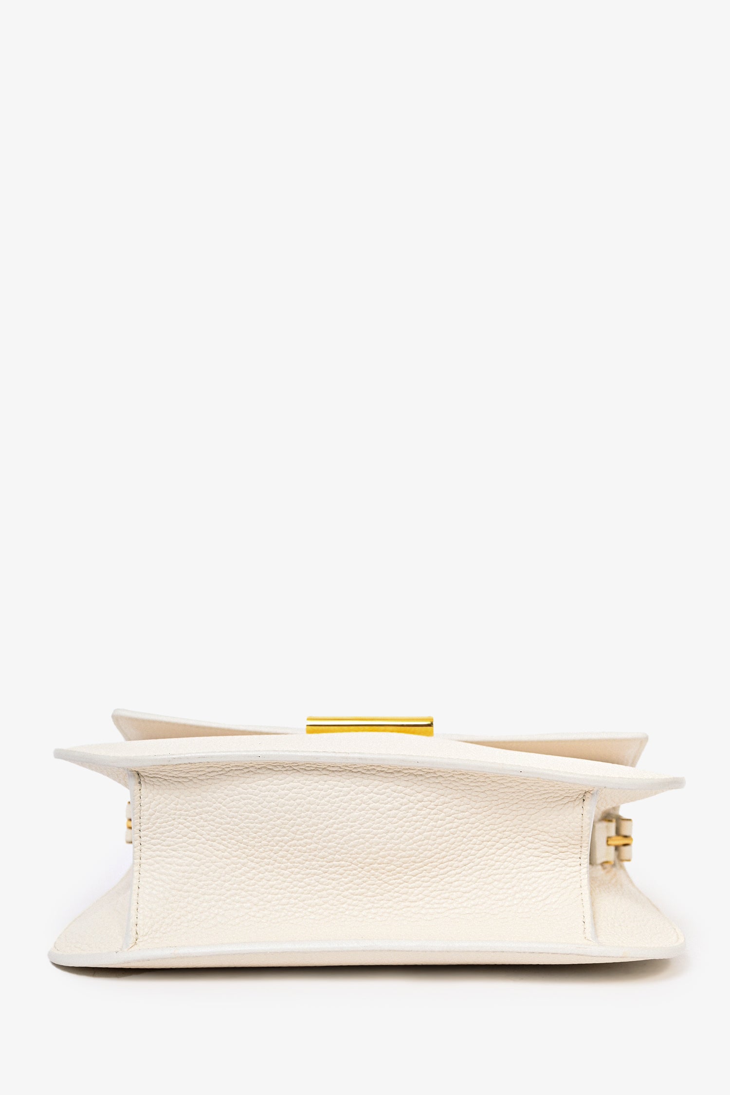 Tom Ford White Leather Large 'Tara' Crossbody Bag. Front fold-over flap with magnetic button closure. Cream textile interior lining. Single interior wall zip pocket. Adjustable strap. Gold-tone hardware. Outer rear slip pocket.