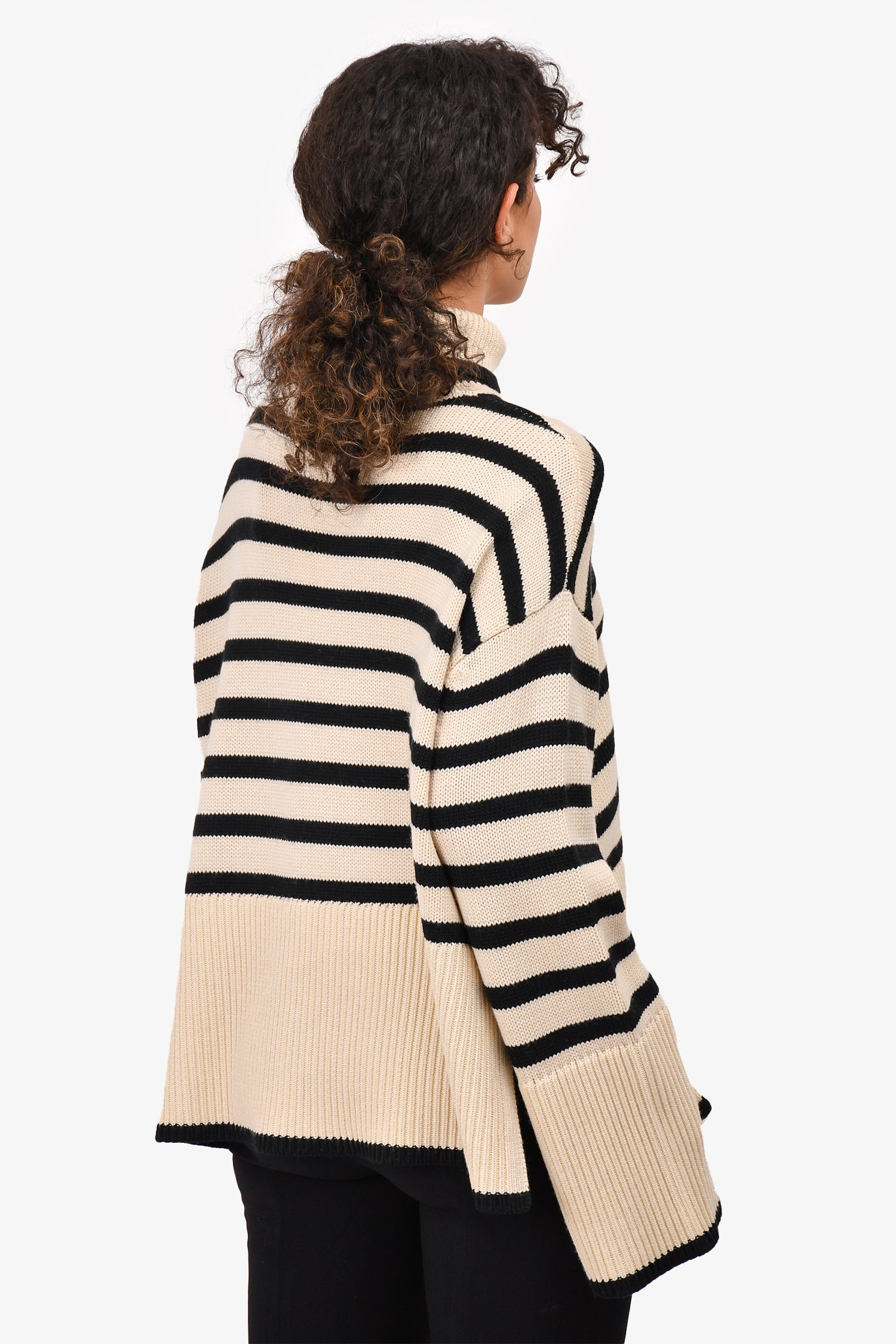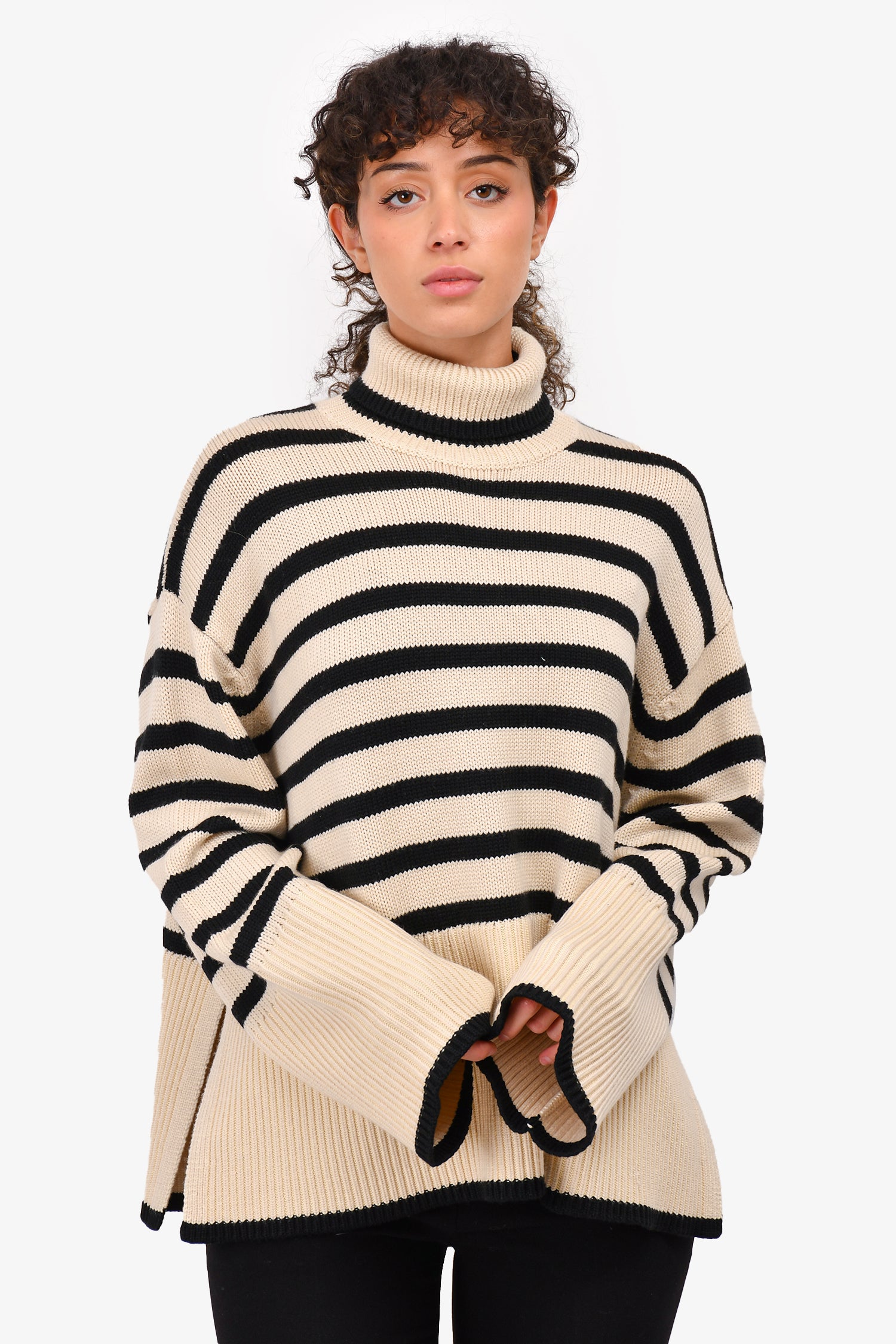 Refresh availabilityToteme Black/Cream Striped Wool Blend Turtleneck Sweater. Oversized fit. Ribbed throughout. Tonal stitching.