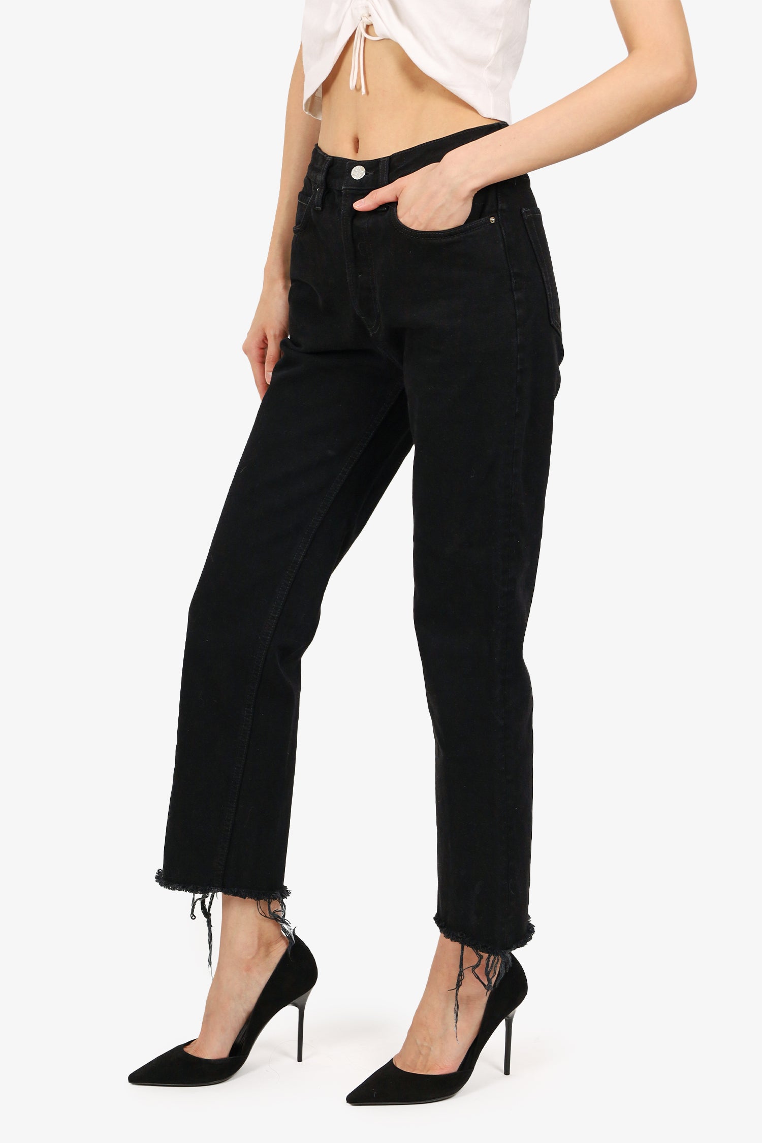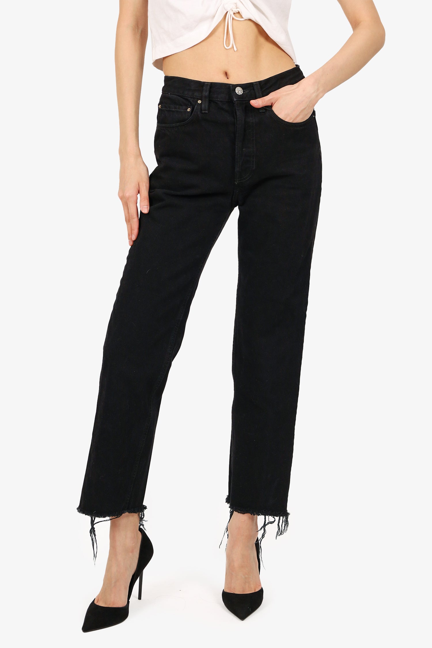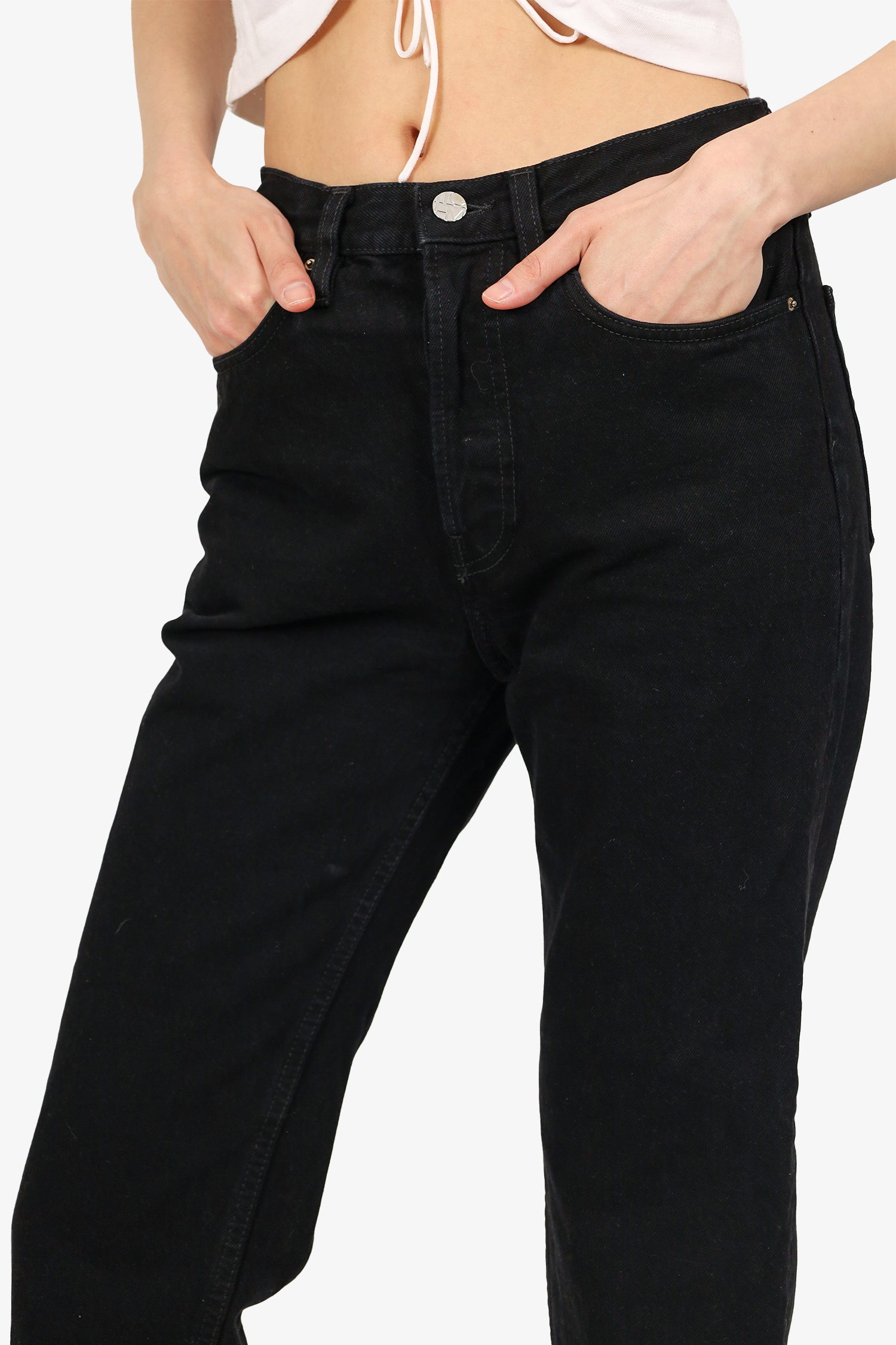 Refresh availabilityToteme Black Denim Straight Leg Jeans. Front button and zip closure. Front and rear slip pockets. Waist belt loops. Tonal stitching.