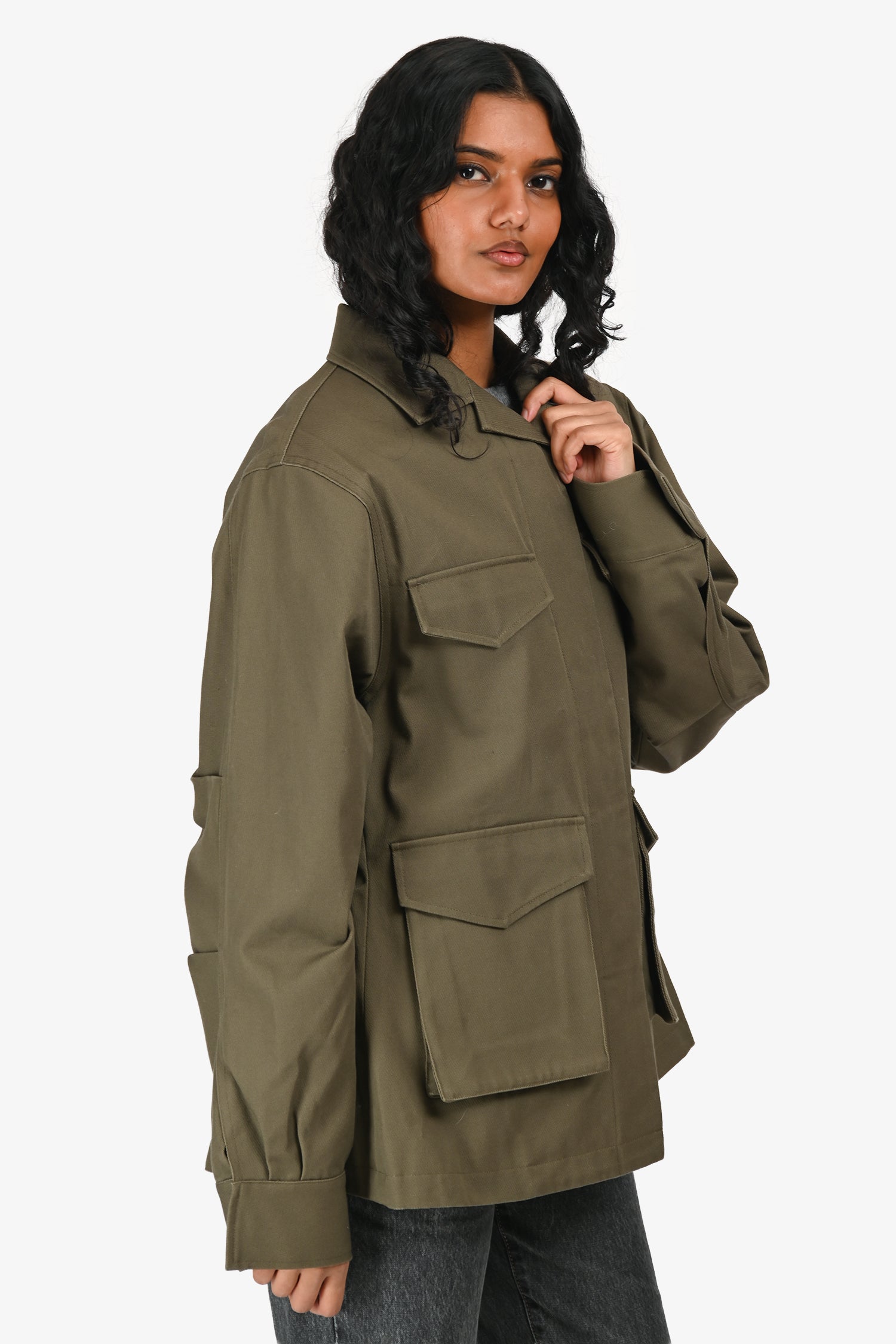 Refresh availabilityToteme Green Cotton Army Jacket. Slip-on. Pointed collar. Front button-up closure. 4 exterior pockets with fold-over flap closures. Sleeve cuffs with concealed button closure. Lined interior. Tonal stitching.