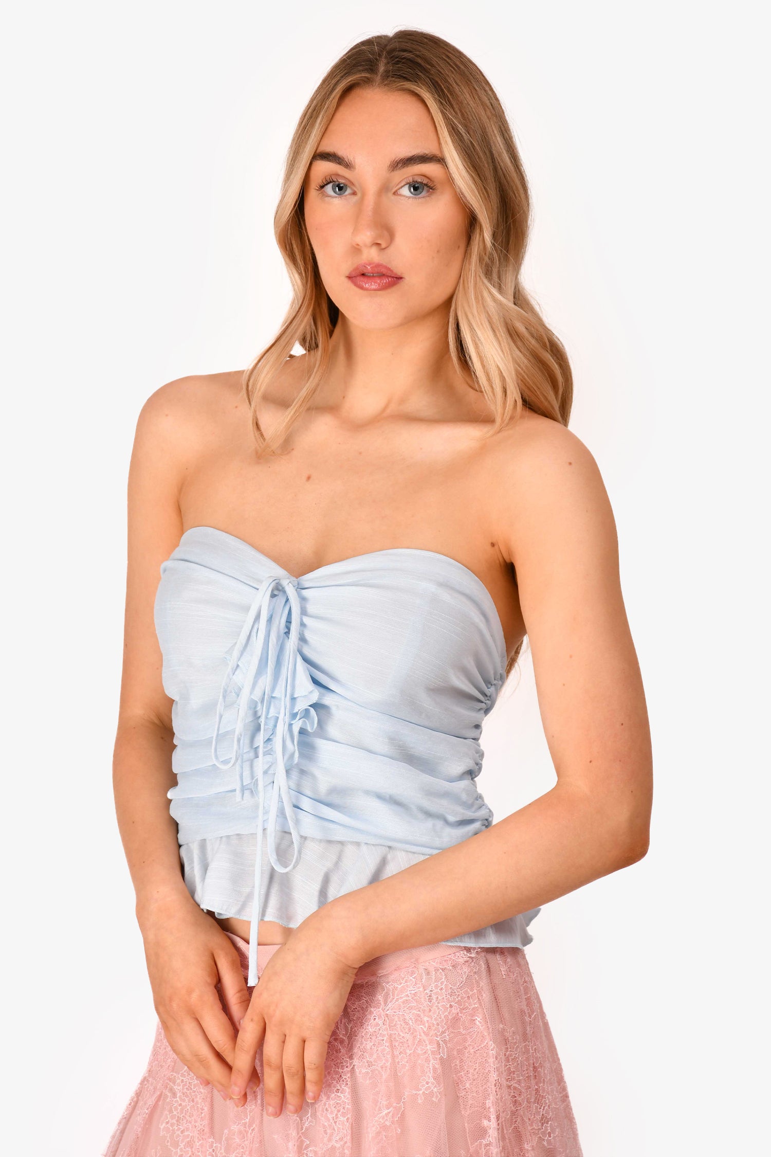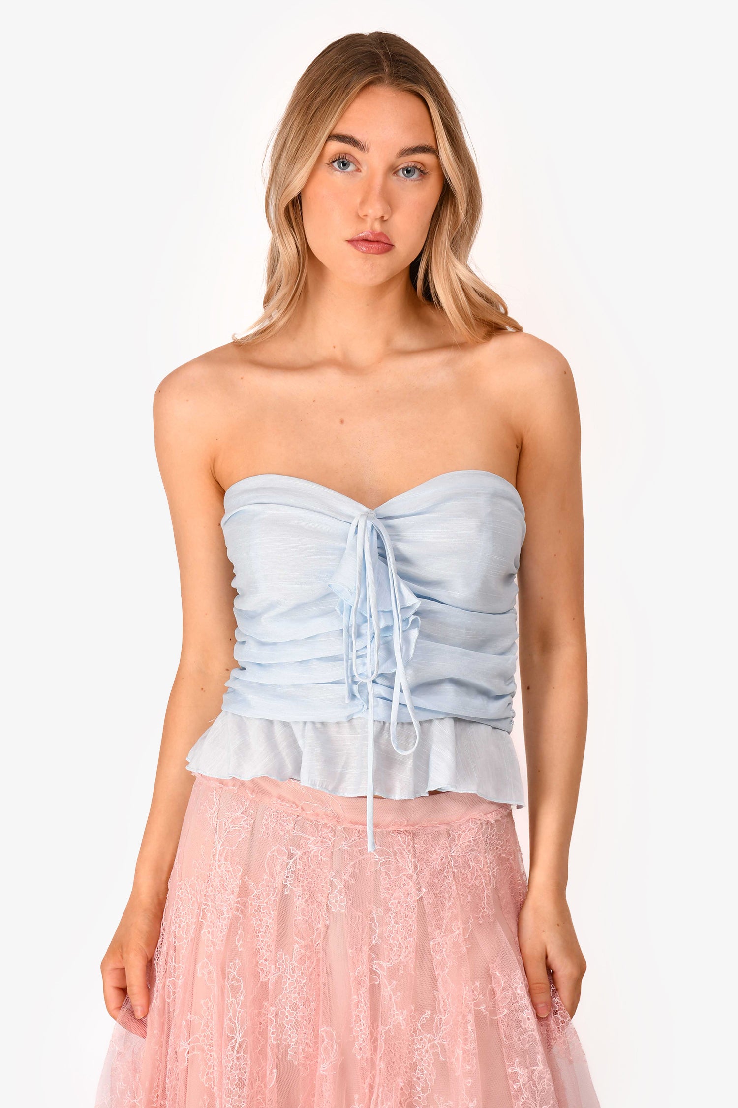 Refresh availabilityTularosa Blue Ruffled Strapless 'Shiloh' Top. Rear zip closure. Front tie-up detail. Ruffled hemline. Silver-toned hardware. Tonal stitching.