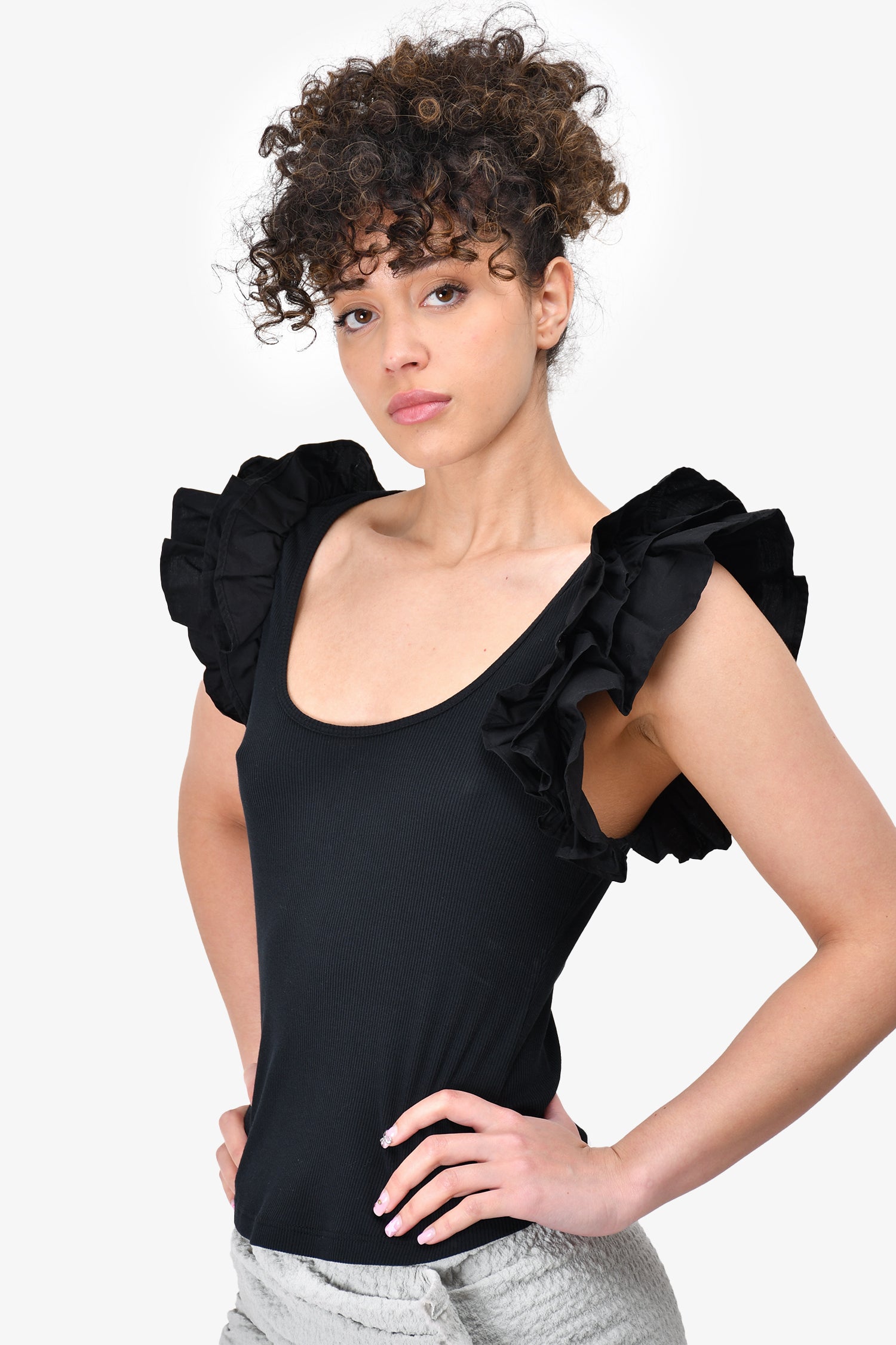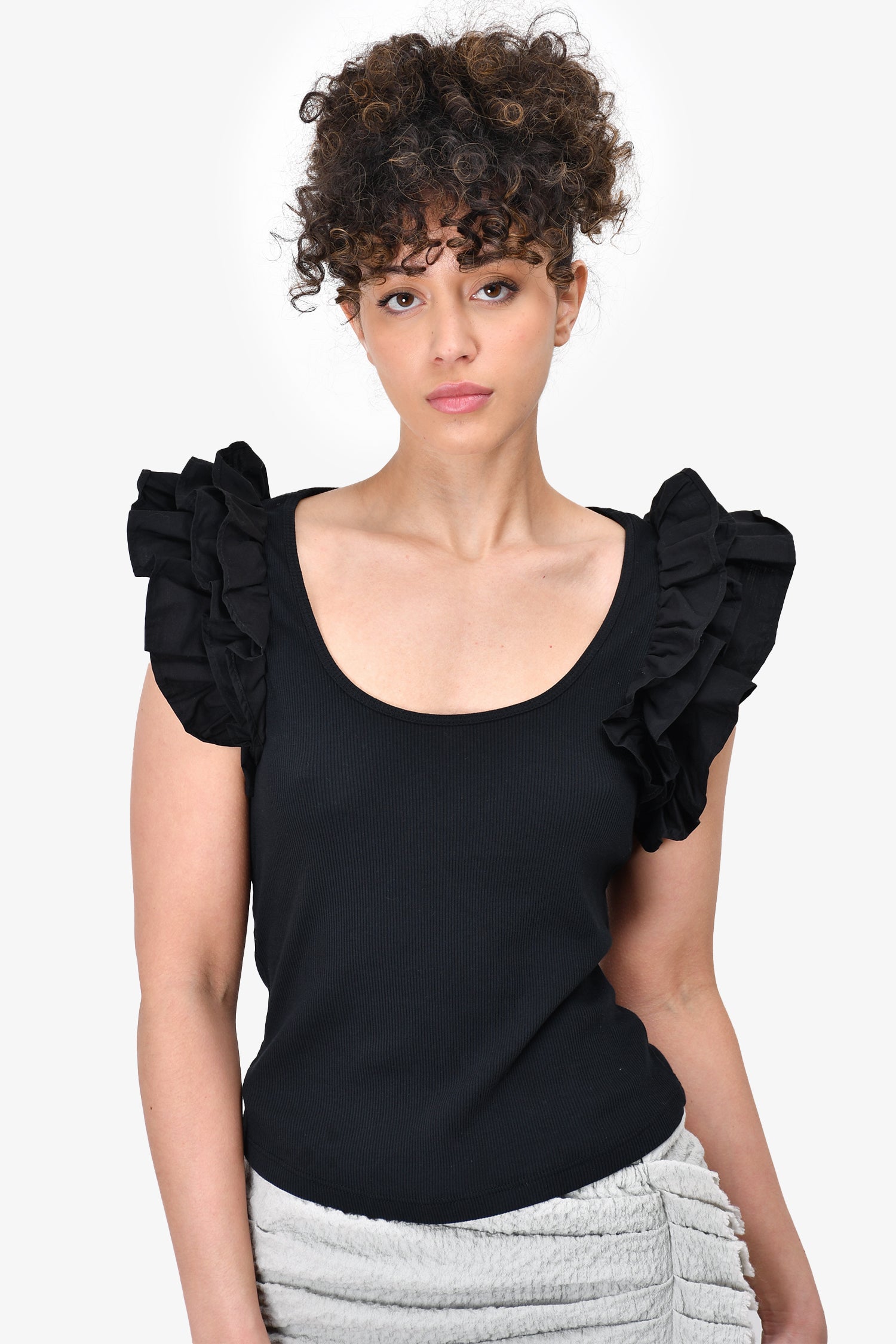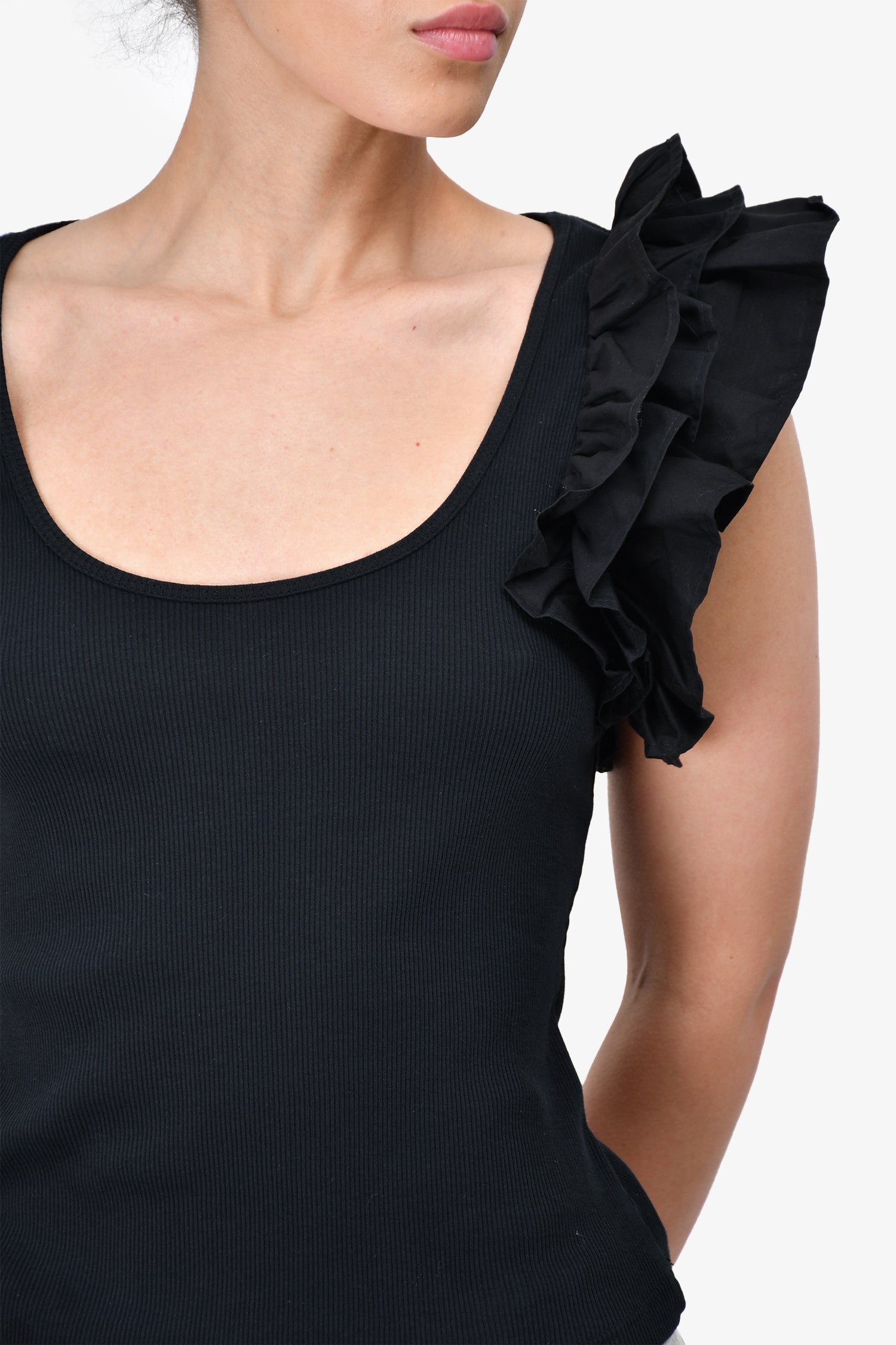 Refresh availabilityUlla Johnson Black Ruffle Shoulder Ribbed Tank Top. Low-cut round neck. Tonal stitching.