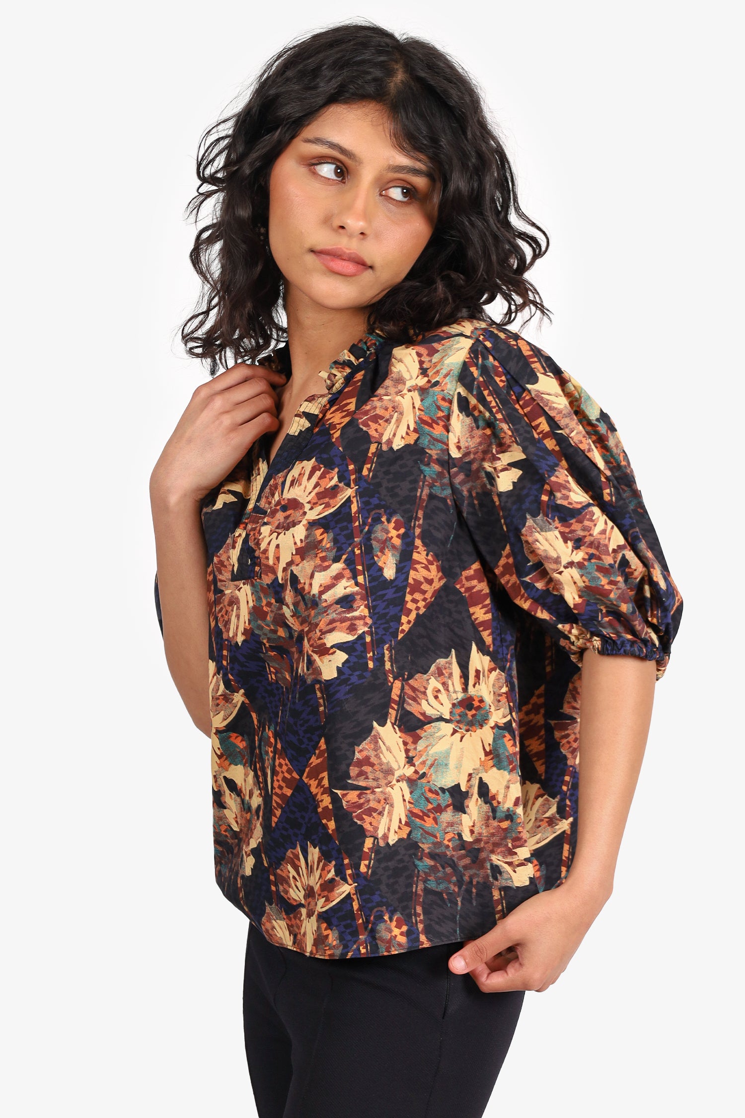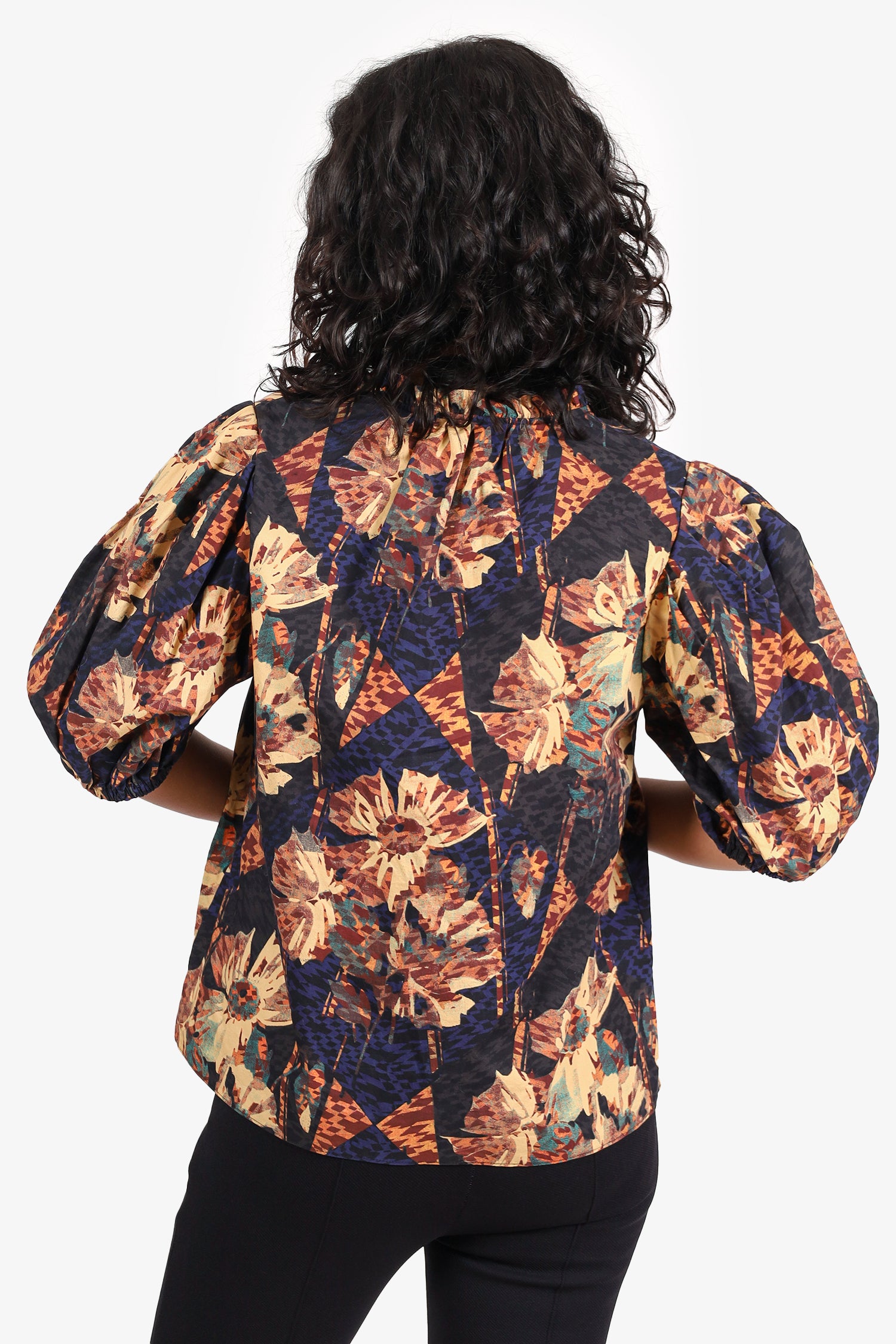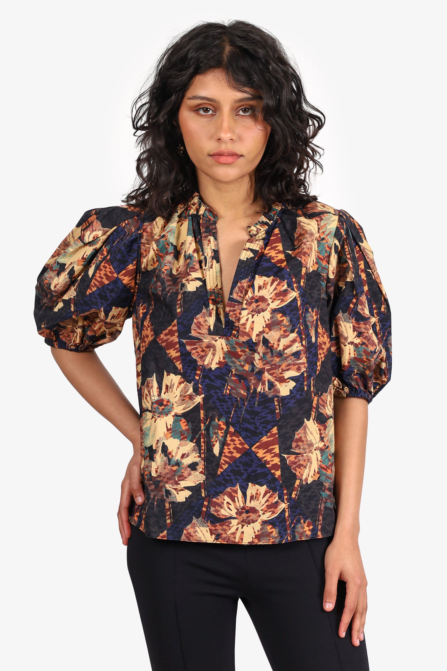 Refresh availabilityUlla Johnson Black/Yellow Floral Print Puff Sleeve Top. Pull-on. V-neckline. Elasticated sleeve cuffs. Tonal stitching.