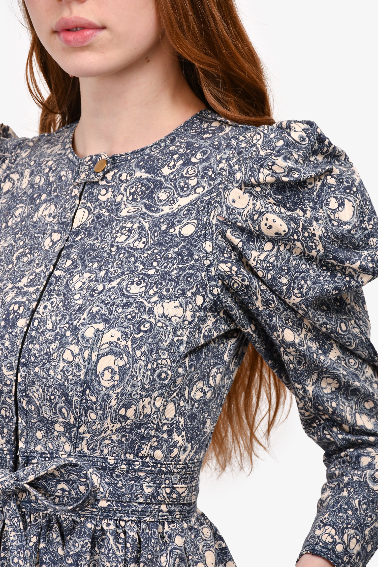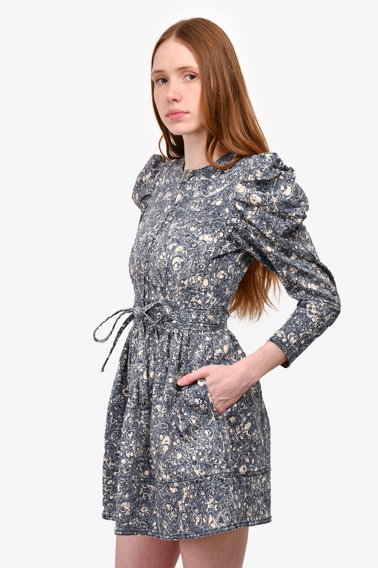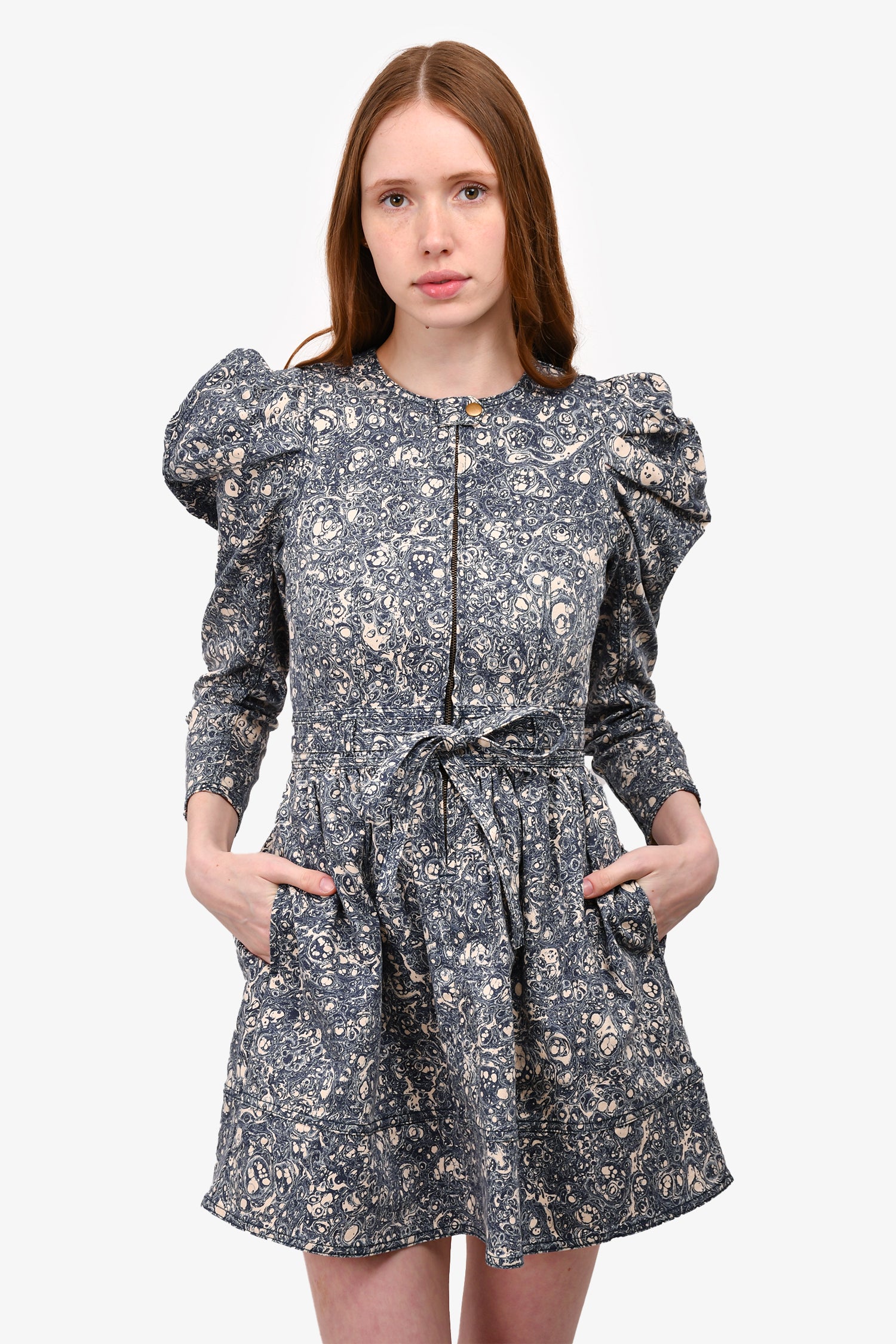 Refresh availabilityUlla Johnson Blue/Cream Printed Denim Puff Sleeve Belted Mini Dress. Zip-up front closure with snap-on button. Waist belt tie closure. Sleeves puffed at the shoulder. Two side pockets. Gold-tone hardware. Tonal stitching.