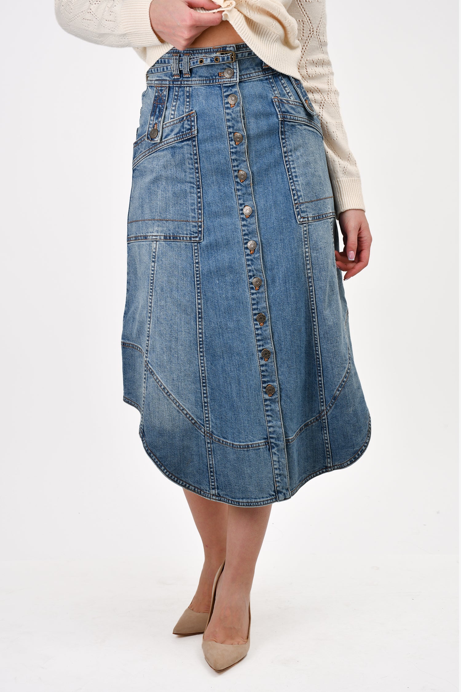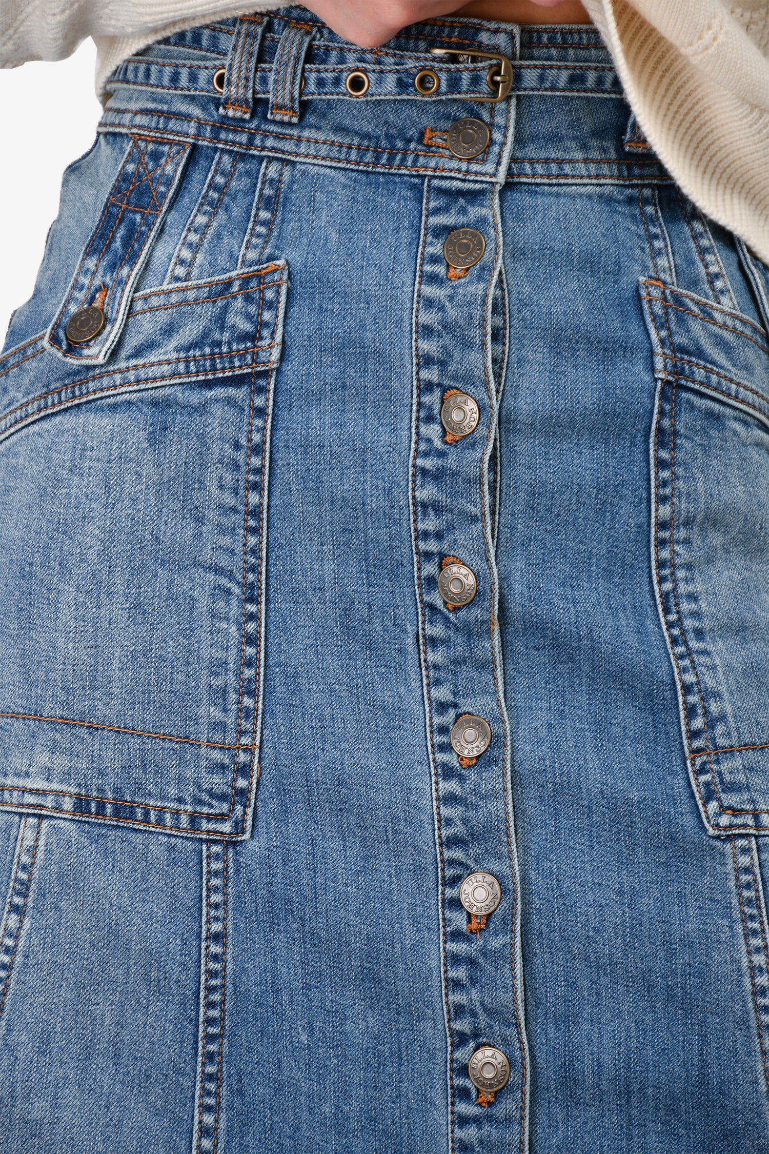 Refresh availabilityUlla Johnson Blue Medium Wash Belted Skirt. Front button-up closure. Front and rear pockets. Waist belt loops with waist belt. Unlined.