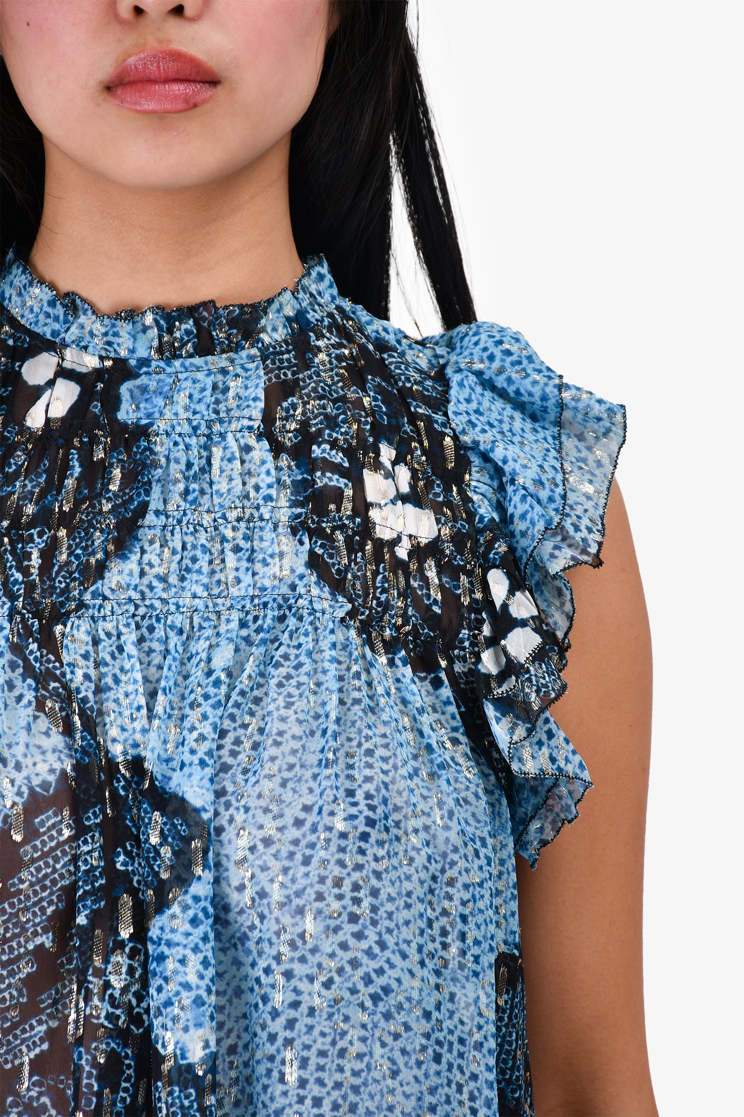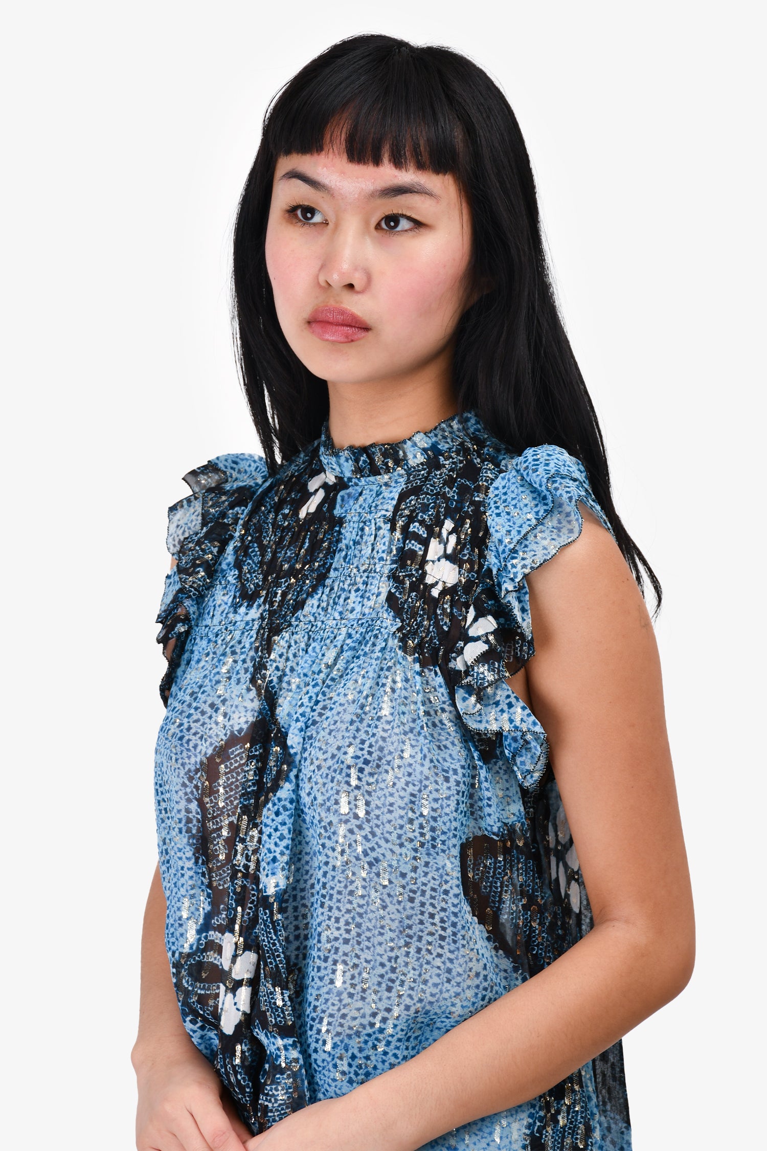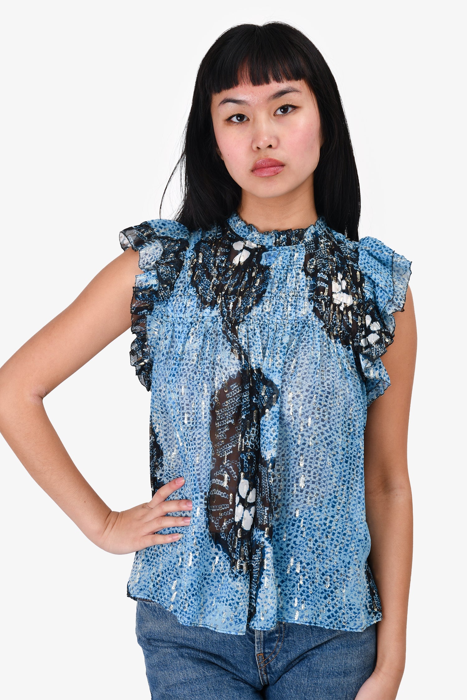 Refresh availabilityUlla Johnson Blue/Metallic Silk Sheer Sleeveless Top. Back-of-neck snap-button closure. Tonal stitching.