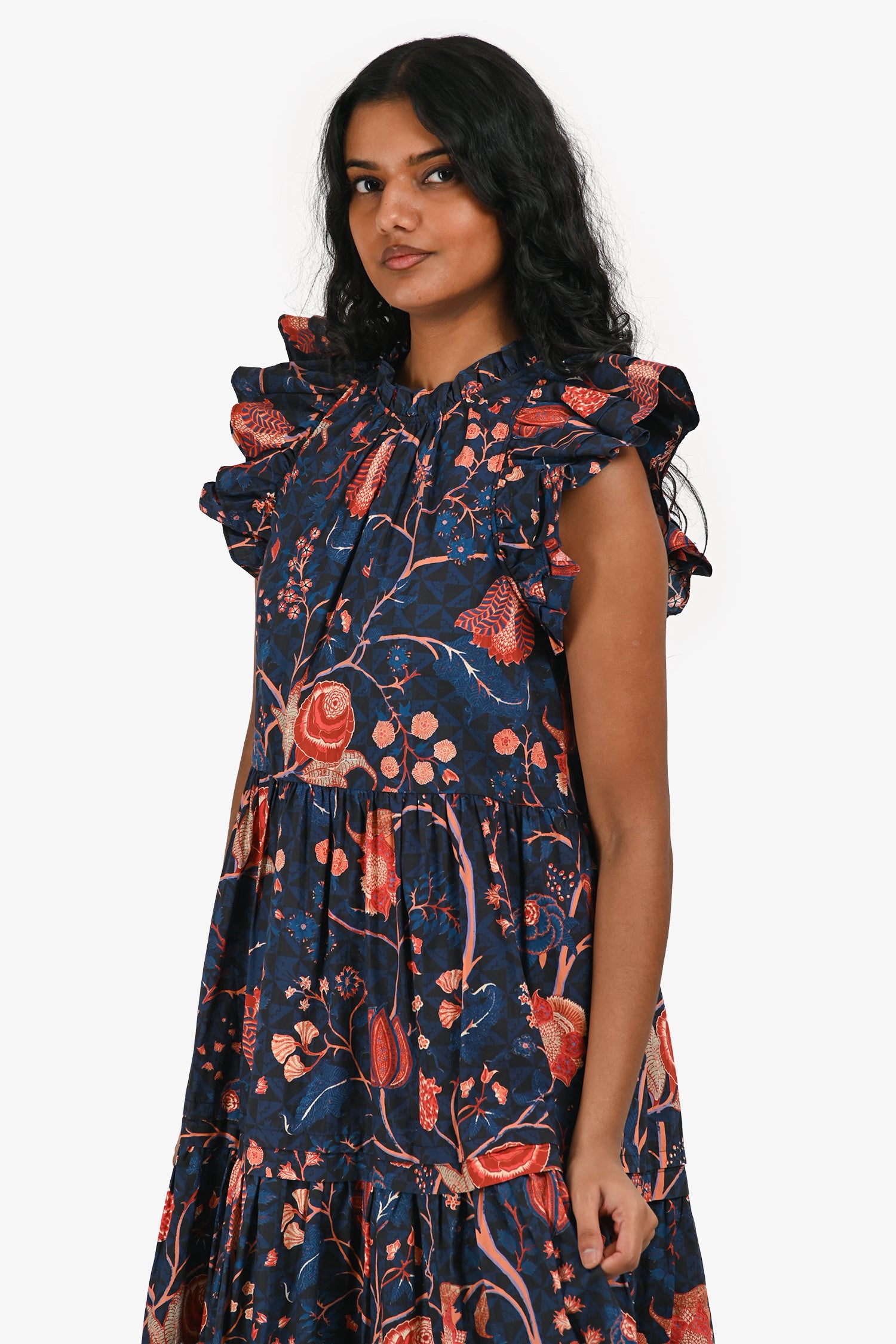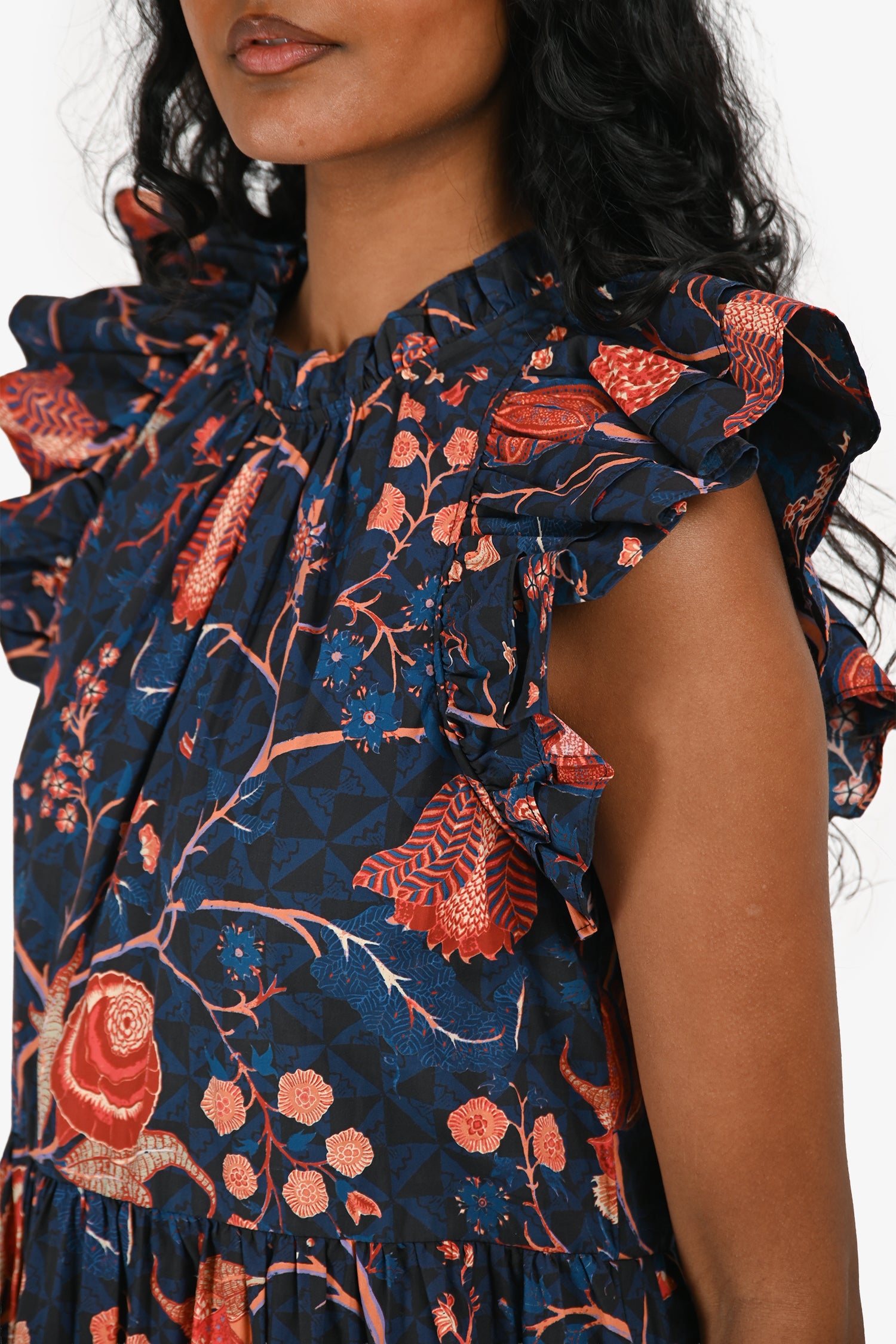 Refresh availabilityUlla Johnson Blue/Orange Floral Short Sleeve Mini Dress. Pull-on. Round neckline. Rear bottom-closure. Ruffle sleeves and neckline. Two side slip pockets. Tonal stitching.